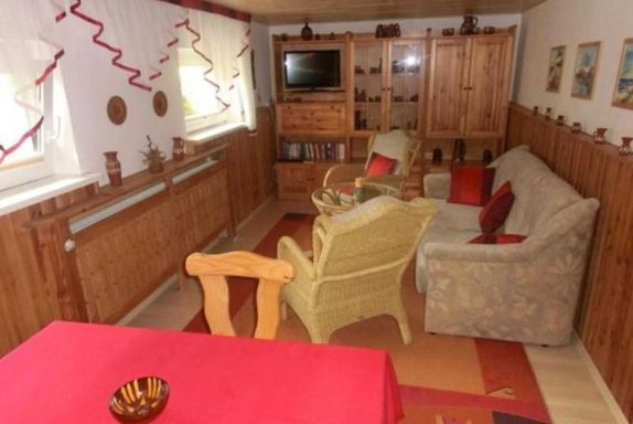 Die 2-Zimmer-Ferienwohnung befindet sich im Souterrain des Hauses ( Südseite ). Dazu gehört ein Duschbad sowie eine Küche. Im Wohnzimmer befindet sich der Essbereich.Das Schlafzimmer ist mit einem Doppelbett ausgestattet. Das Doppelbett kann in zwei Einzelbetten umgewandelt werden.