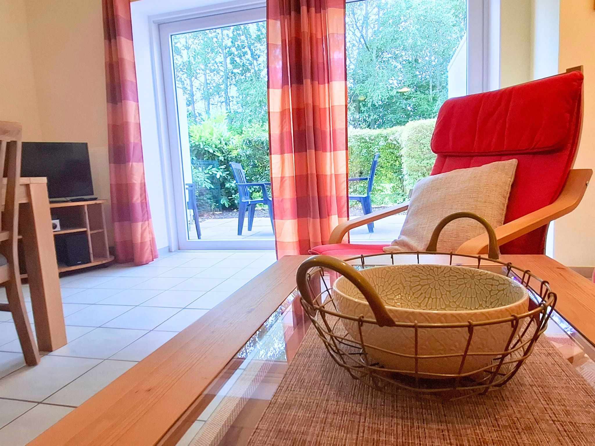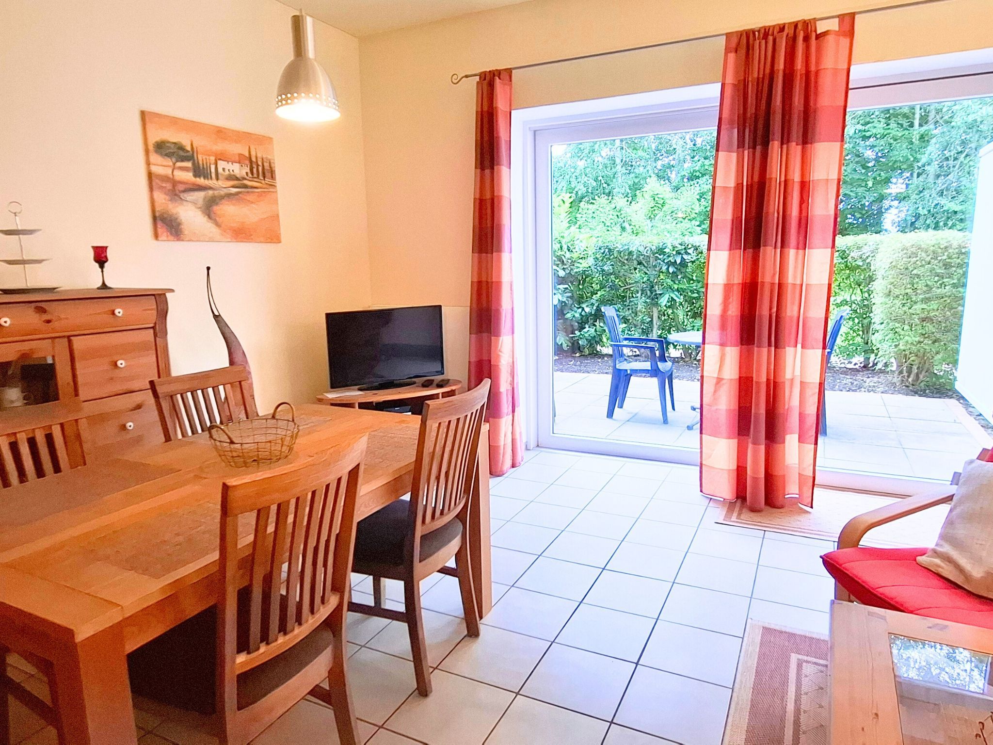 Die 2-Zimmer-Ferienwohnung mit ca. 63 m² Wohnfläche ist aufgeteilt in: Wohnzimmer mit Schlafcouch (1,40 breit) und Essecke; Schlafzimmer mit Doppelbett und Kinderreisebett; Küchenzeile mit Backofen, Geschirrspüler und Mikrowelle; Wanne/Dusche/WC; möblierte Terrasse; kostenfreies WLAN; PKW-Stellplatz; abschließbarer Fahrradraum. Nichtraucher!