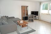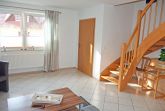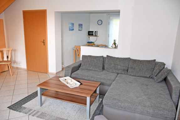 Im Erdgeschoss betritt man die Appartements über einen Flur mit Garderobe. Im großen Wohnraum befinden sich eine Couch mit Sessel und Tisch, Schrank, Flachbild-TV und eine Musikanlage.