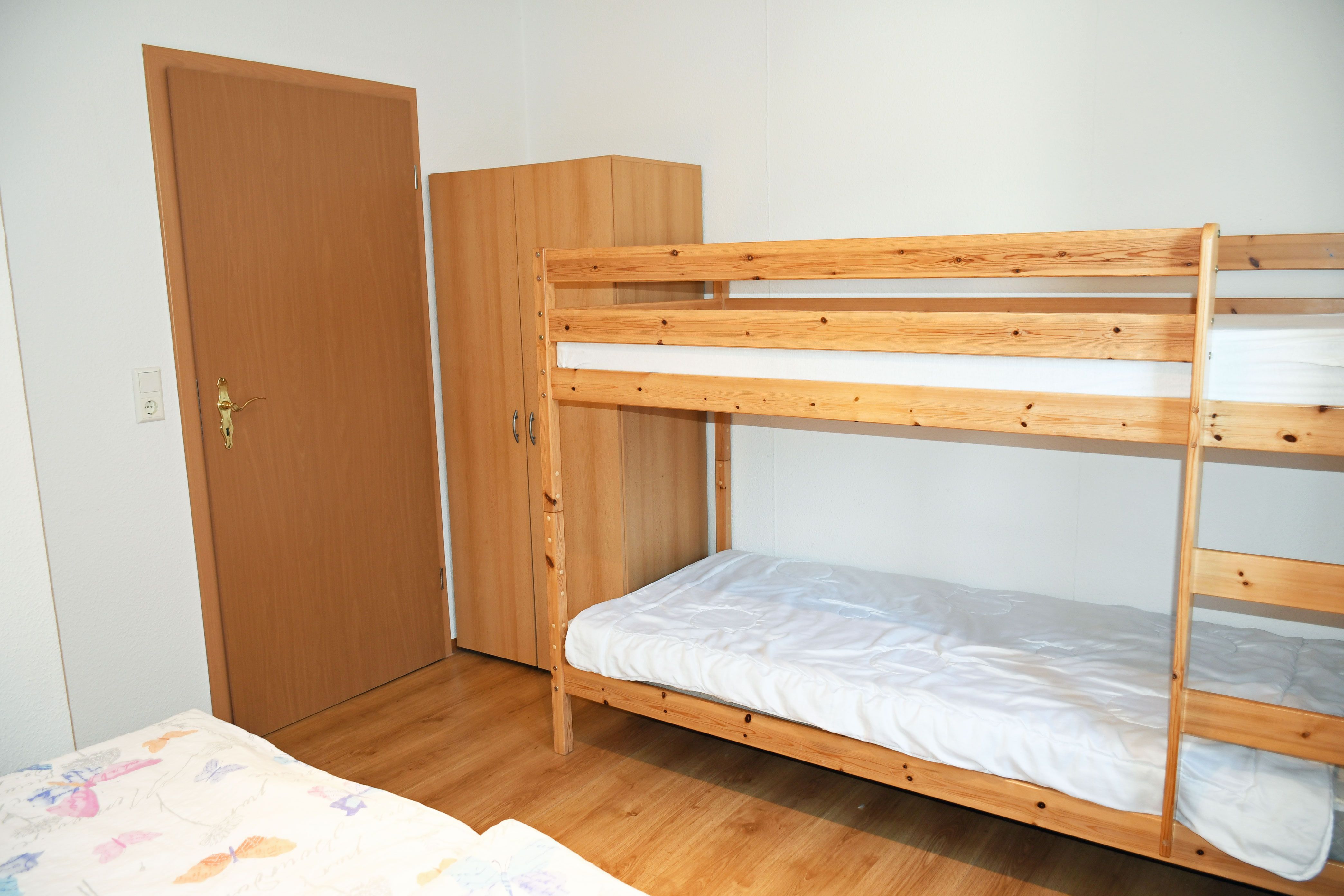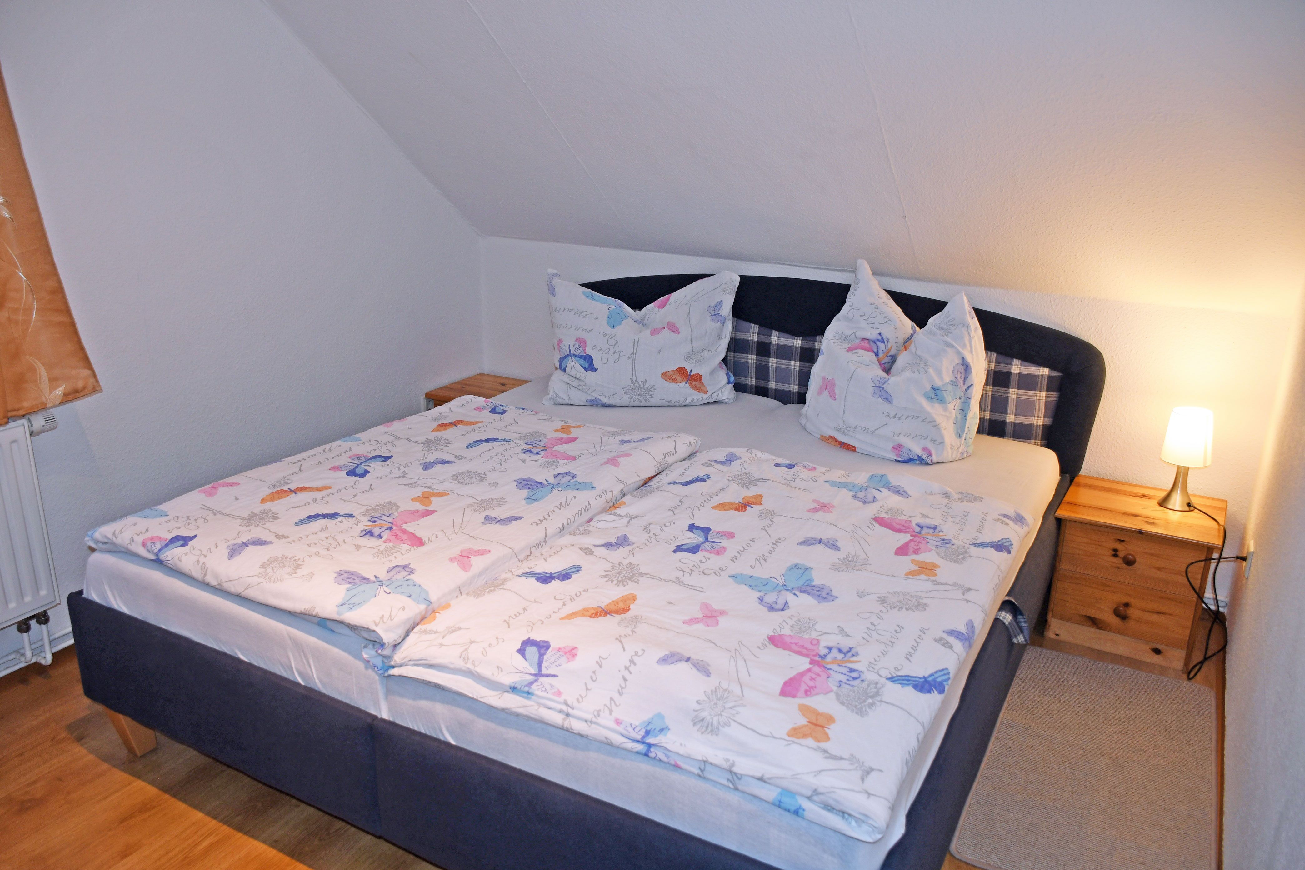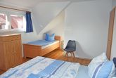 Über eine Holztreppe gelangt man in das Obergeschoss mit zwei getrennten Schlafzimmern. Diese sind jeweils mit bequemen Doppelbetten mit Nachttischen und Leselampen sowie Ablageschränken ausgestattet. Im 2. Schlafzimmer steht ein zusätzliches Etagenbett.