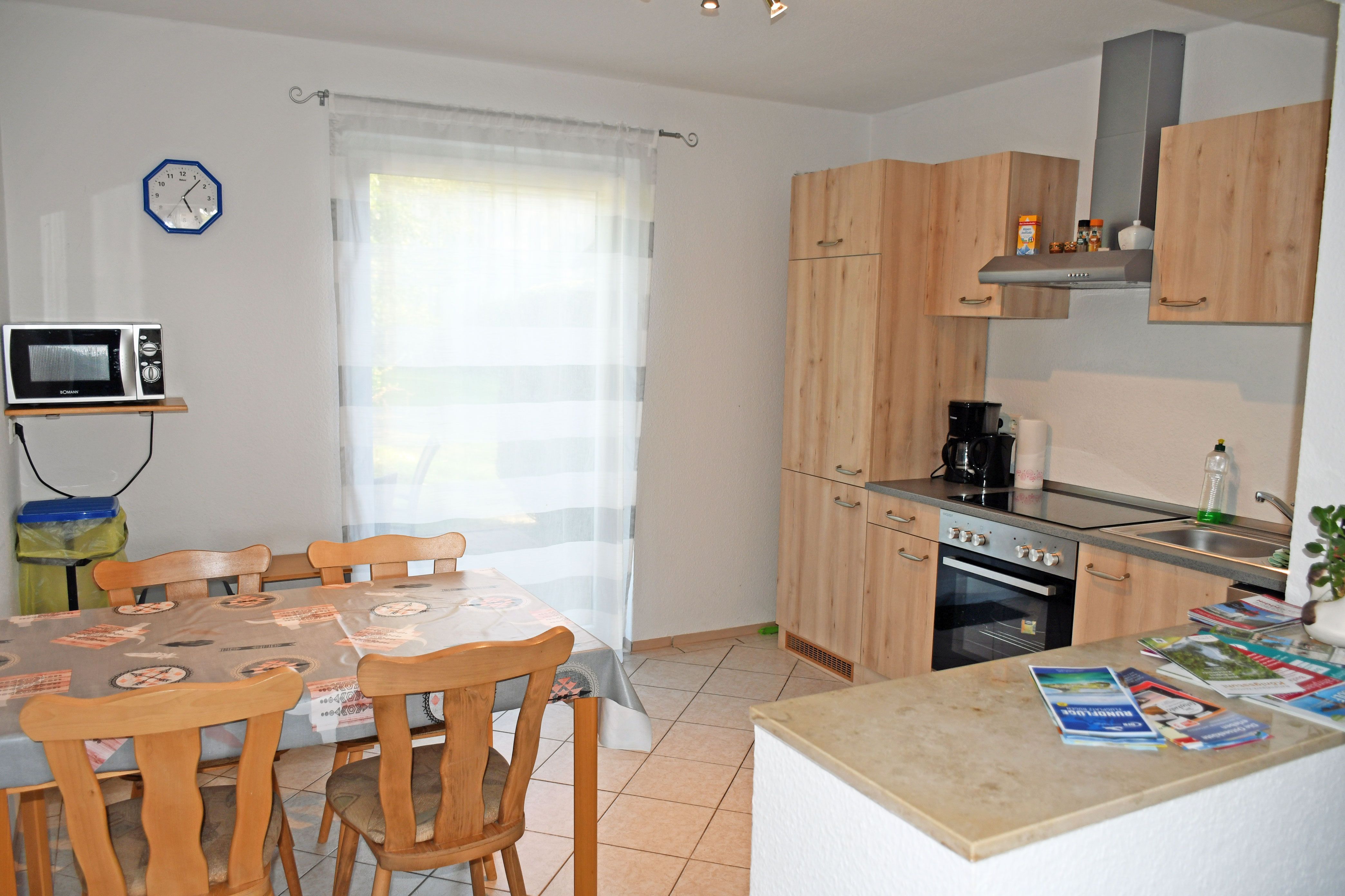 Der separate große Küchenbereich bietet einen Esstisch mit Stühlen und eine Küchenzeile. Diese ist mit einem Backofen, Herd mit Abzugshaube, Spülmaschine, Wasserkocher, Kaffeemaschine, Mikrowelle, Toaster, Wasserkocher und Kühlschrank komplett ausgestattet.