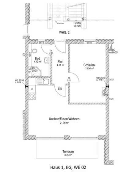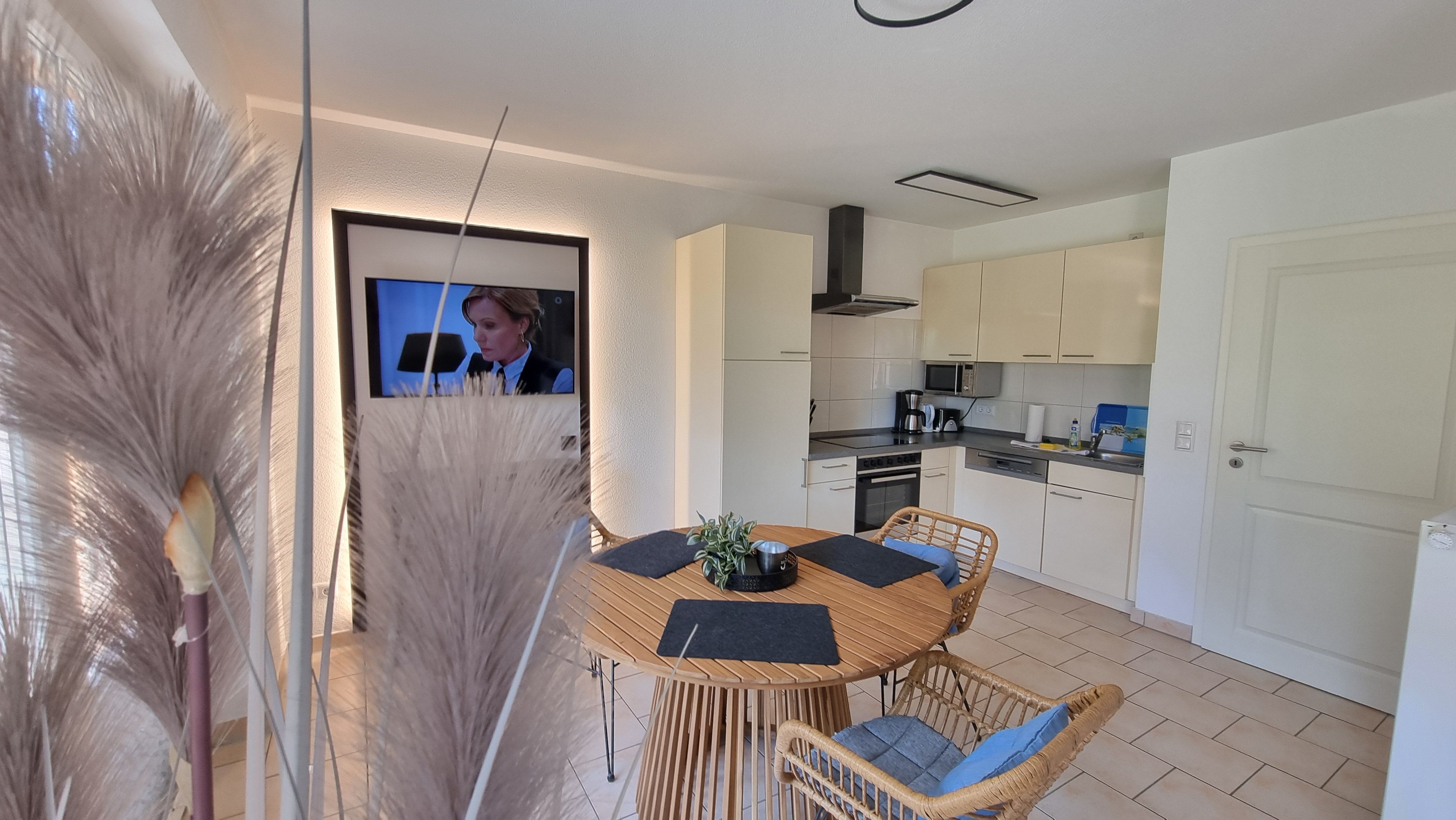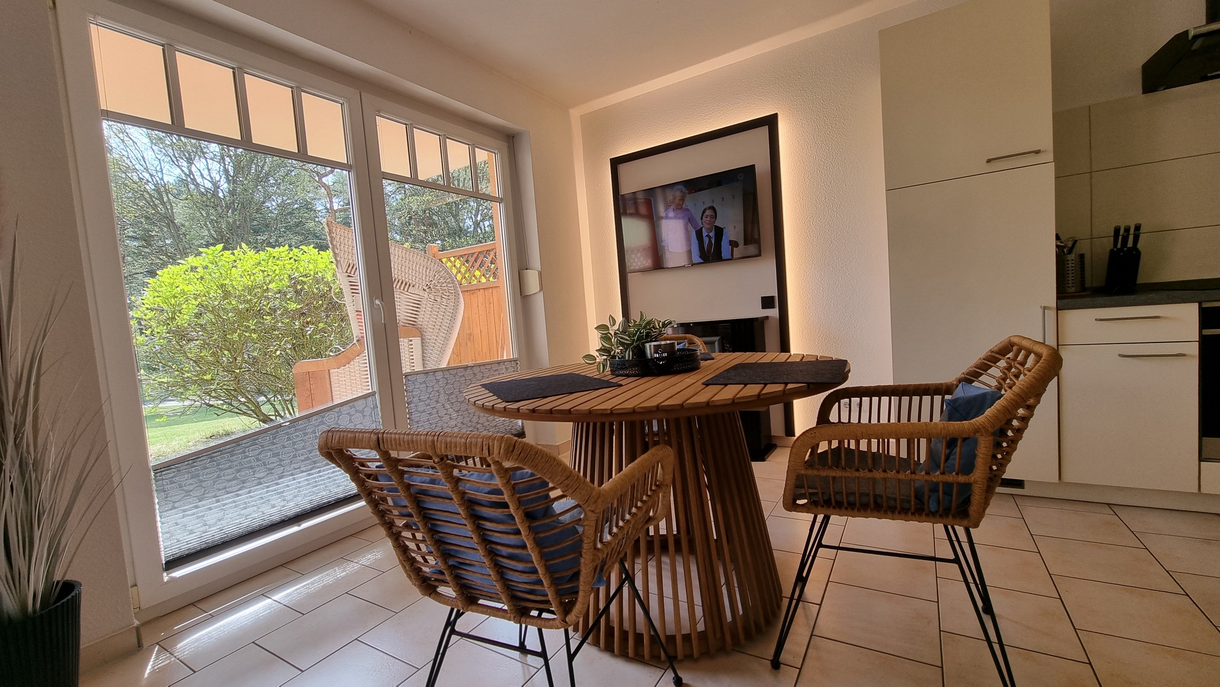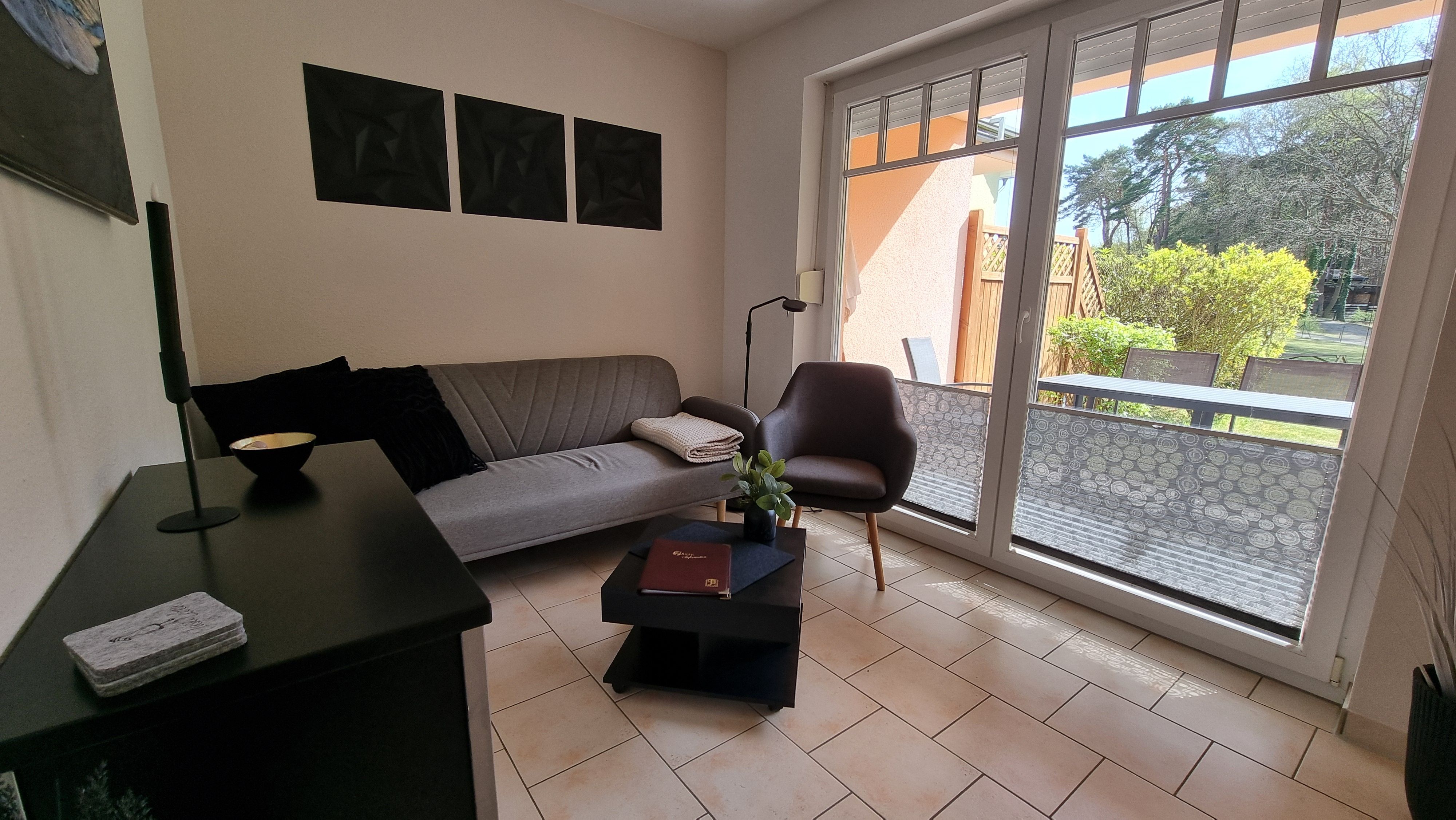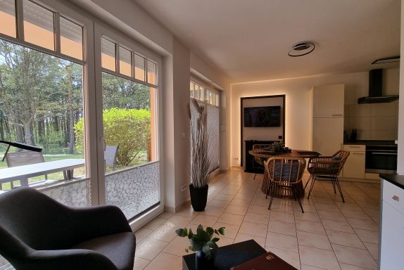 Die Ferienwohnung liegt im Erdgeschoß des Ferienhauses. Sie besteht aus Wohnzimmer, kompl. ausgestatteter Küche, Schlafzimmer und Tageslichtbad. Die Ausstattung der Einbauküche ist neuwertig funktional und qualitativ hochwertig unter anderem mit Toaster, Kaffeemaschine, Backofen, Kochfeld, Geschirrspüler, Gefrierfach. Große Süd-Terrasse mit Blick auf den Küstenwald, große Spielwiese.