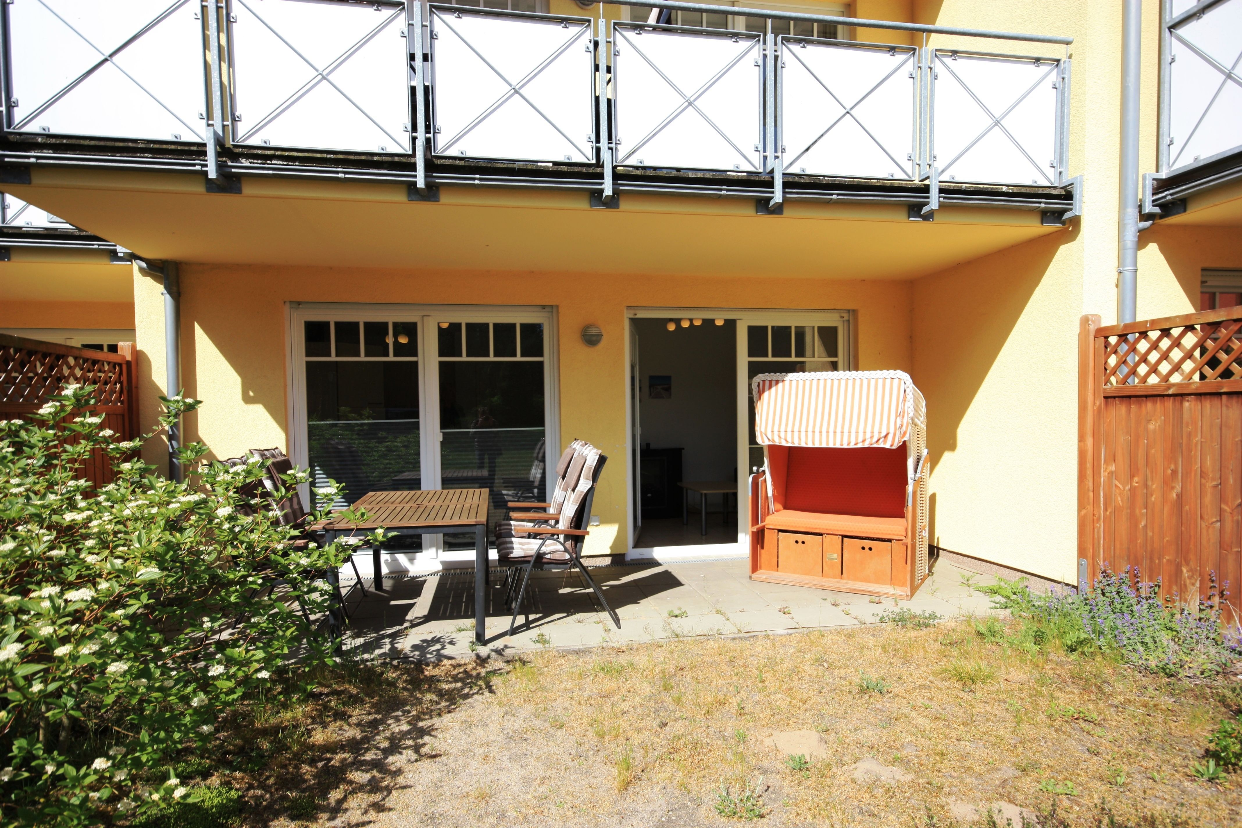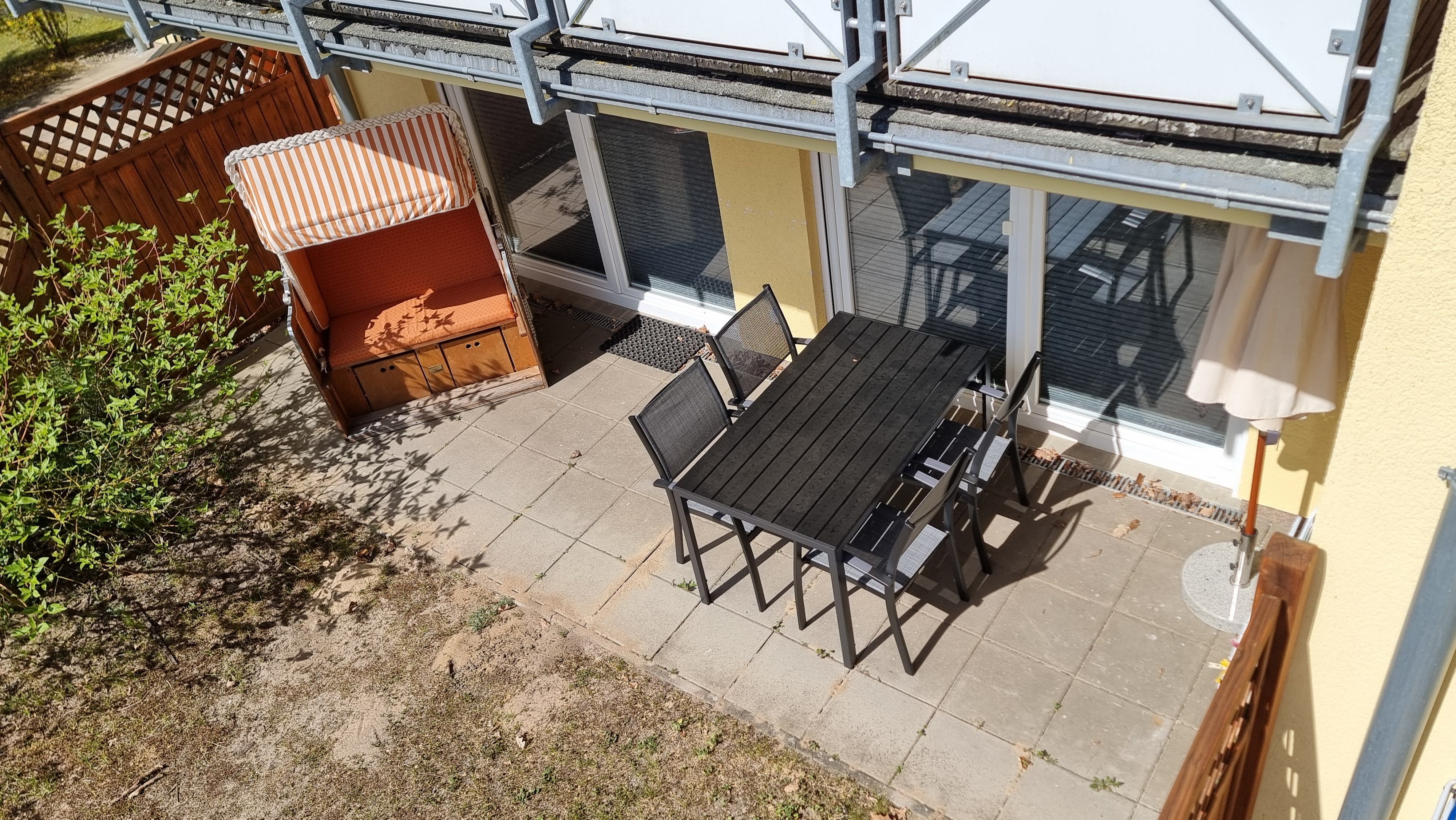 • Südterrasse mit Tisch, Stuhl, Sonnenschirm, Strandkorb