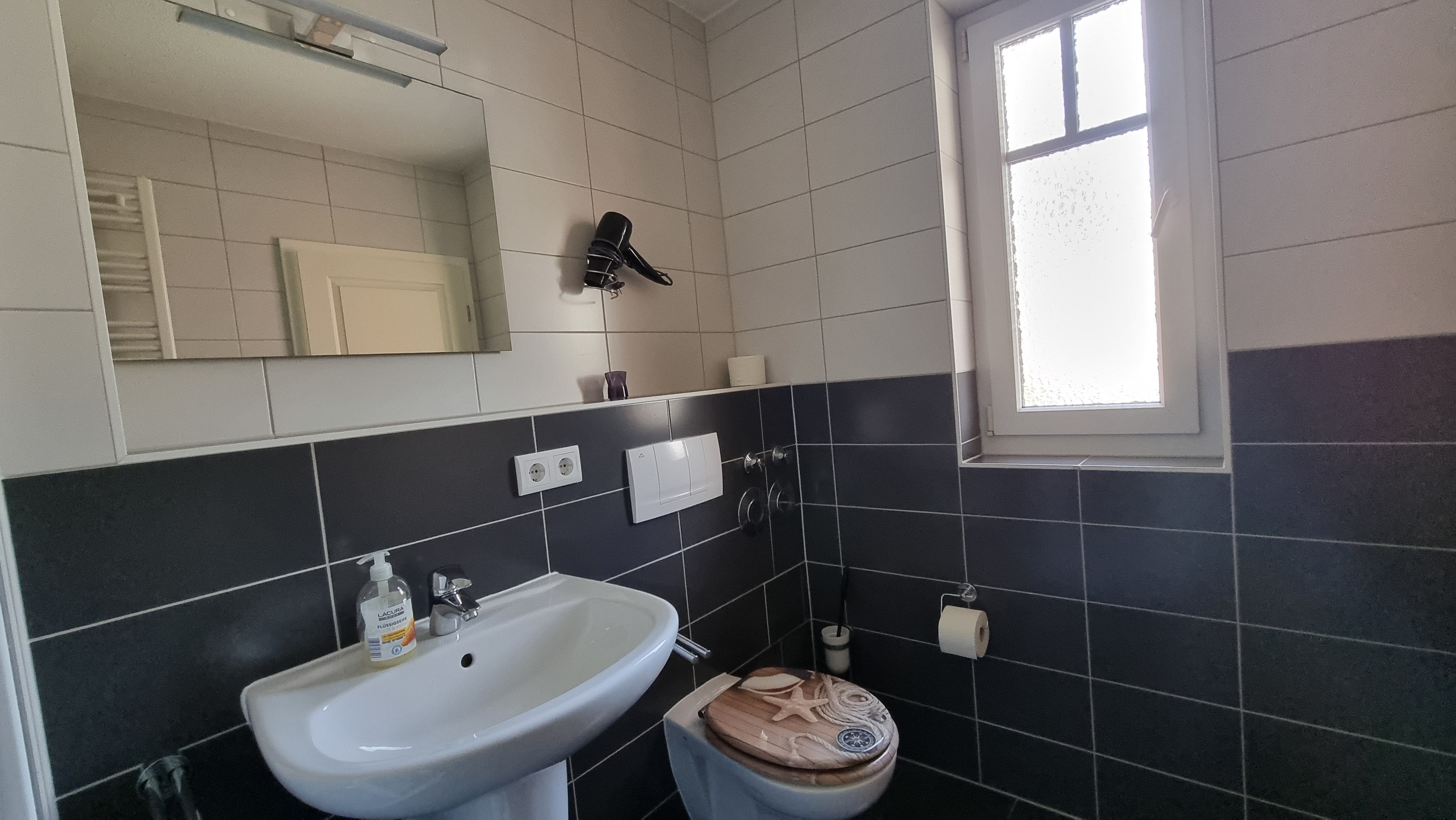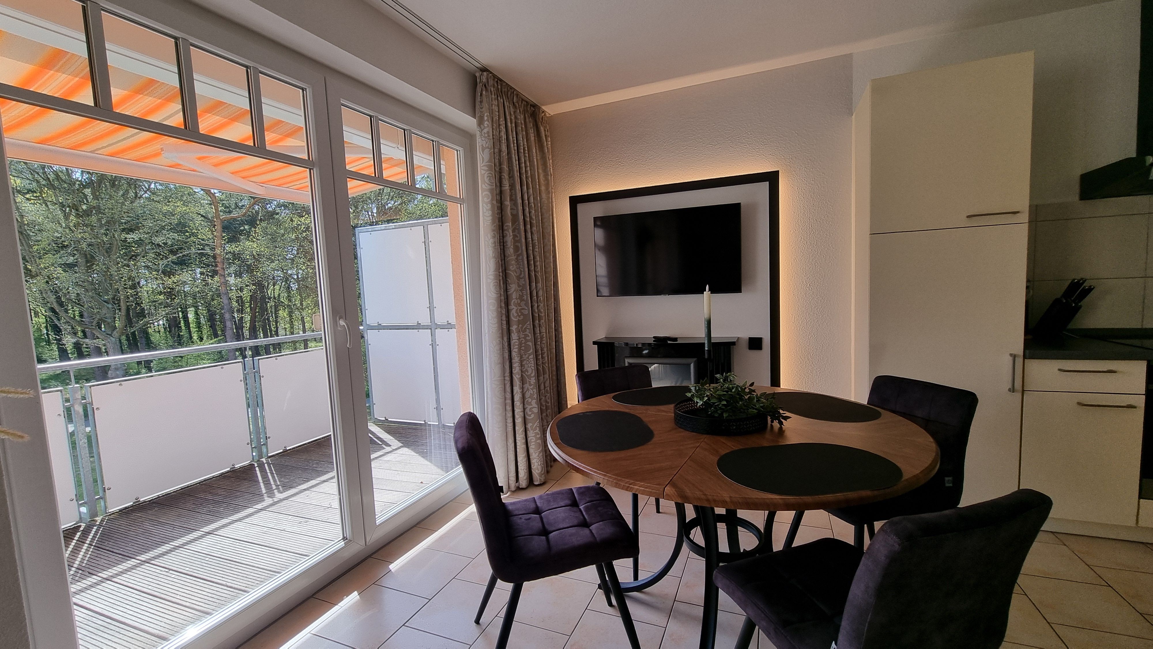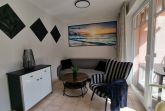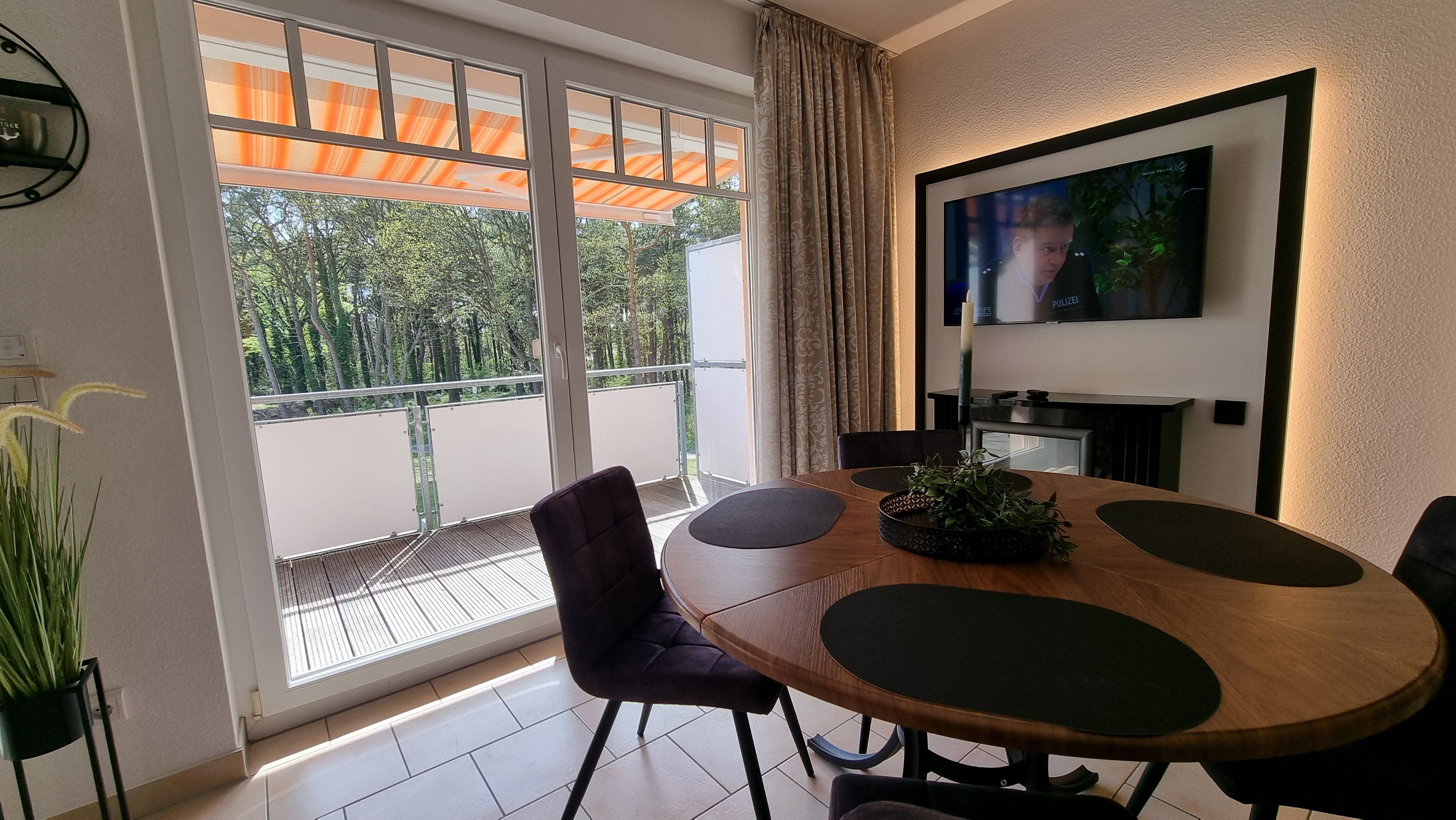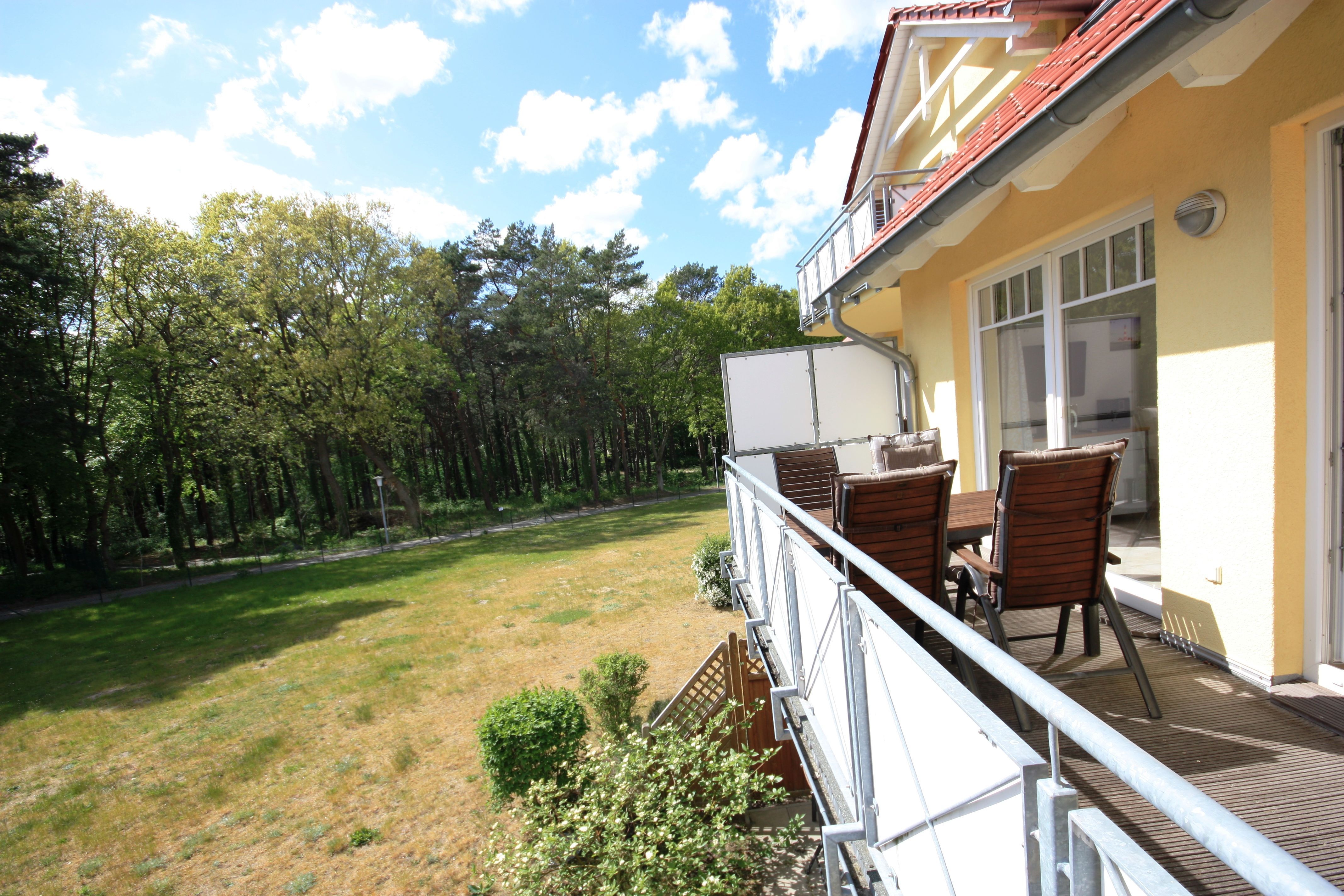 Die Ferienwohnung liegt im Obergeschoß des Ferienhauses. Sie besteht aus Wohnzimmer, kompl. ausgestatteter Küche, Schlafzimmer und Tageslichtbad. Die Ausstattung der Einbauküche ist neuwertig funktional und qualitativ hochwertig unter anderem mit Toaster, Kaffeemaschine, Backofen, Kochfeld, Geschirrspüler, Gefrierfach. Großer Südbalkon mit Blick auf den Küstenwald, große Spielwiese.