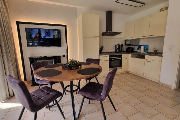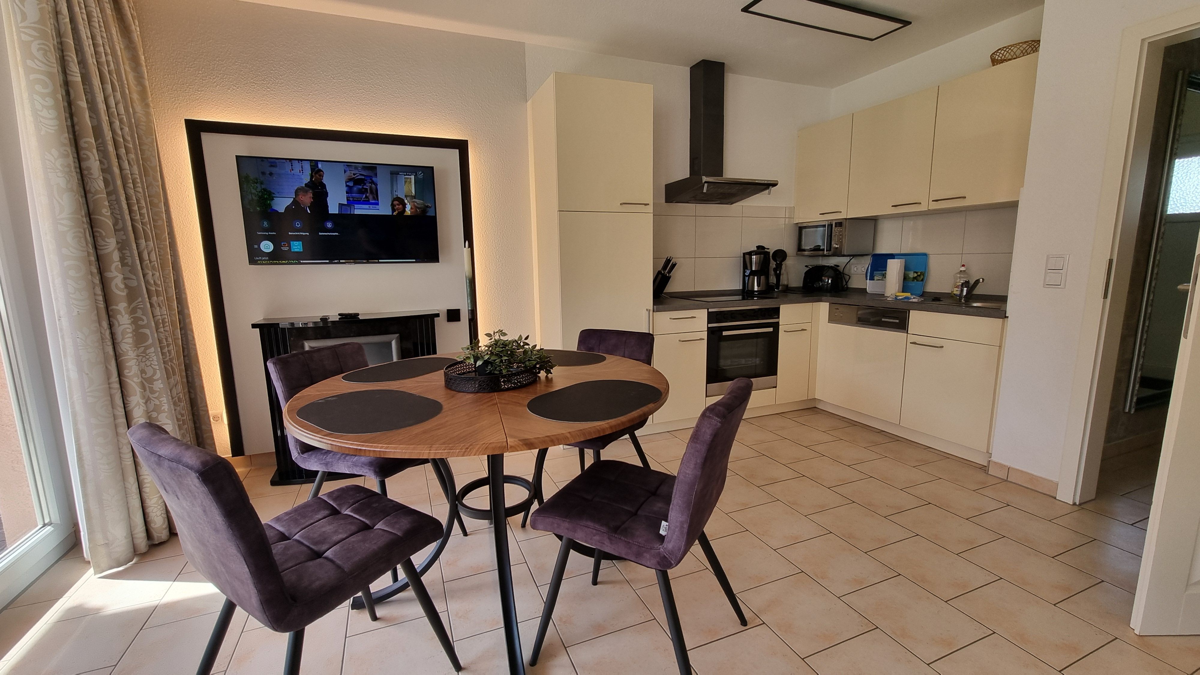• 1 Wohnzimmer mit offener Küche, Eßtisch, Couchecke, Elektrokamin