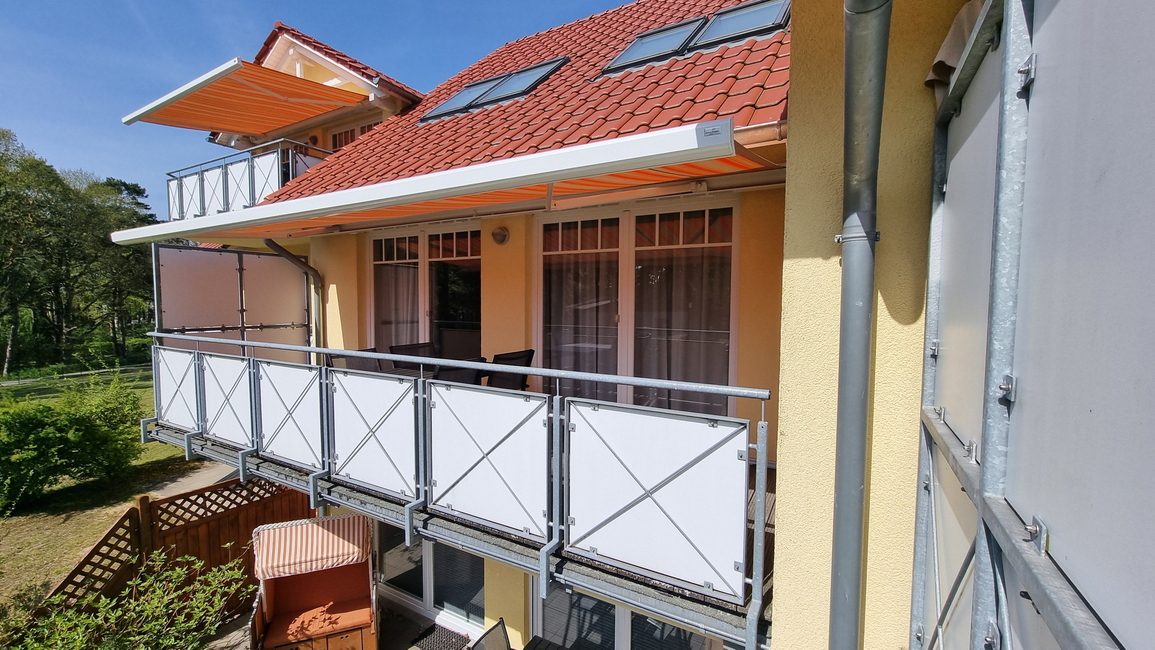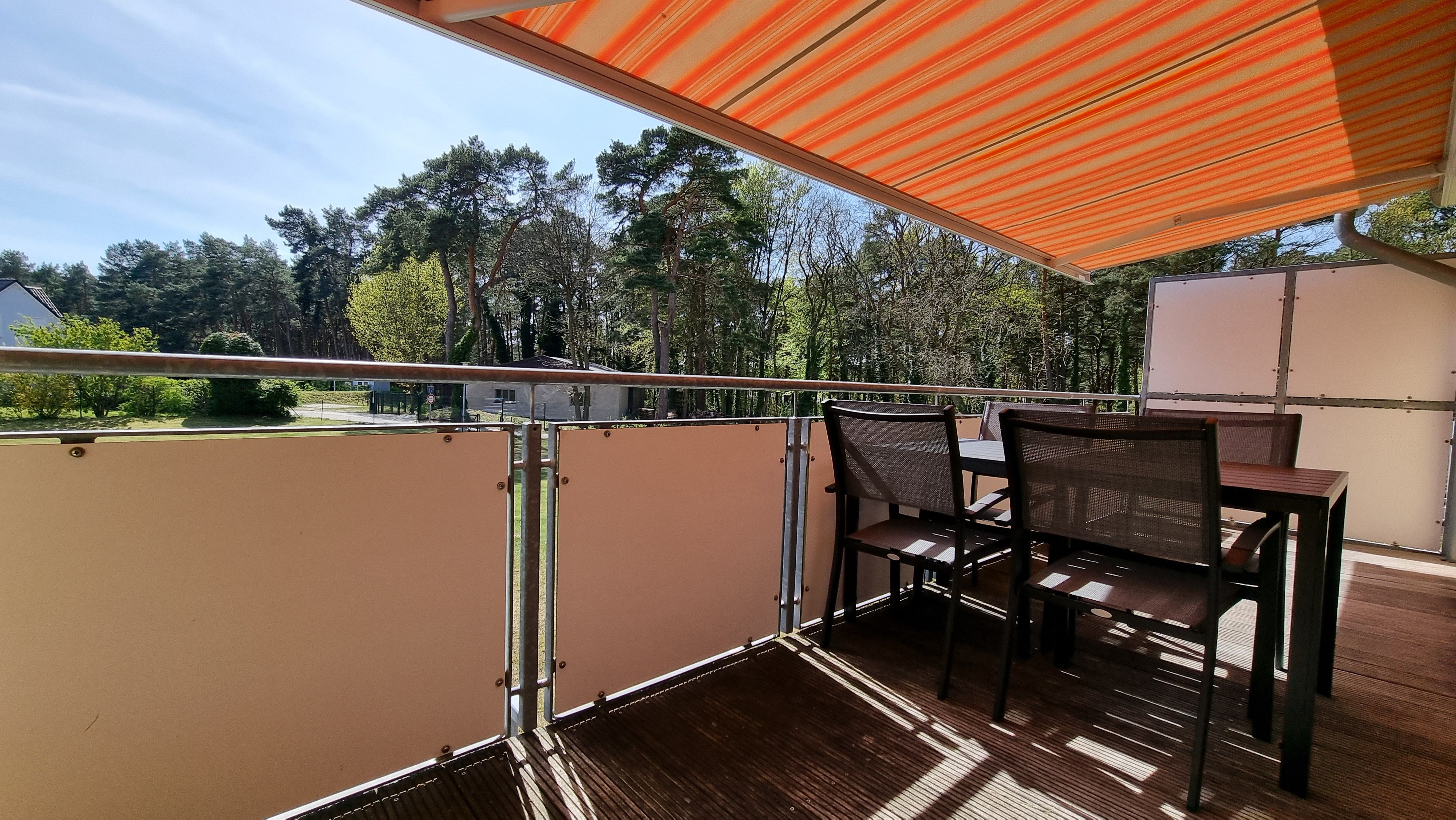 • Südbalkon mit Tisch, Stuhl, Sonnenschirm, Sonnenliege