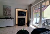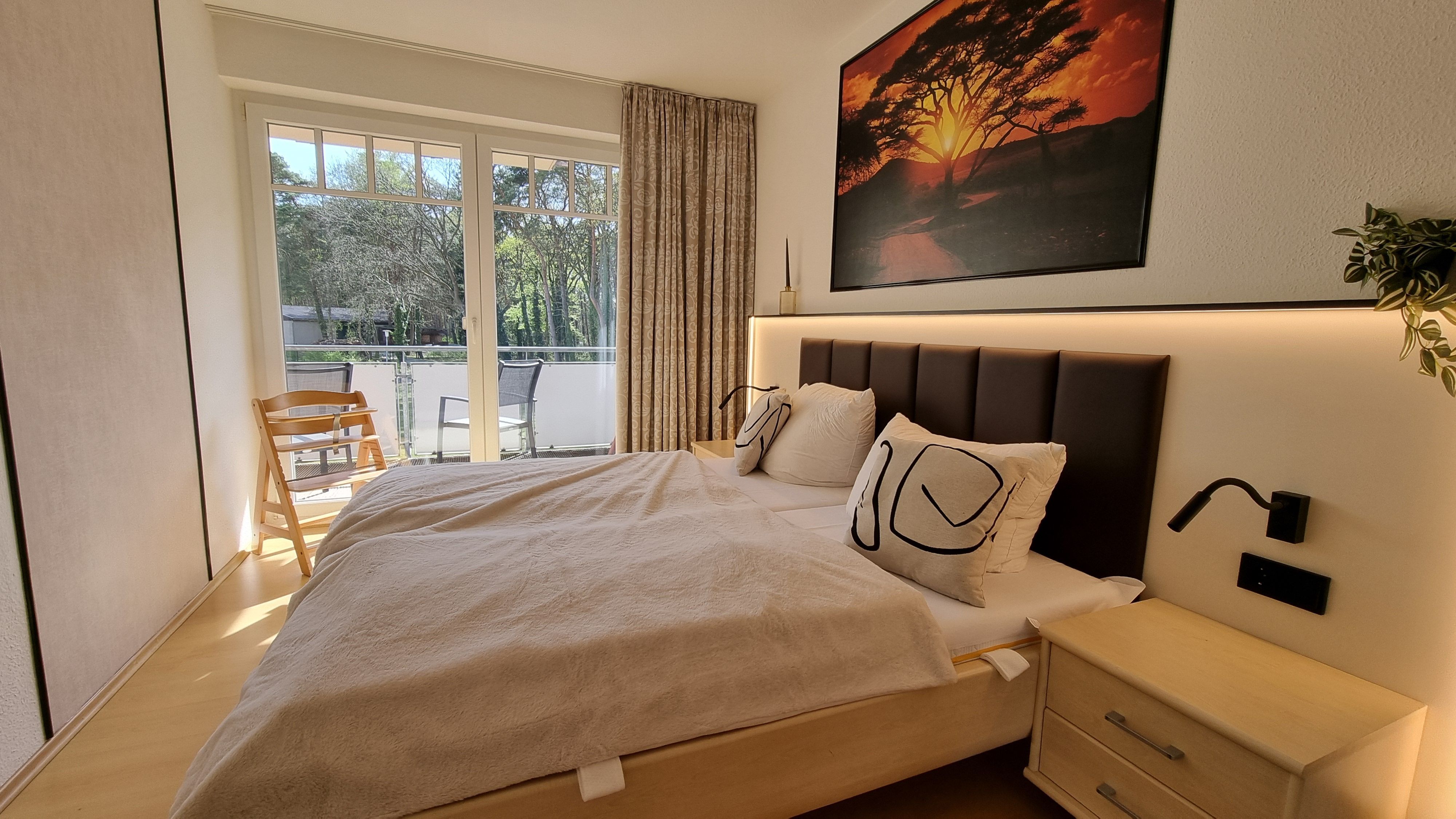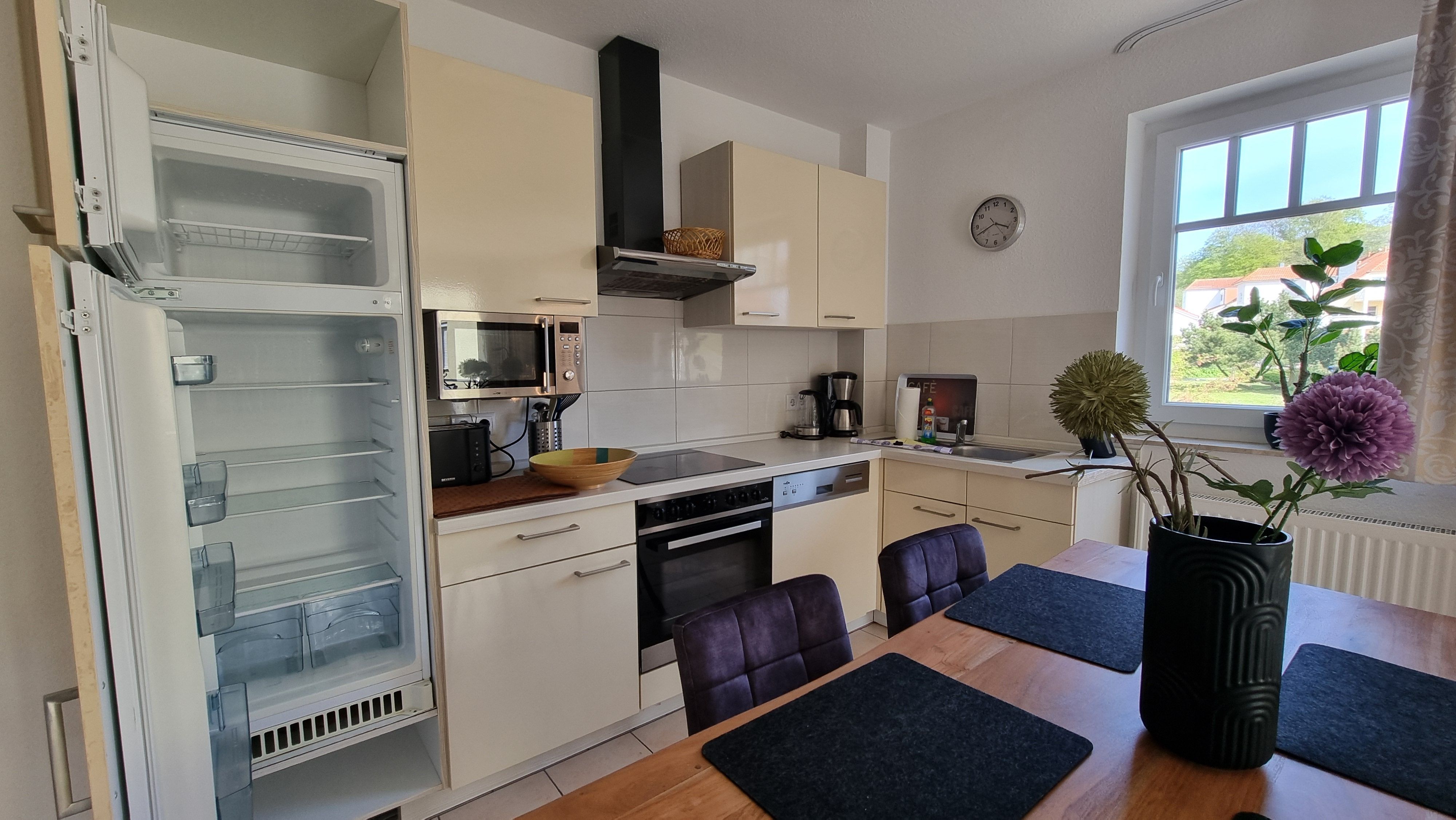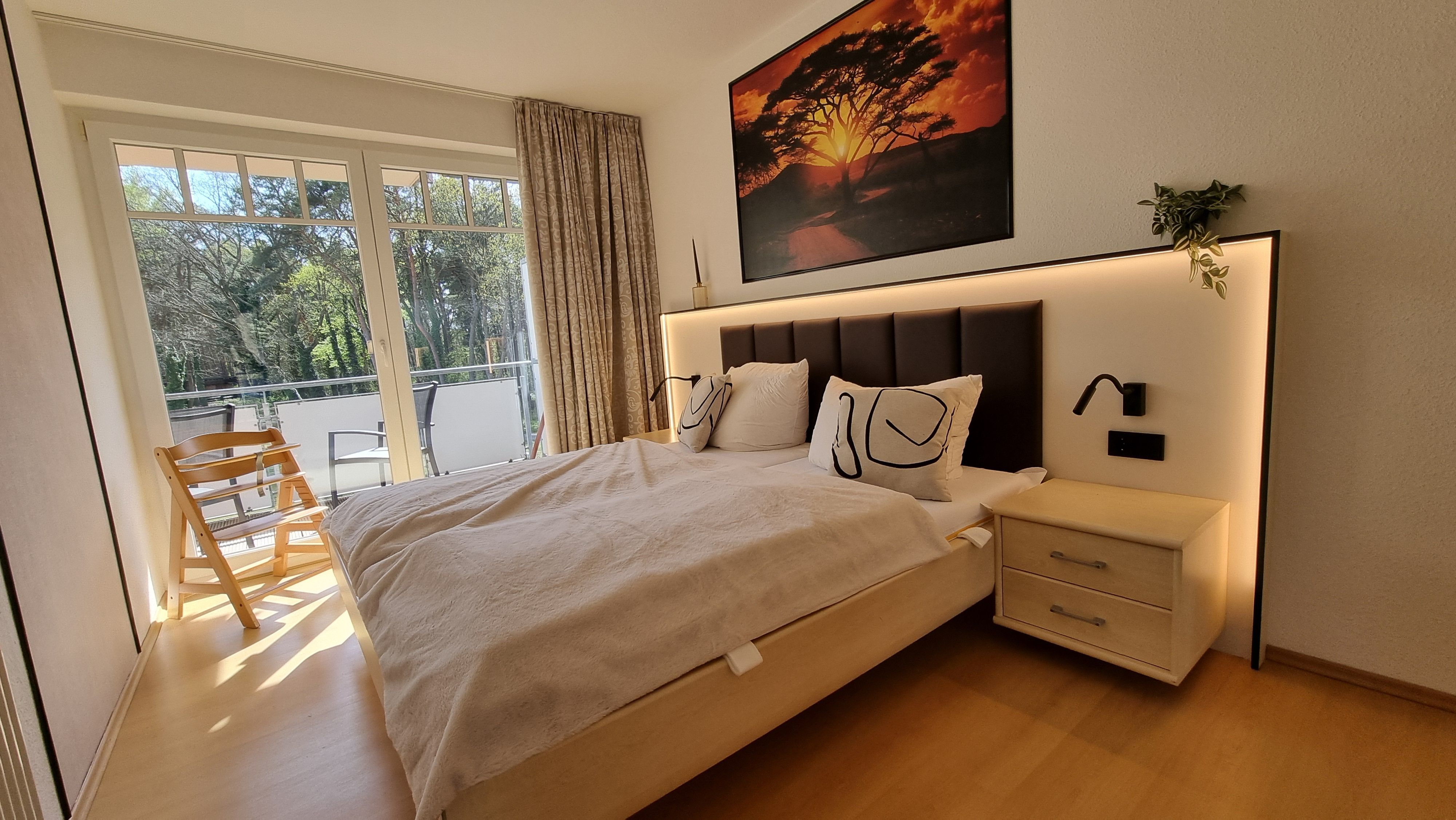 Die Ferienwohnung liegt im Obergeschoß des Ferienhauses. Sie besteht aus Wohnzimmer, kompl. ausgestatteter Küche, Schlafzimmer und Tageslichtbad. Die Ausstattung der Einbauküche ist neuwertig funktional und qualitativ hochwertig unter anderem mit Toaster, Kaffeemaschine, Backofen mit Heißluft, Kochfeld, Geschirrspüler, Gefrierfach. Großer Südbalkon mit Blick auf den Küstenwald, große Spielwiese.