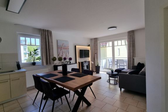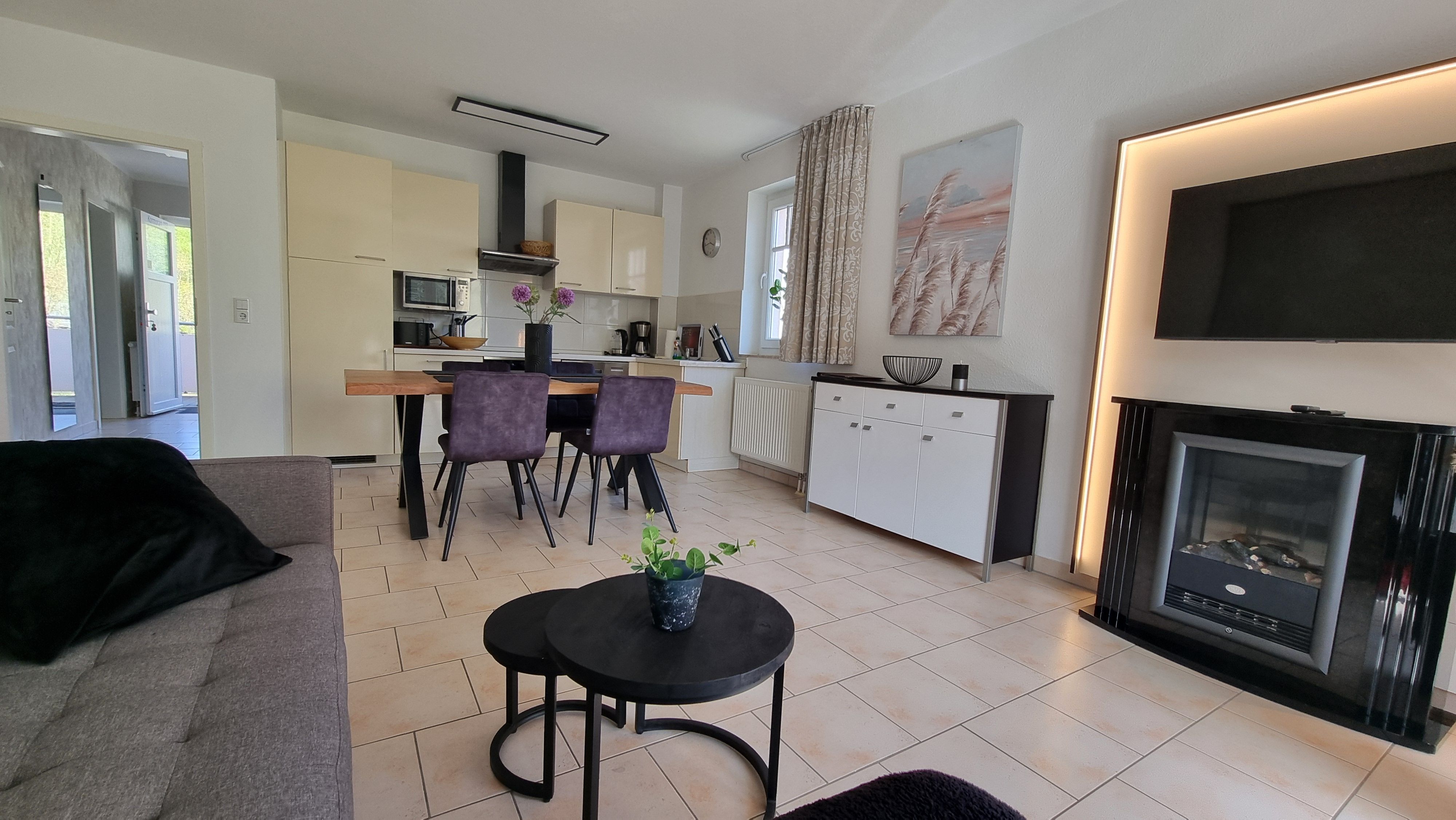 • Wohnzimmer mit off. Küche, Eßtisch, Couch, teilw. Elektrokamin