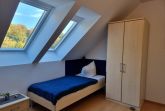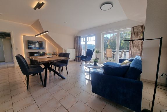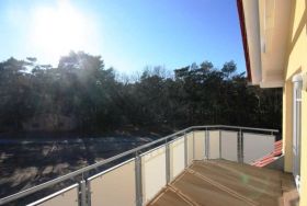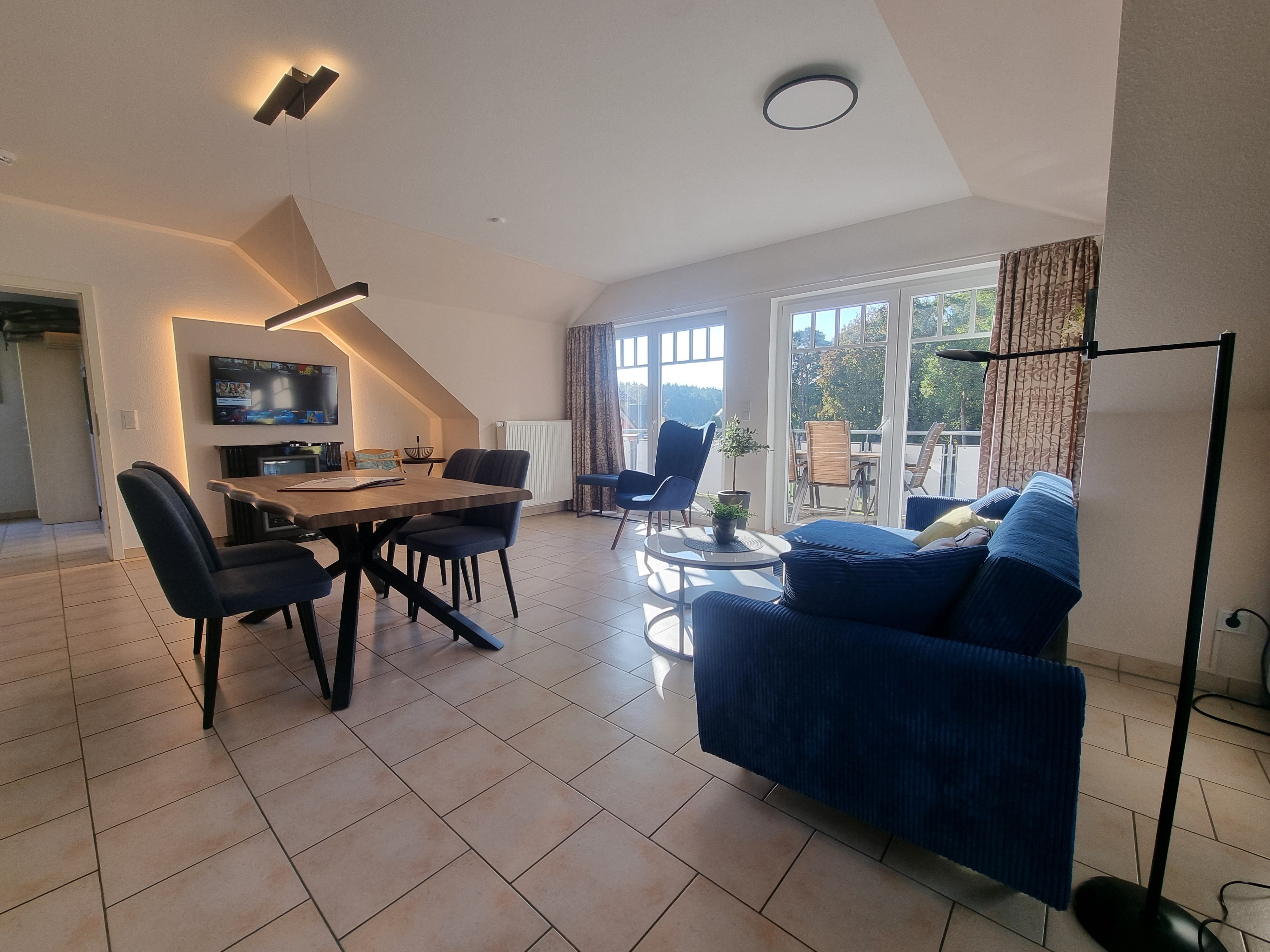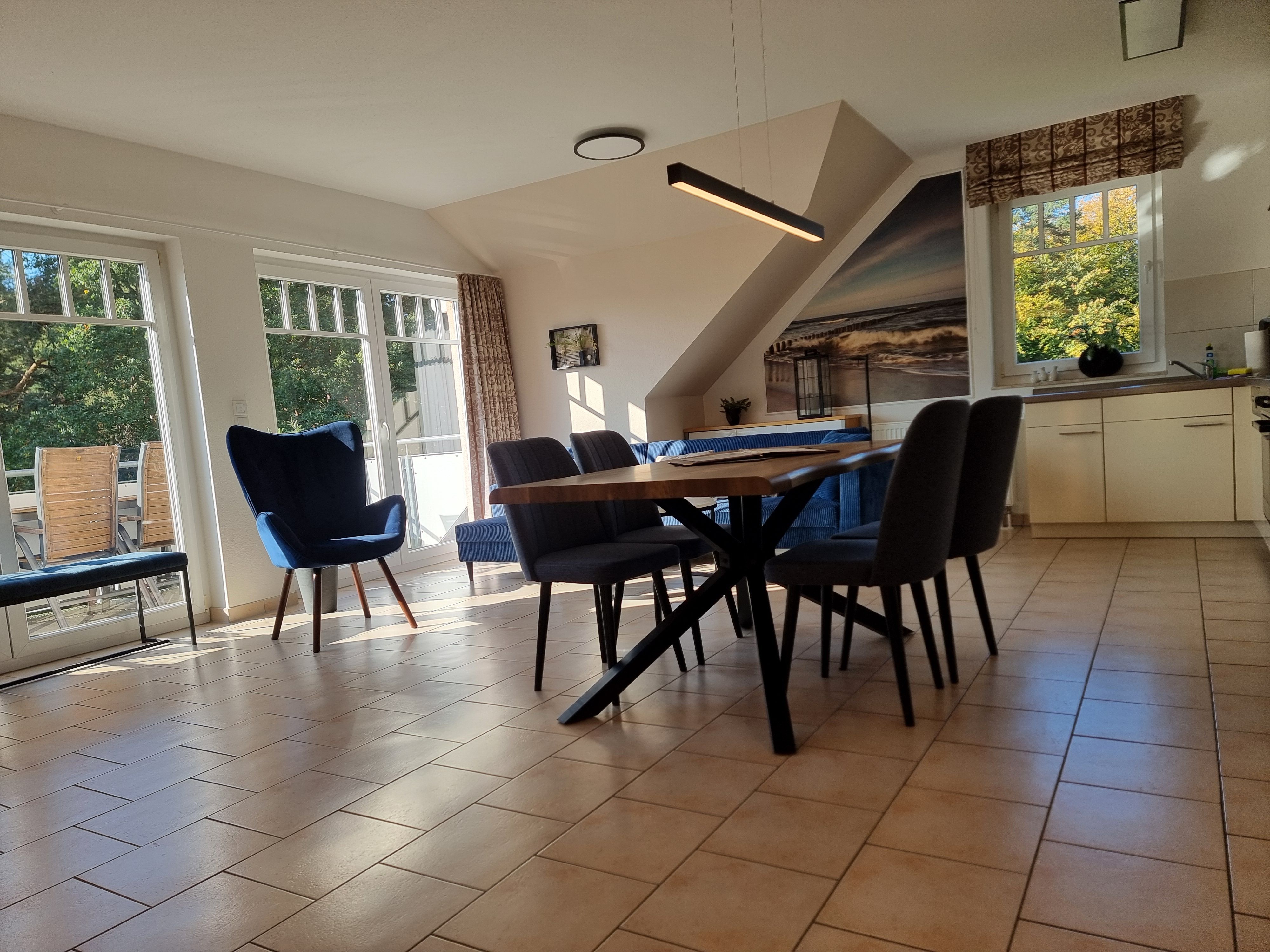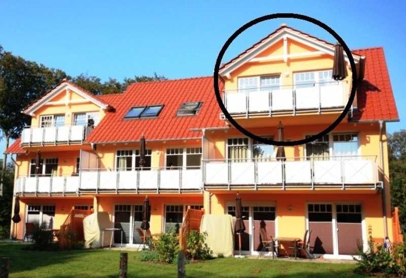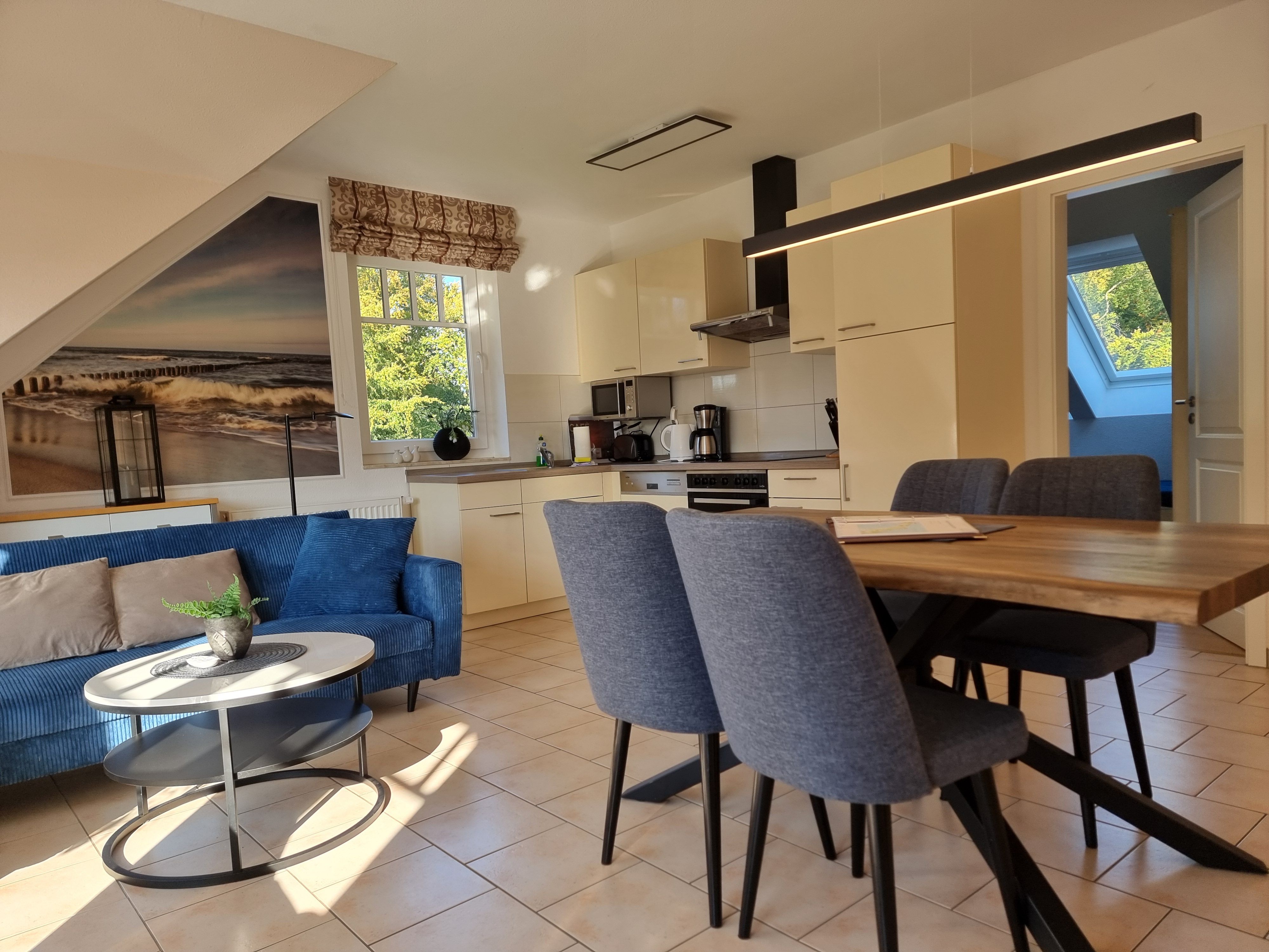 Die Ferienwohnung liegt im Dachgeschoß des Ferienhauses. Sie besteht aus Wohnzimmer, kompl. ausgestatteter Küche, Schlafzimmer und Tageslichtbad. Die Ausstattung der Einbauküche ist neuwertig funktional und qualitativ hochwertig unter anderem mit Toaster, Kaffeemaschine, Backofen mit Heißluft, Kochfeld, Geschirrspüler, Gefrierfach. Großer Südbalkon mit Blick auf den Küstenwald, große Spielwiese.