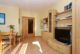 • Wohn- + Esszimmer mit einem großen Esstisch und einer Eckcouch mit Schlaffunktion, Kabel-TV und Zugang zum Balkon.