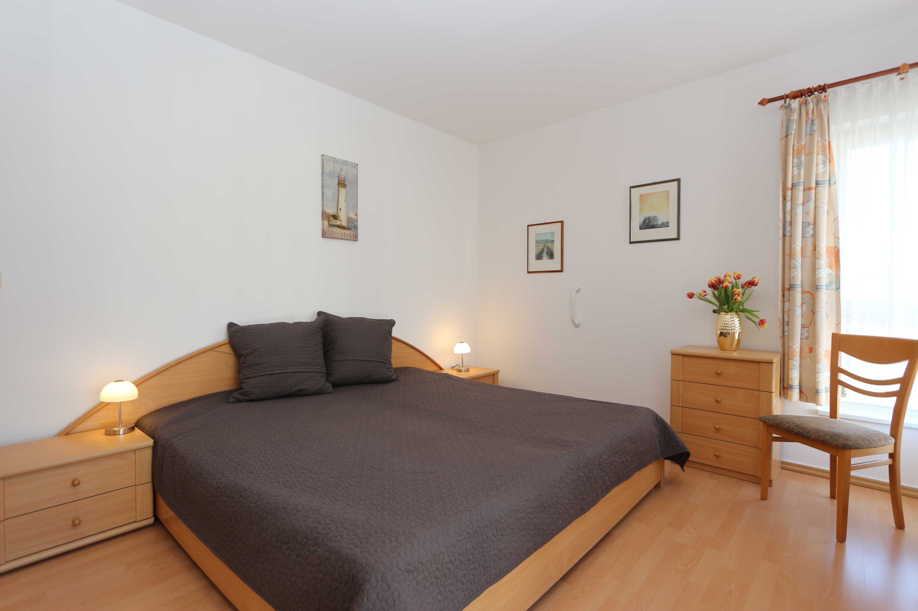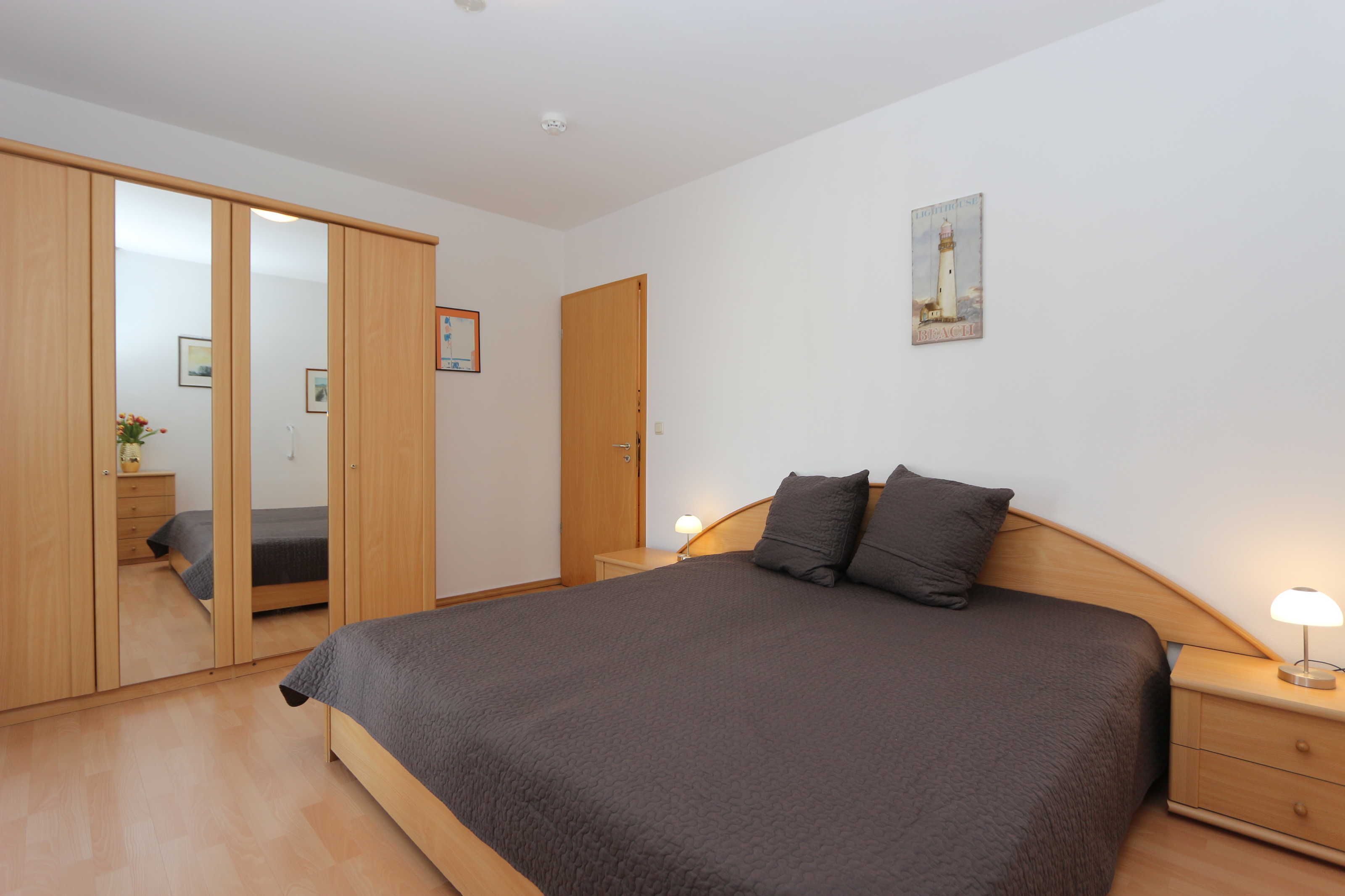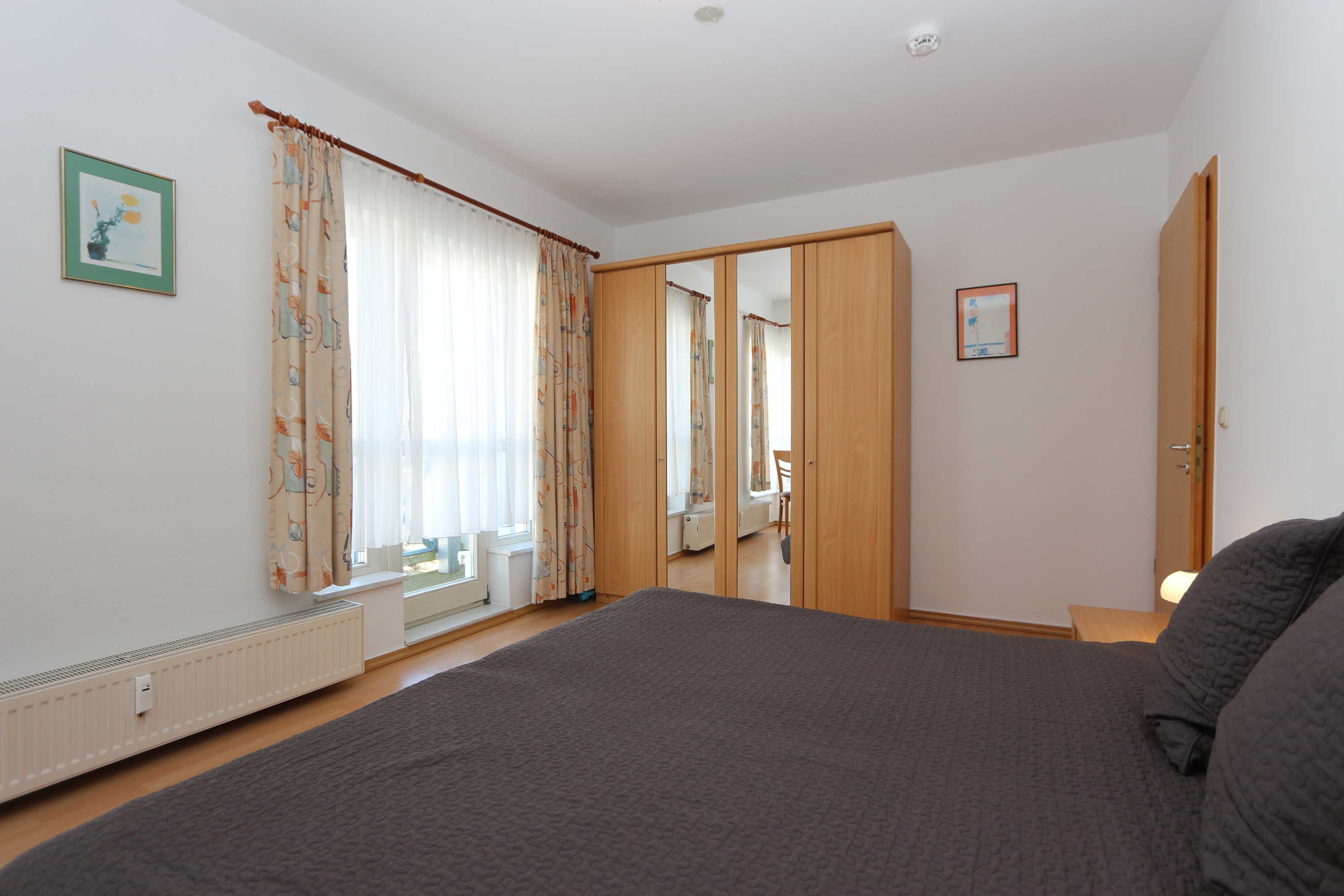 • Schlafzimmer mit Doppelbett für 2 Personen, Kleiderschrank. Kommode, Radiowecker und Zugang zum Balkon.