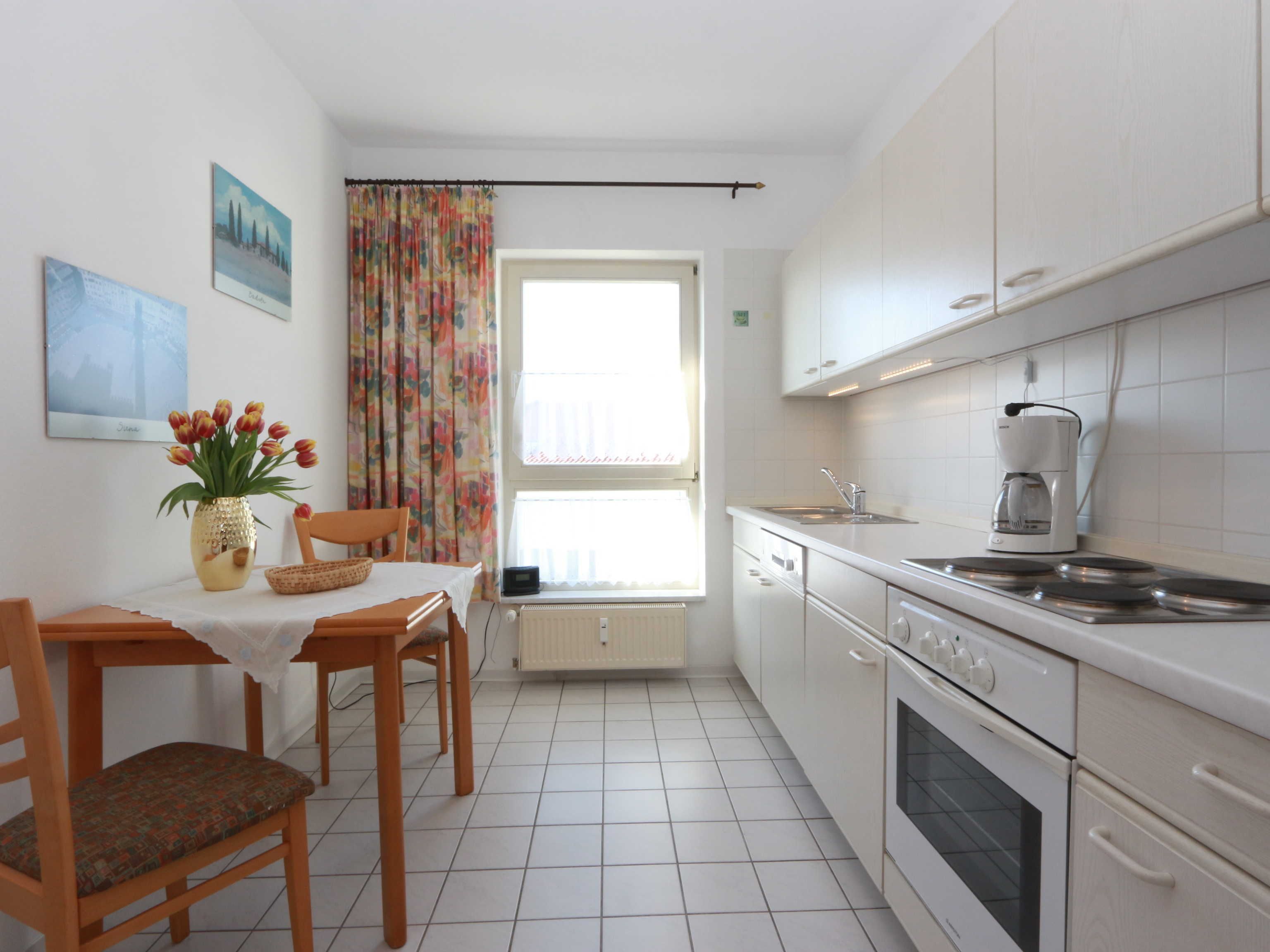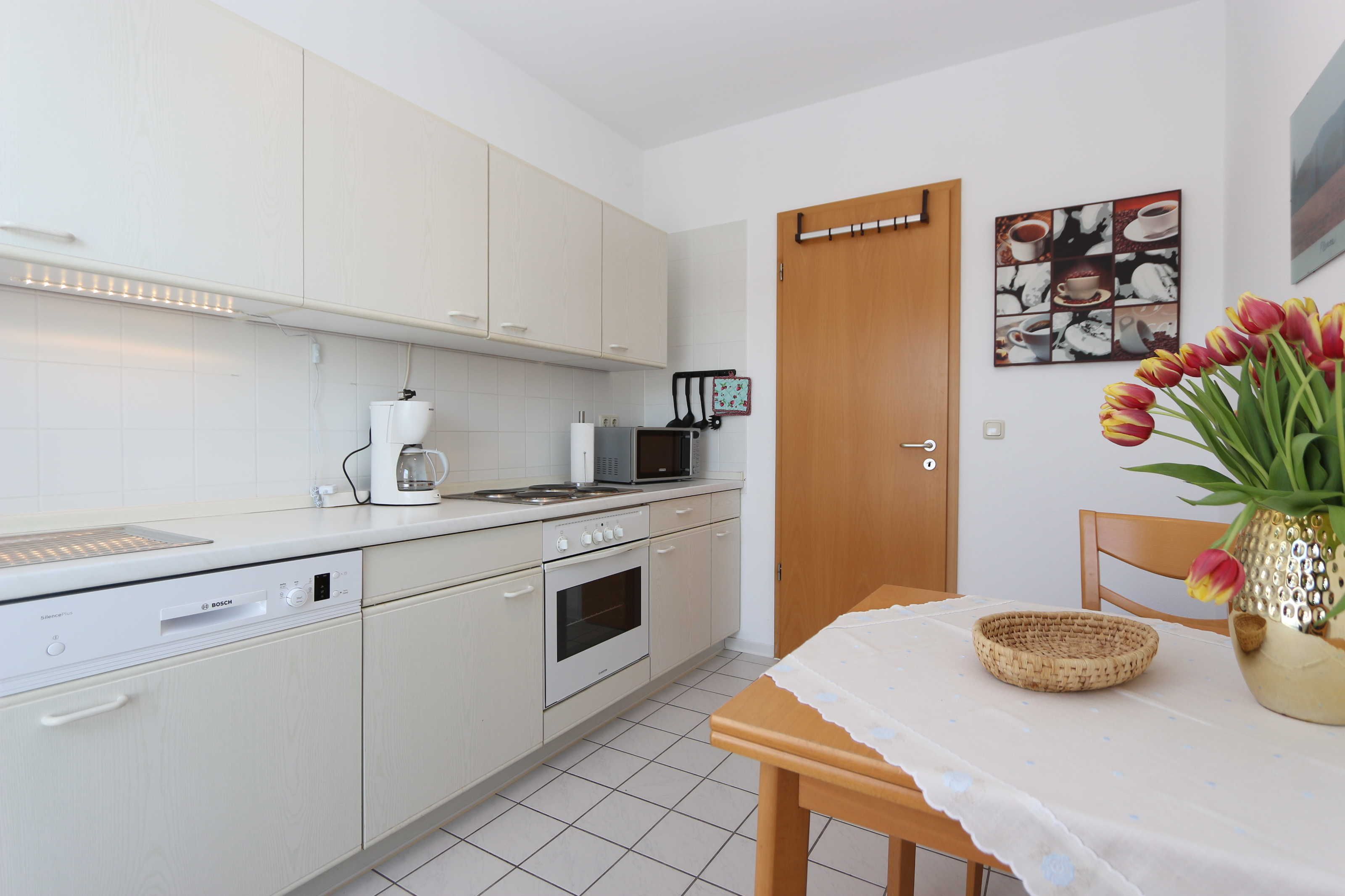 • komplett eingerichtete Einbauküche mit Herd, Spülmaschine, Mikrowelle, Kühlschrank mit Gefrierfach, Toaster, Kaffeemaschine, Wasserkocher, Eierkocher, reichlich Geschirr und Essplatz