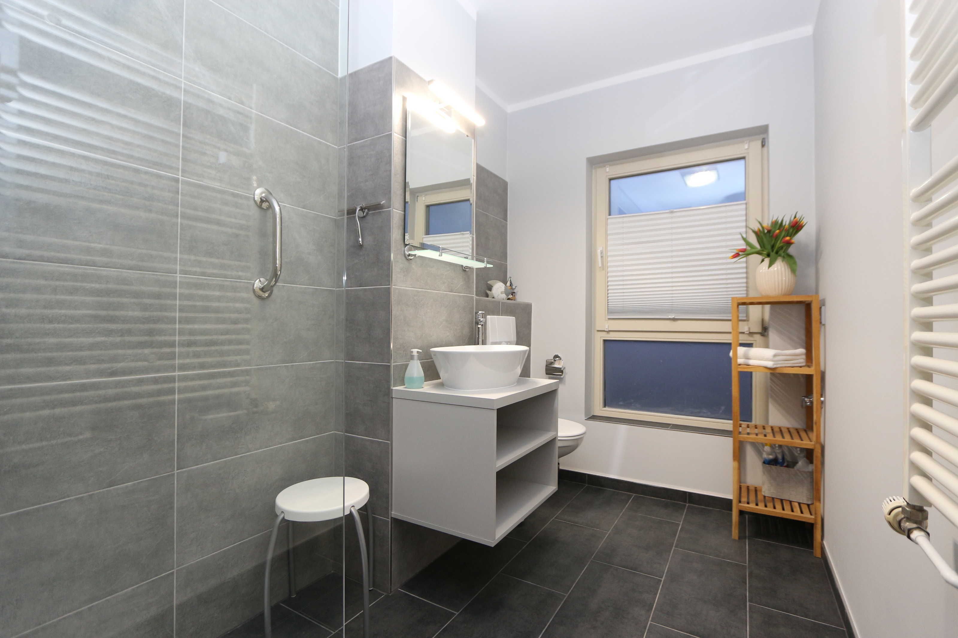 • Bad mit Fenster, WC, Dusche und Handtuchtrocknerheizkörper.