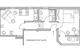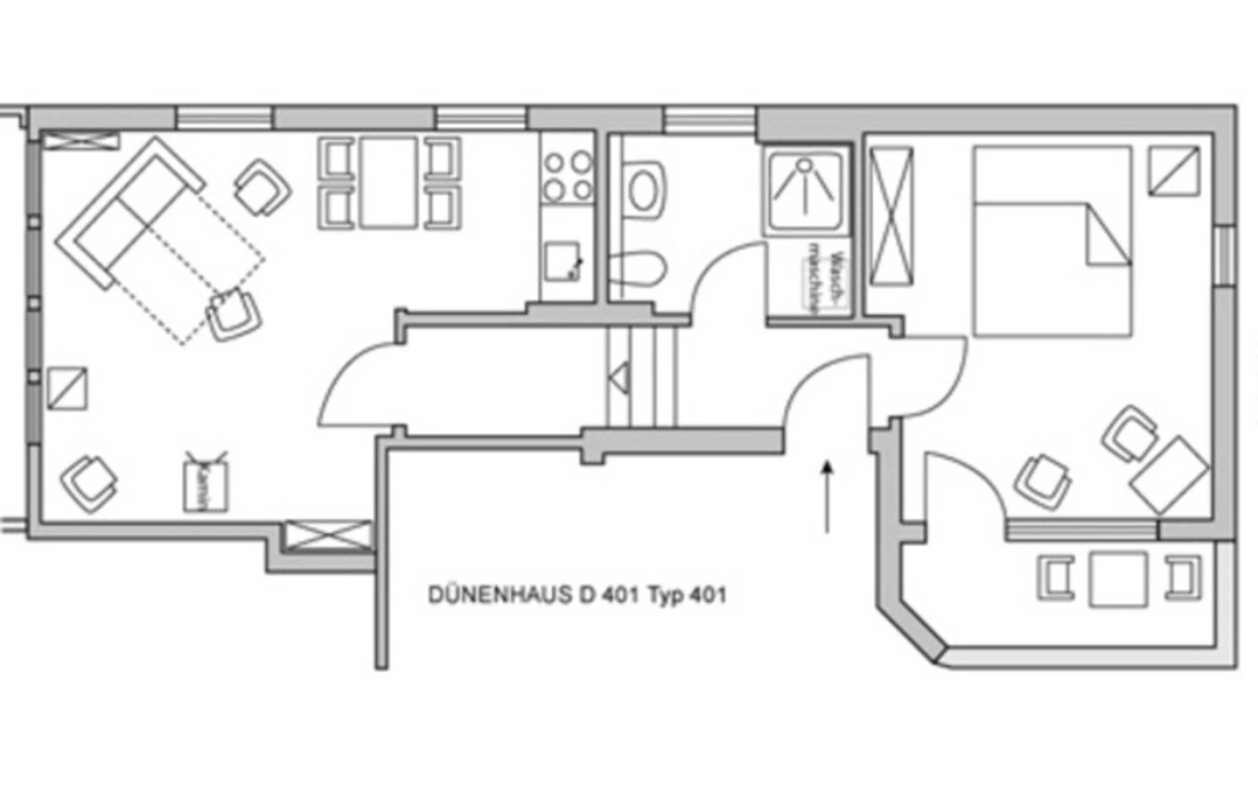 Die gradlinig-nordisch ausgestattete großzügige Zweizimmer-Ferienwohnung (D401) mit Balkon liegt im Dachgeschoss (3.OG) des restaurierten DÜNENHAUS und umfasst gut 50 qm. Sie hat ein Wohnzimmer mit Kaminofen und Schlafsofa sowie eine zum Wohnraum offene Küche mit Essplatz für vier Personen. Das Schlafzimmer mit Doppelbett verfügt über einen kleinen Balkon mit Blick zum Selliner See (Bodden). Das Wohnzimmer liegt zur Wilhelmstraße.