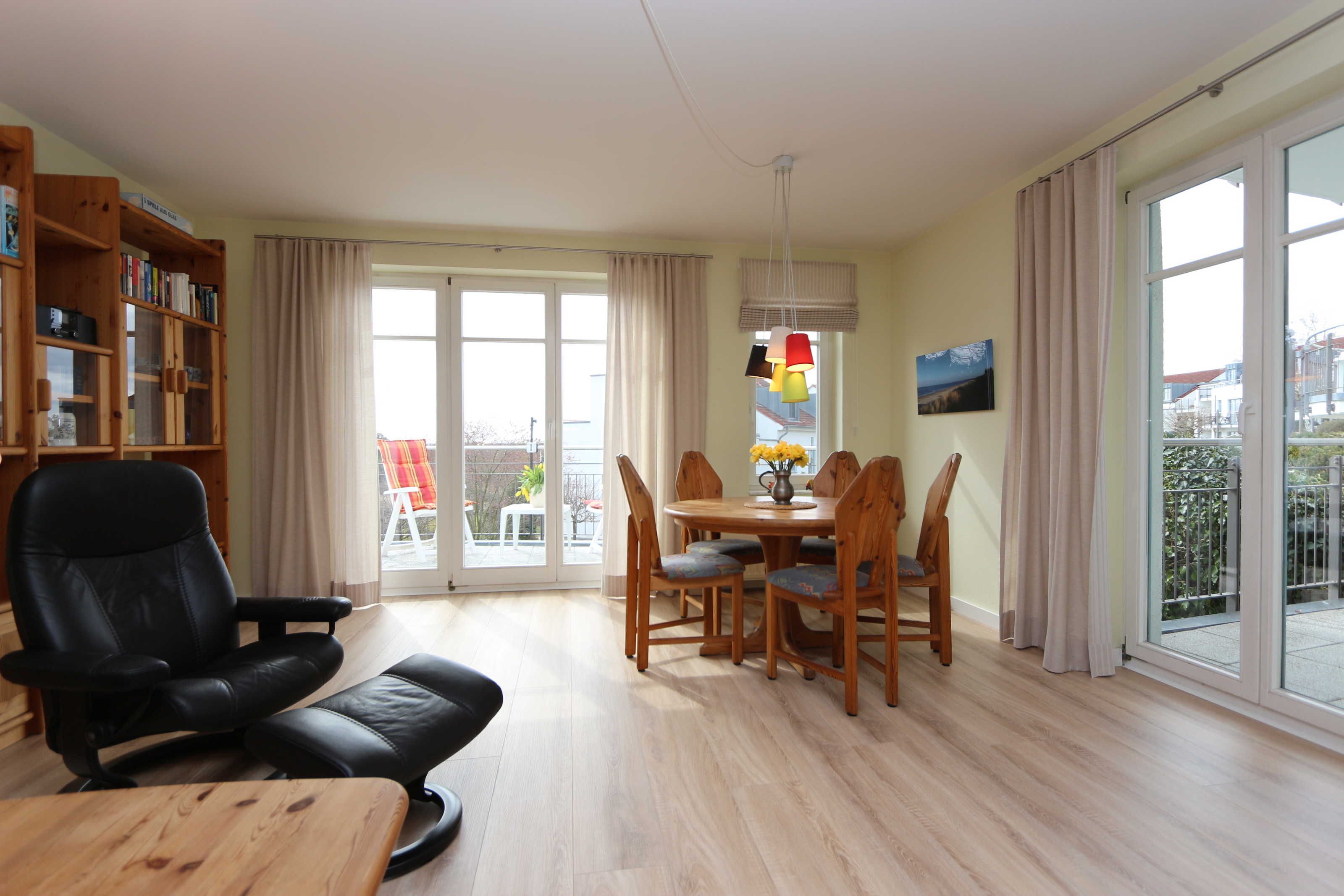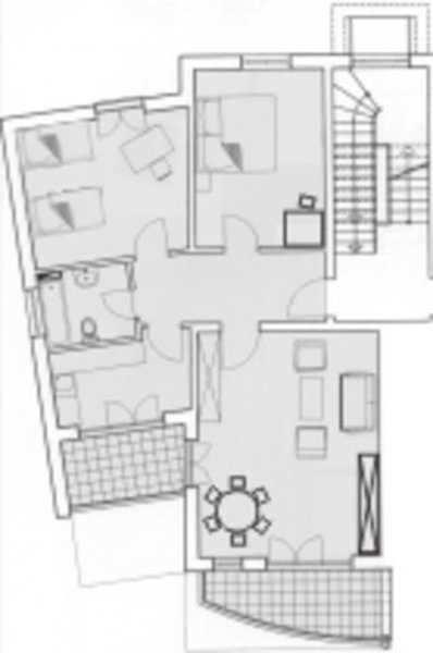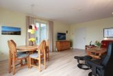 Ferienwohnung für 2-5 Personen inkl. Kleinkind (ca. 86 m²) im 1 Obergeschoss mit Wohn- und Esszimmer, Schlafzimmer, Kinderzimmer, Küche, Bad und 2 Balkonen.