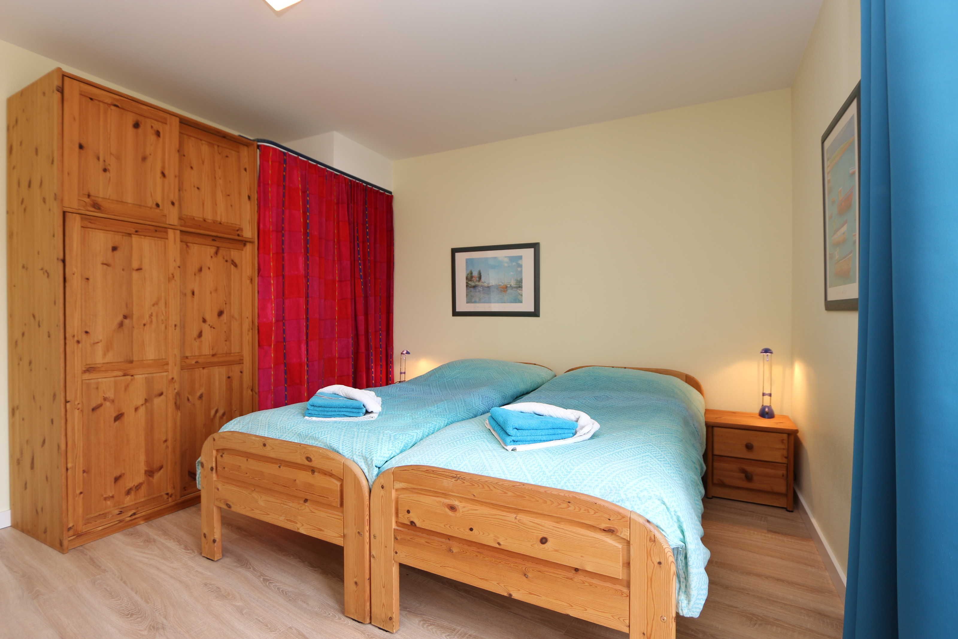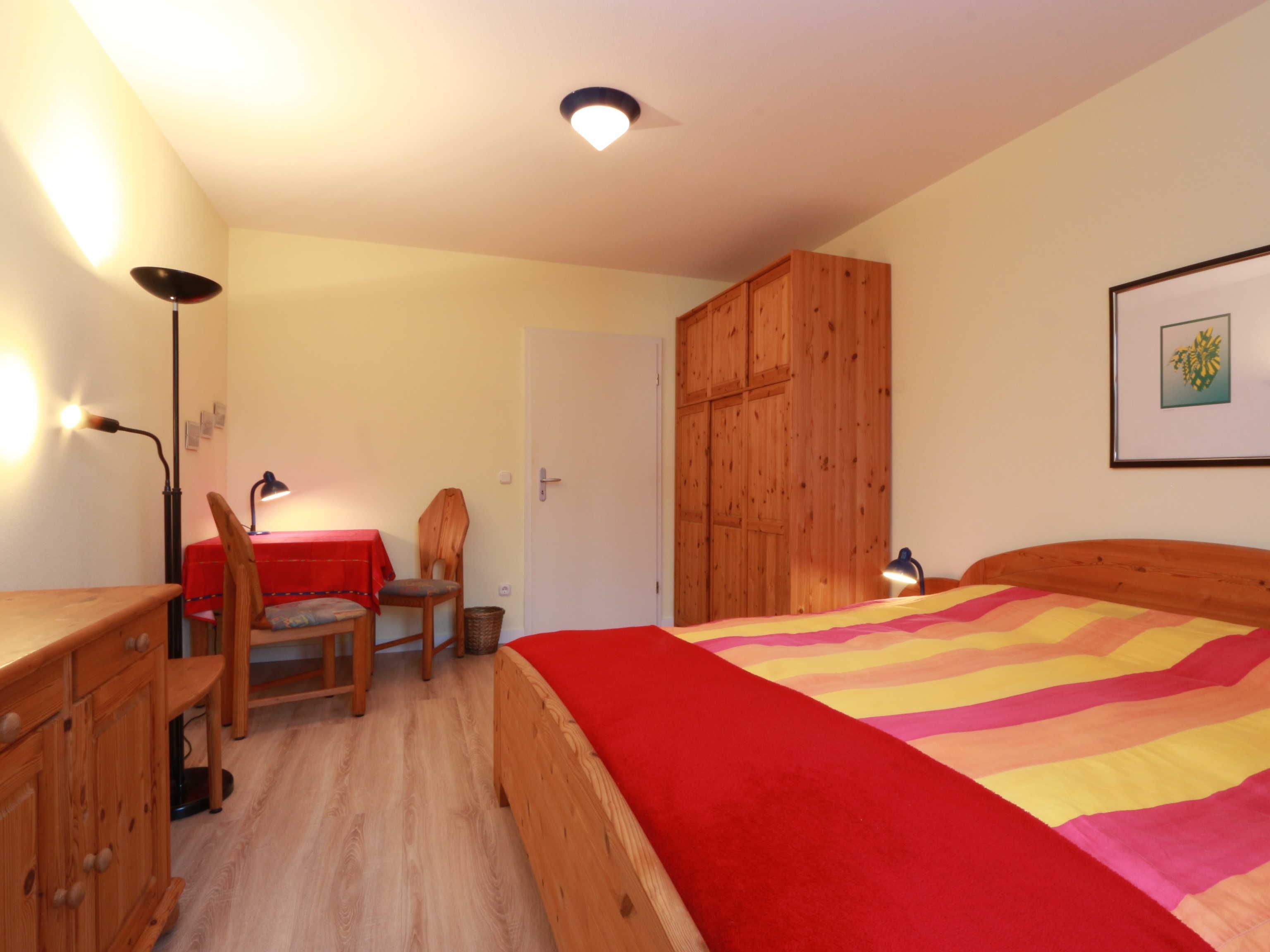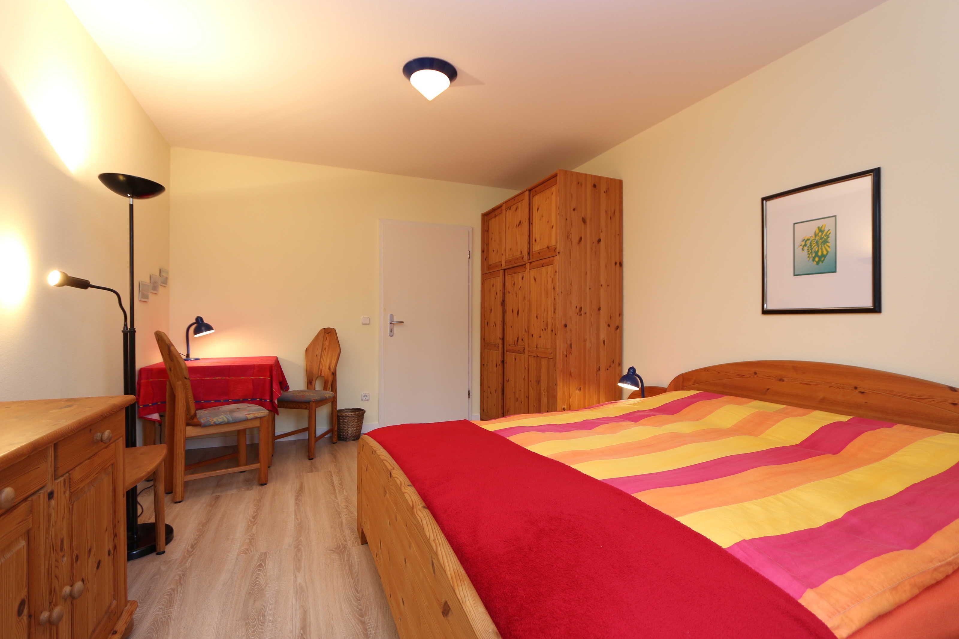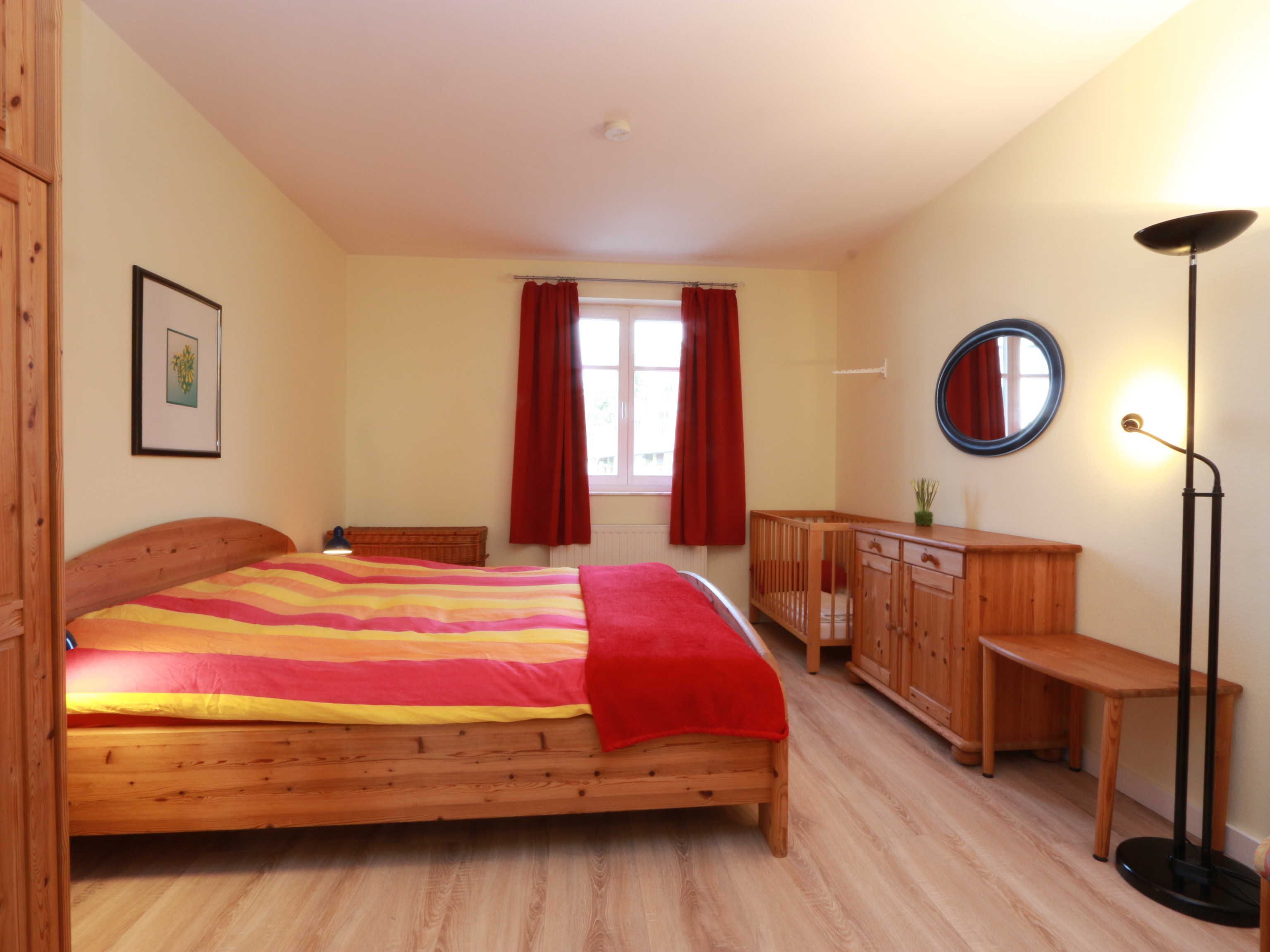 • Das Schlafzimmer ist mit Doppelbett (180 x 200 cm) für 2 Personen, einem Kleiderschrank, Tischgruppe, mit Radiowecker und einem Kinderbett (120 x 60 cm) ausgestattet.
