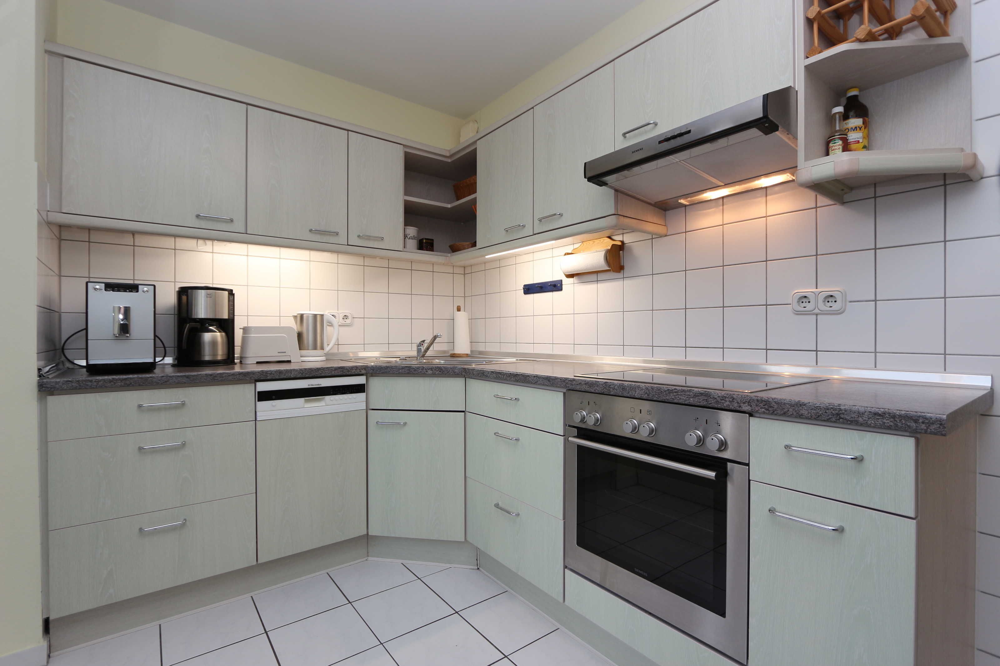 • Komplett eingerichtete Einbauküche mit Geschirrspüler, Herd, Mikrowelle, Kühlschrank mit Gefrierfach, Toaster, Kaffeemaschine, Wasserkocher, Handmixer, reichlich Geschirr