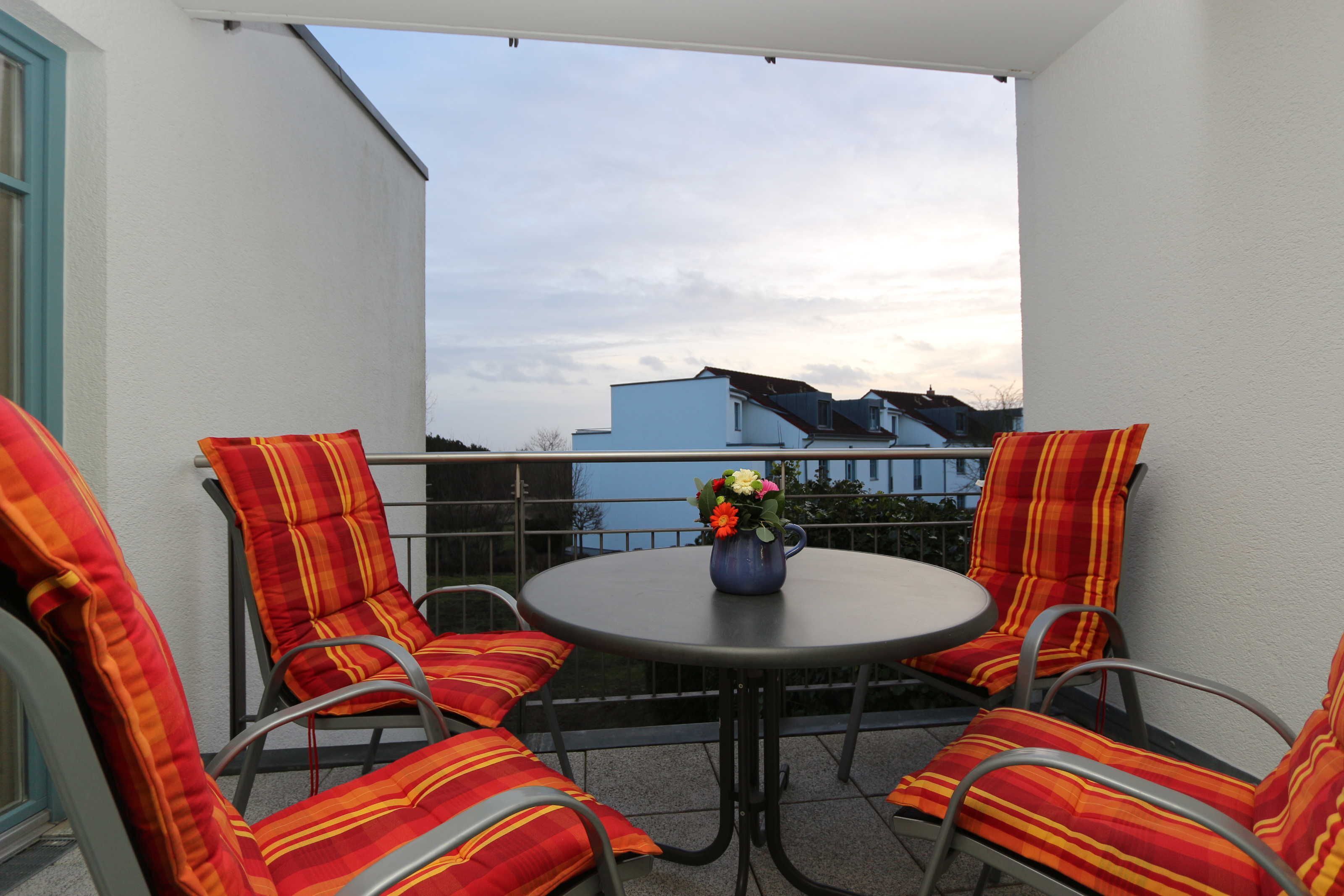 • Die beiden Balkone sind nach Süden ausgerichtet, mit Terrassenstühlen, Tisch, 2 Sonnenliegen und 2 Sonnenschirmen