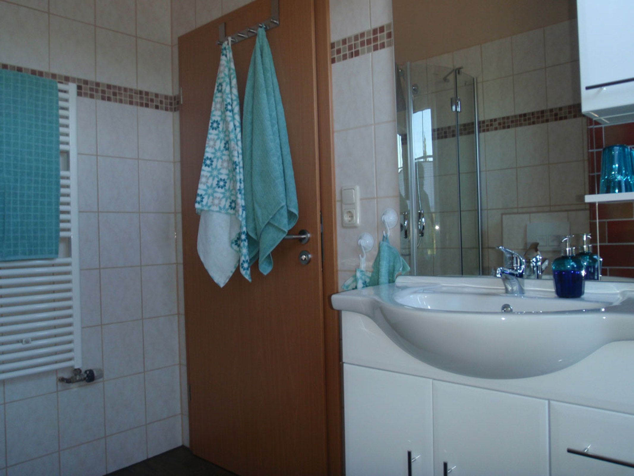 • Im Bad ist ein großer Waschplatz , eine Dusche , ein Handtuchtrockner und WC.Auch ein Fön liegt bereit.