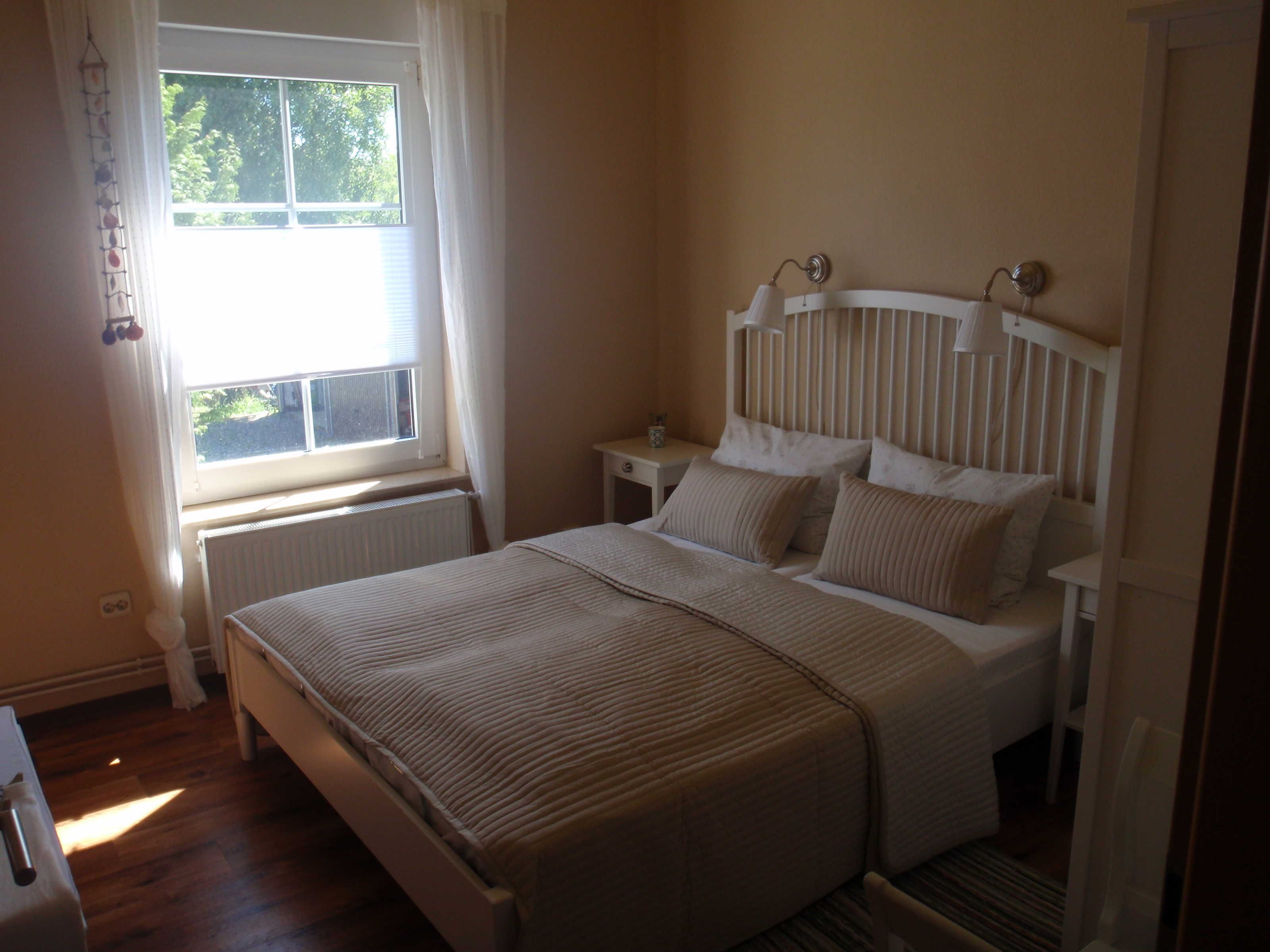 • Im größeren Schlafzimmer steht ein Doppelbett und ein Kleiderschrank , im kleineren ein Einzelbett mit möglicher Aufbettung , eine kleine Sitzgruppe und ein Kleiderschrank