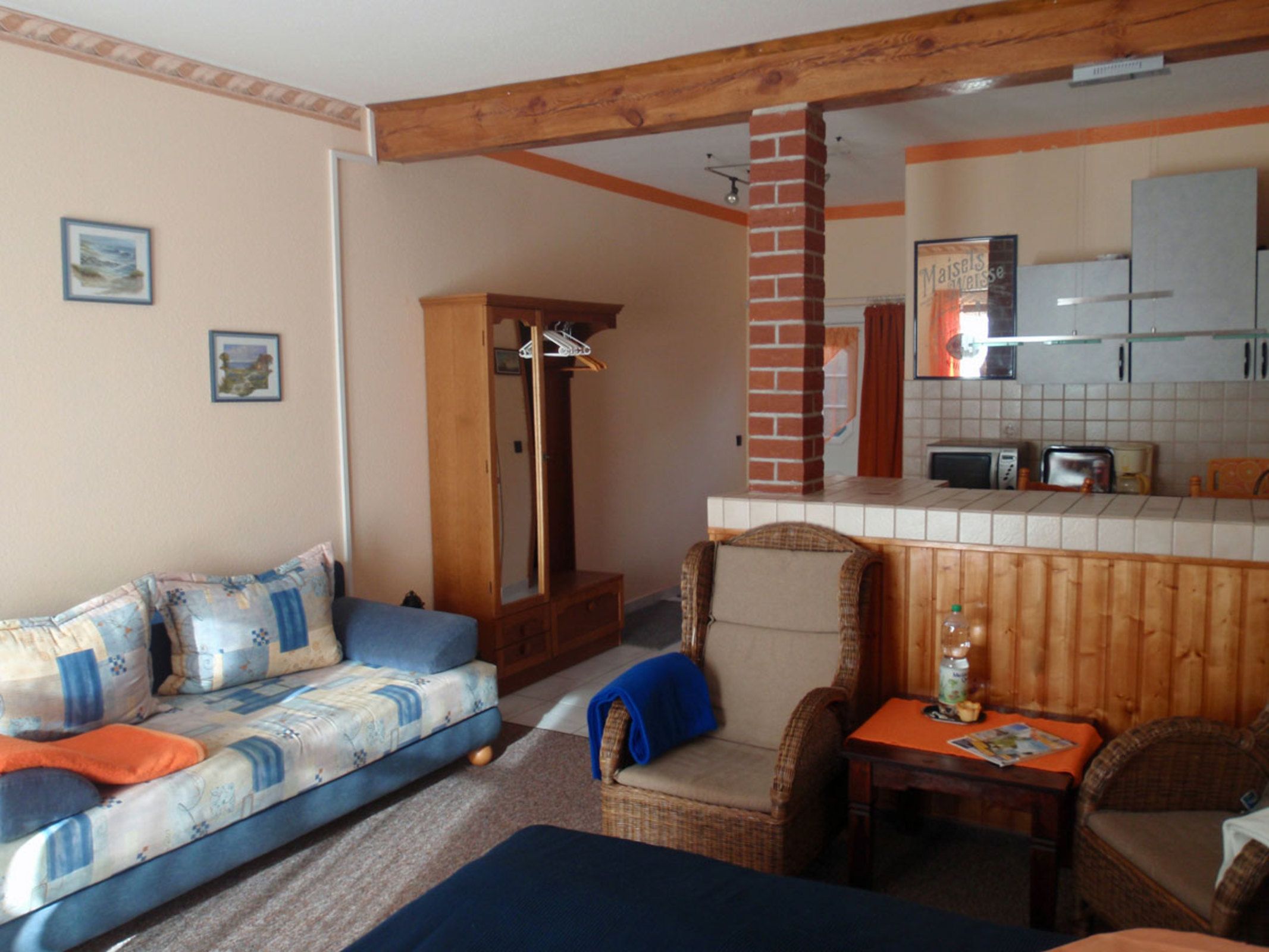 Kleine Fewo ca.35 qm groß besteht aus einem komb. Wohn-/ Schlafraum mit einer Doppelbettliege und einer Einzelliege sowie einer Küchenzeile mit Bartresen. Ausstattung: Radio, TV, Bettwäsche,Handtücher, Kaffeemaschine, Mikrowelle, Du/WC, Terrasse mit Gartenmöbel, PKW-Stellplatz, Haustiere sind willkommen. W-LAN-Nutzung auf Anfrage möglich.