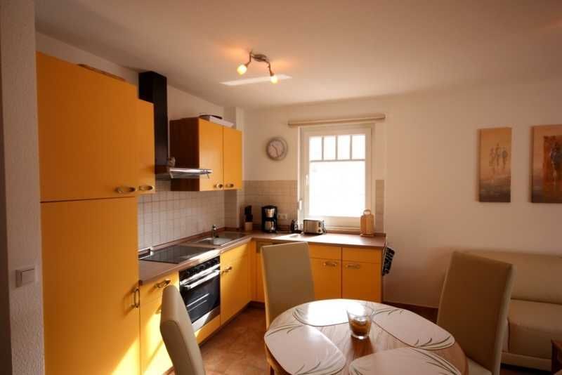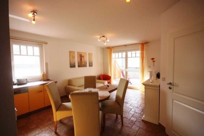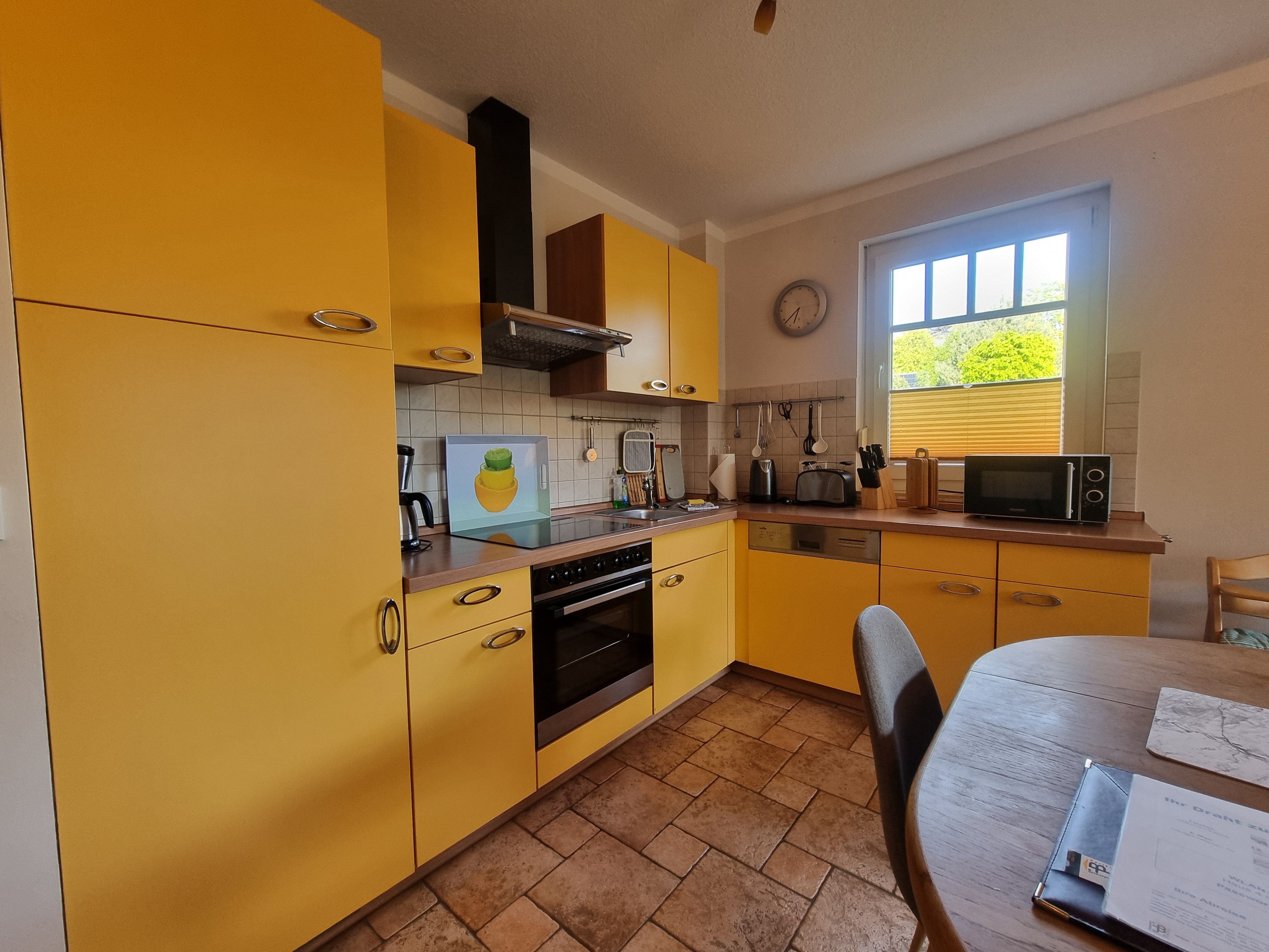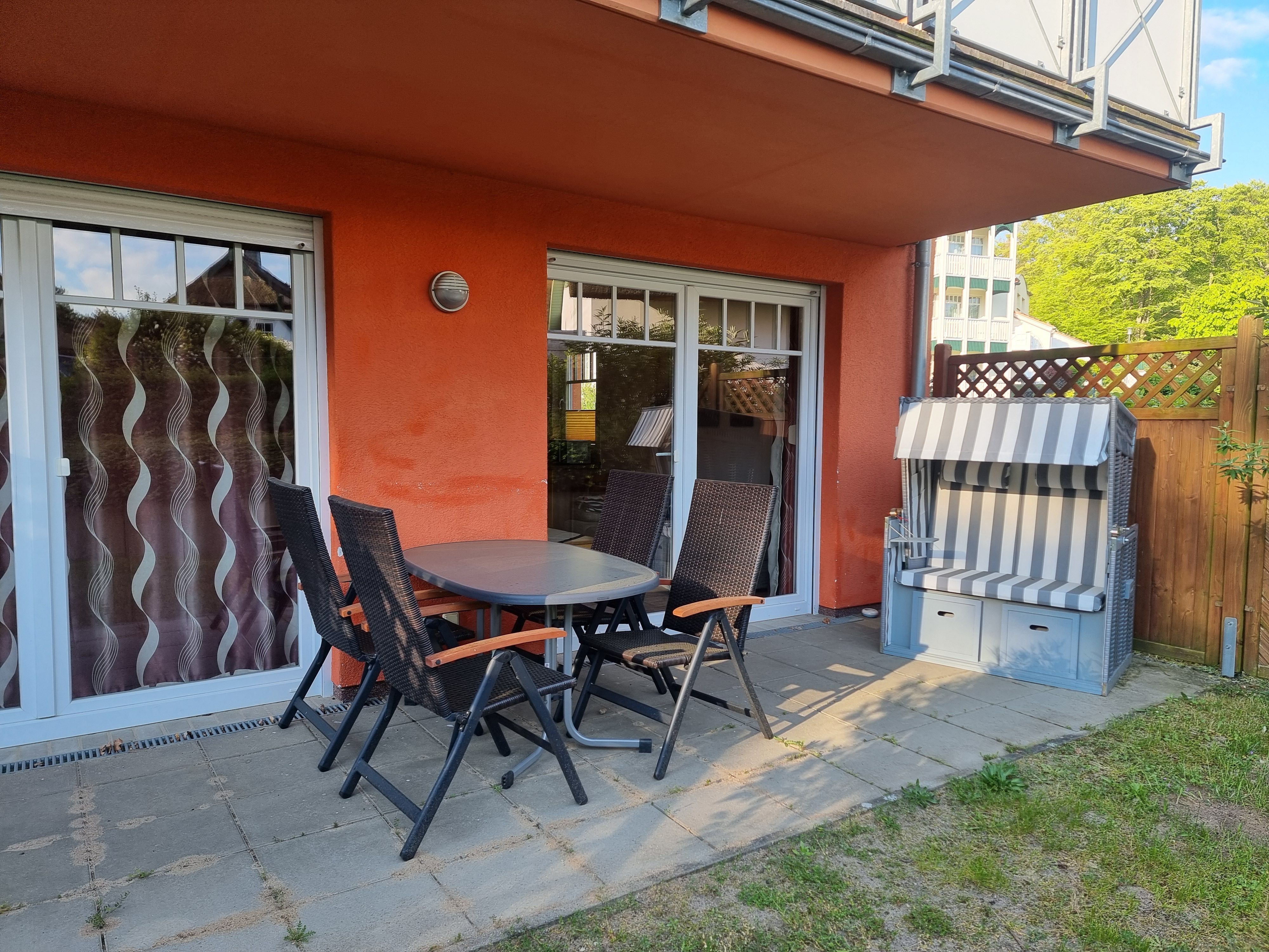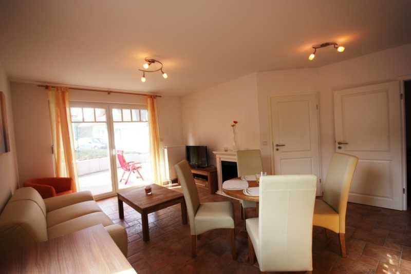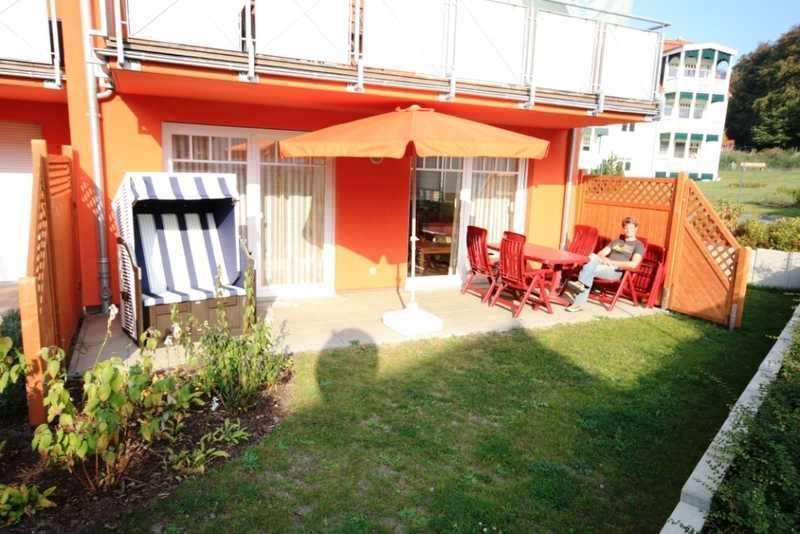Die Ferienwohnung liegt im Erdgeschoß des Ferienhauses. Sie besteht aus Wohnzimmer, kompl. ausgestatteter Küche, Schlafzimmer und Tageslichtbad mit Waschmaschine. Die Ausstattung der Einbauküche ist neuwertig funktional und qualitativ hochwertig unter anderem mit Toaster, Kaffeemaschine, Herd, Cerankochfeld, Geschirrspüler, Gefrierfach. Große Süd-Terrasse mit Blick auf den Küstenwald und eigenem Gartenabschnitt, große Spielwiese, Grill. Diese Ferienwohnung ist mit einer kleinen privaten Sauna ausgestattet, die gegen Gebühr zugebucht werden kann. Eine Waschmaschine für den Eigengebrauch vervollständigt die Ausstattung.