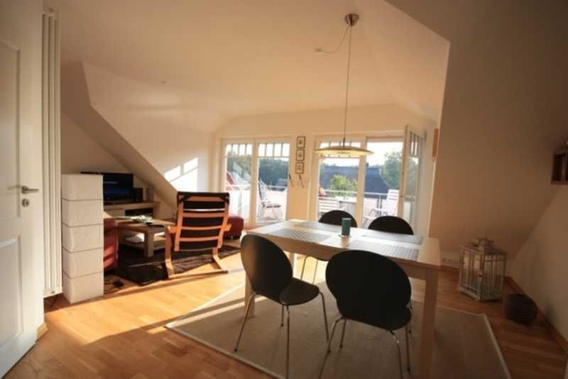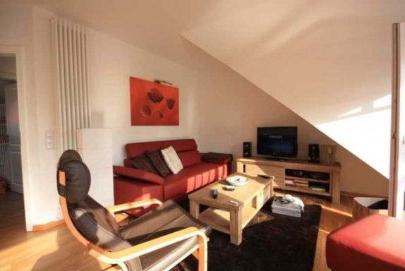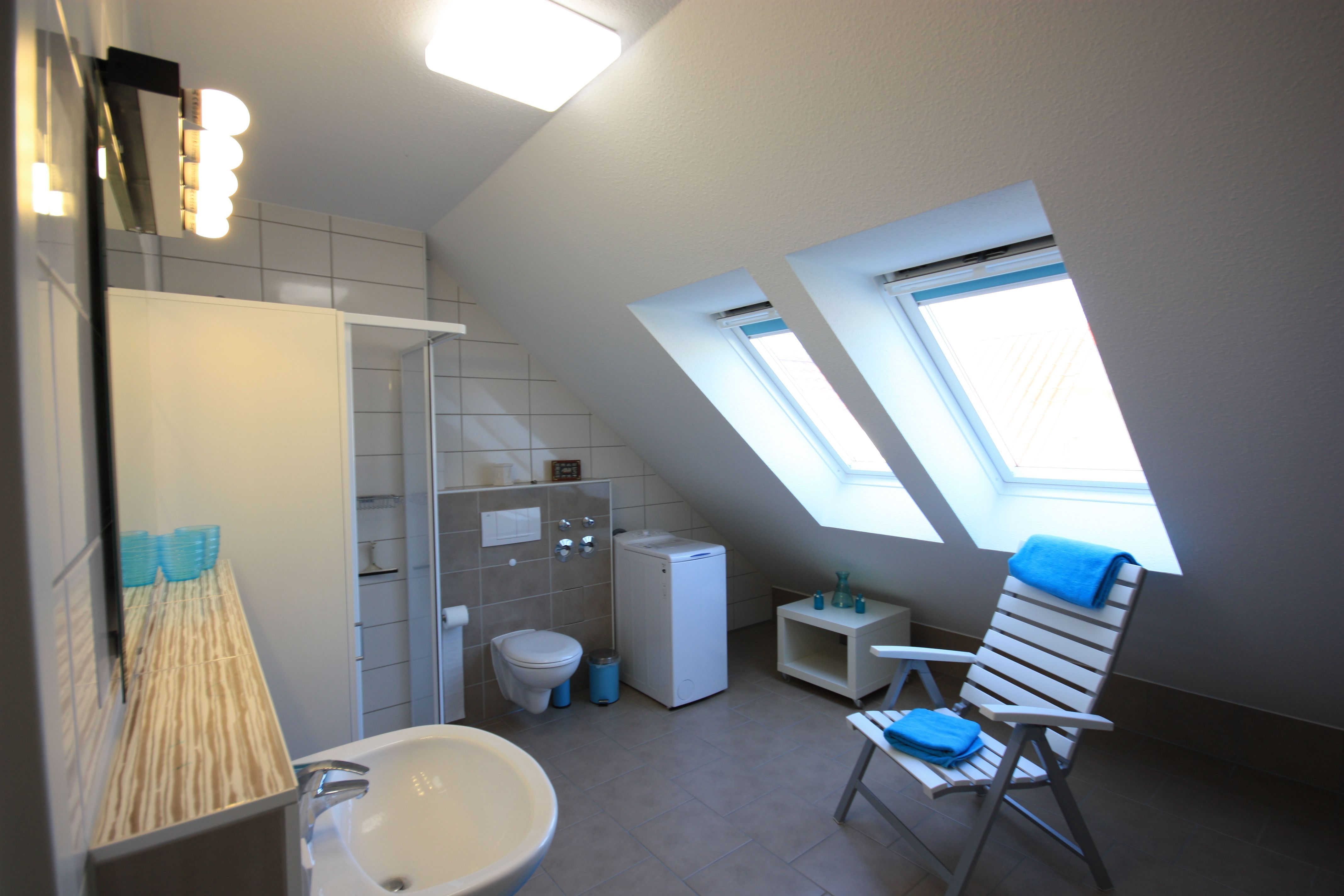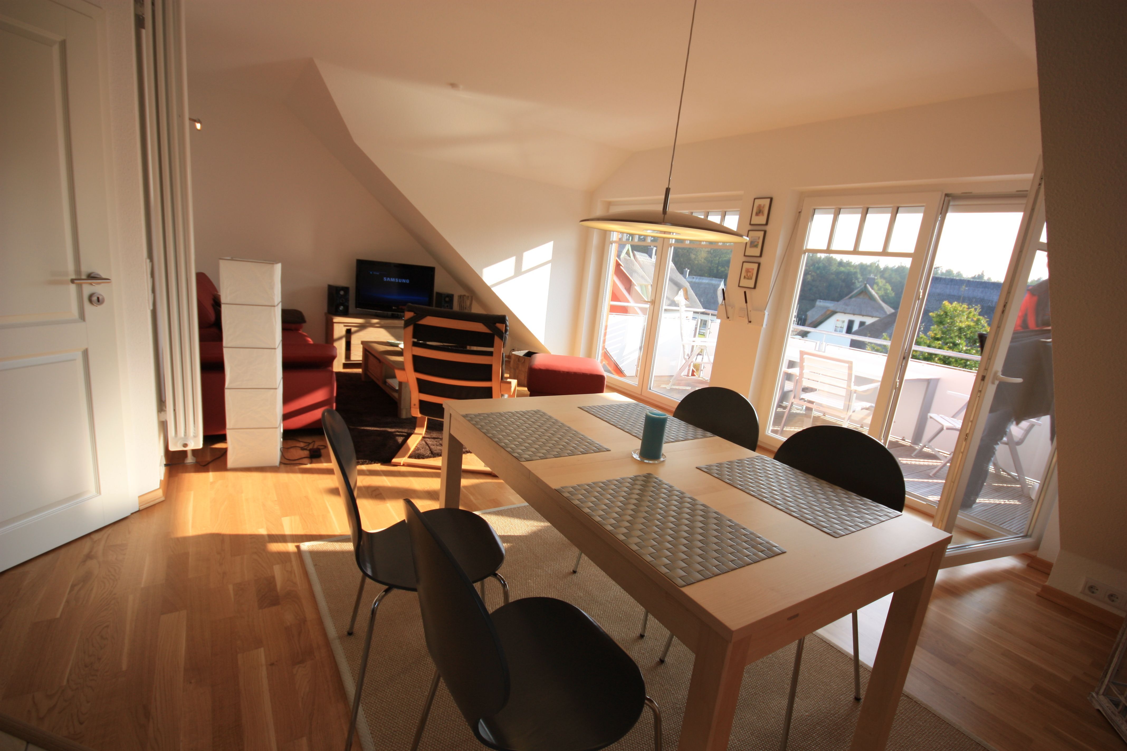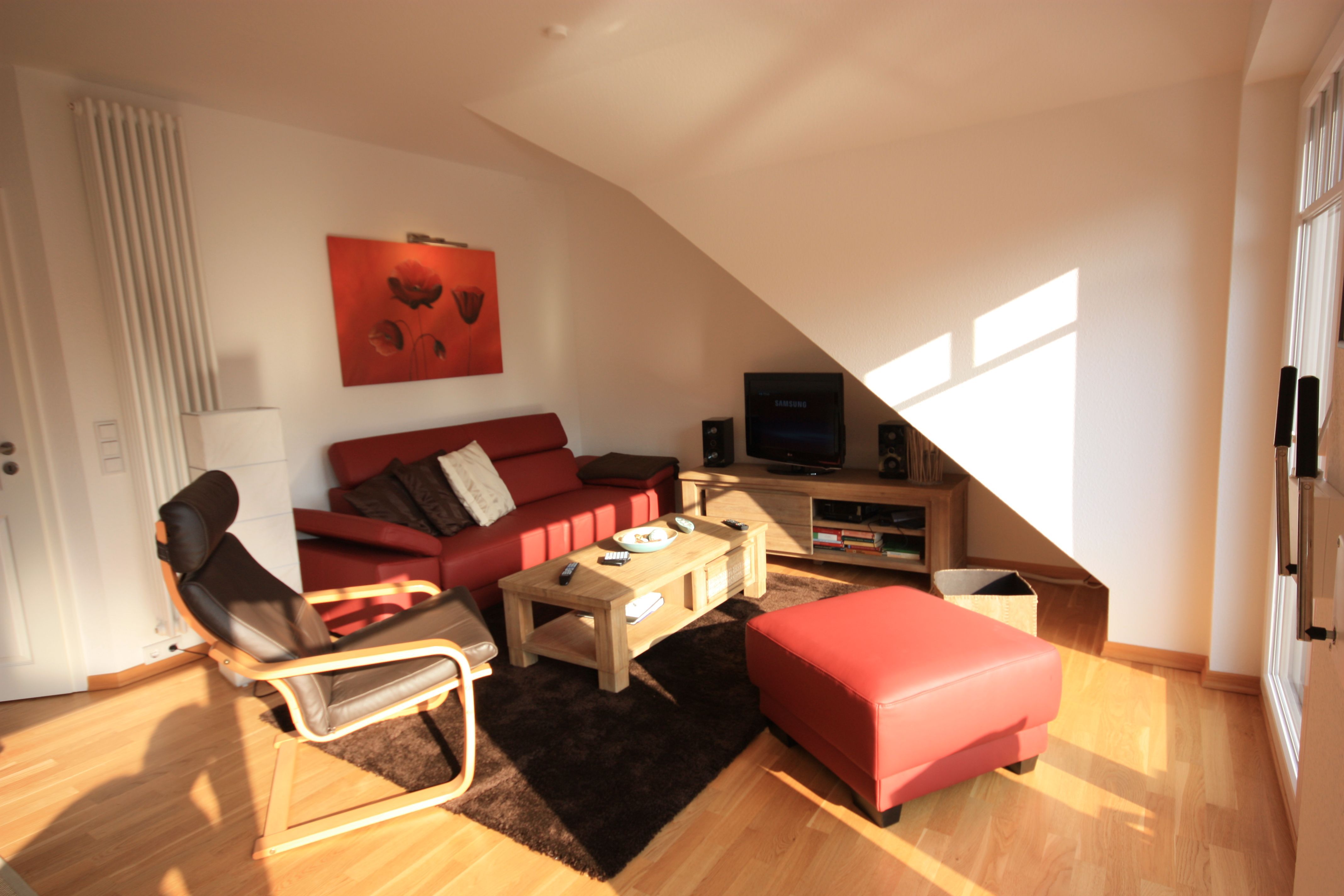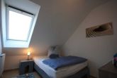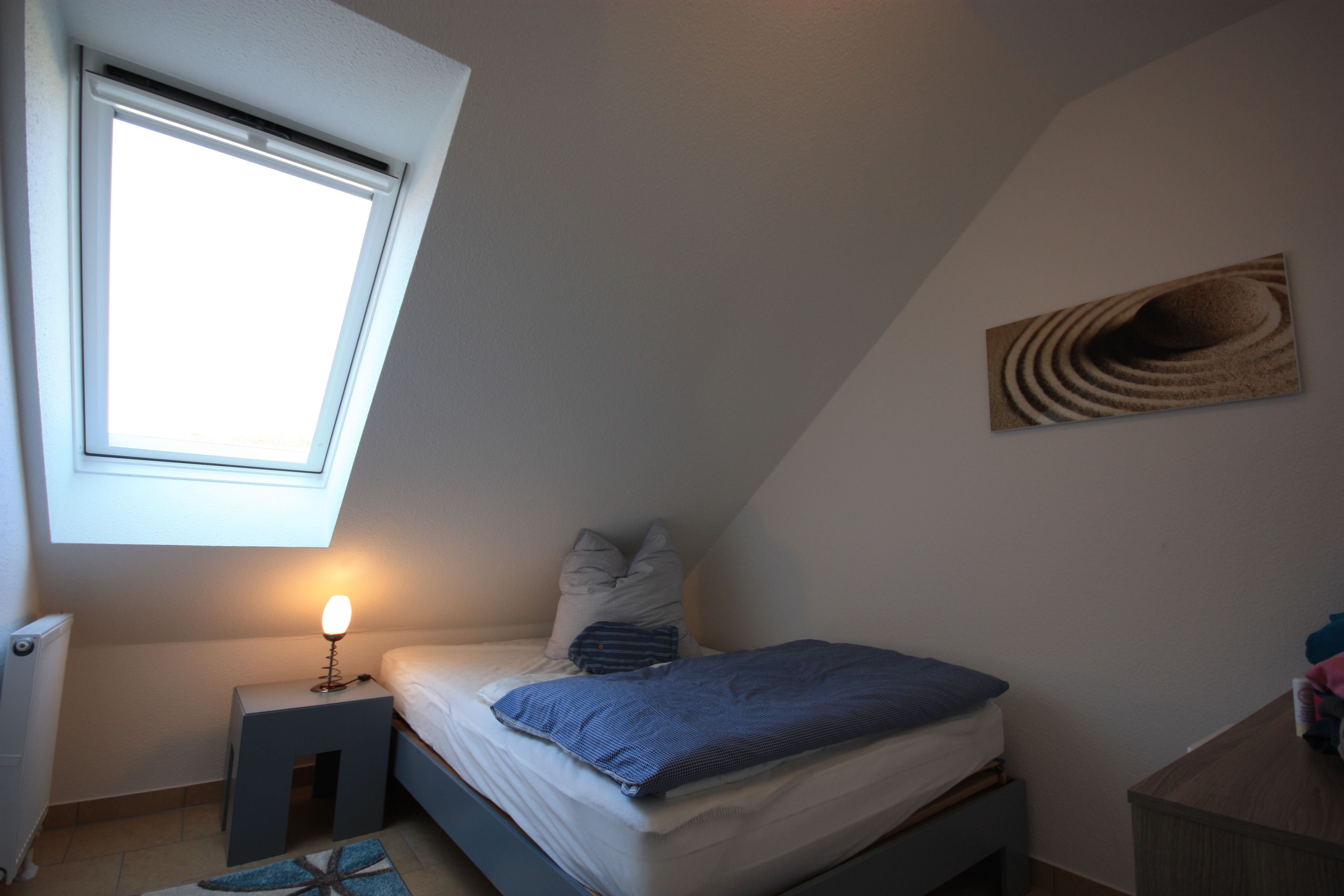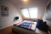 Die Wohnung liegt im Dachgeschoß des Ferienhauses. Sie verfügt über ein Schlafzimmer mit Doppelbett sowie ein weiteres Zimmer mit Einzelbett. Im Wohnzimmer steht alternativ eine Schlafcouch zur Verfügung. Die Fewo besitzt eine Waschmaschine. In der Küche steht eine Senseo Kaffemaschine für Pads zur Verfügung sowie eine herkömmliche Filtermaschine. Haustiere sind nicht zugelassen.