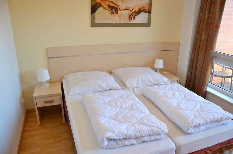 Die Ferienwohnung erstreckt sich über 2 Etagen, ist sehr geräumig und komfortabel eingerichtet. Im 1.OG befindet sich das Wohnzimmer mit Flachbild TV, Radio, DVD Player, einem schönen Balkon, ein Bad mit Dusche, WC und Fön. Die offene Einbauküche ist mit einem Geschirrspüler, Ceranherd, Backofen, Kühlschrank, Tiefkühlfach, Gläser, Besteck und Geschirr ausgestattet. Die obere Etage mit zwei Schlafzimmern und einem zweiten Bad mit Dusche und WC, bietet einen weiteren Balkon, auf dem man gemütlich den Tag ausklingen lassen kann. In der kalten Jahreszeit sorgt eine Fußbodenheizung für behagliche Wärme.
