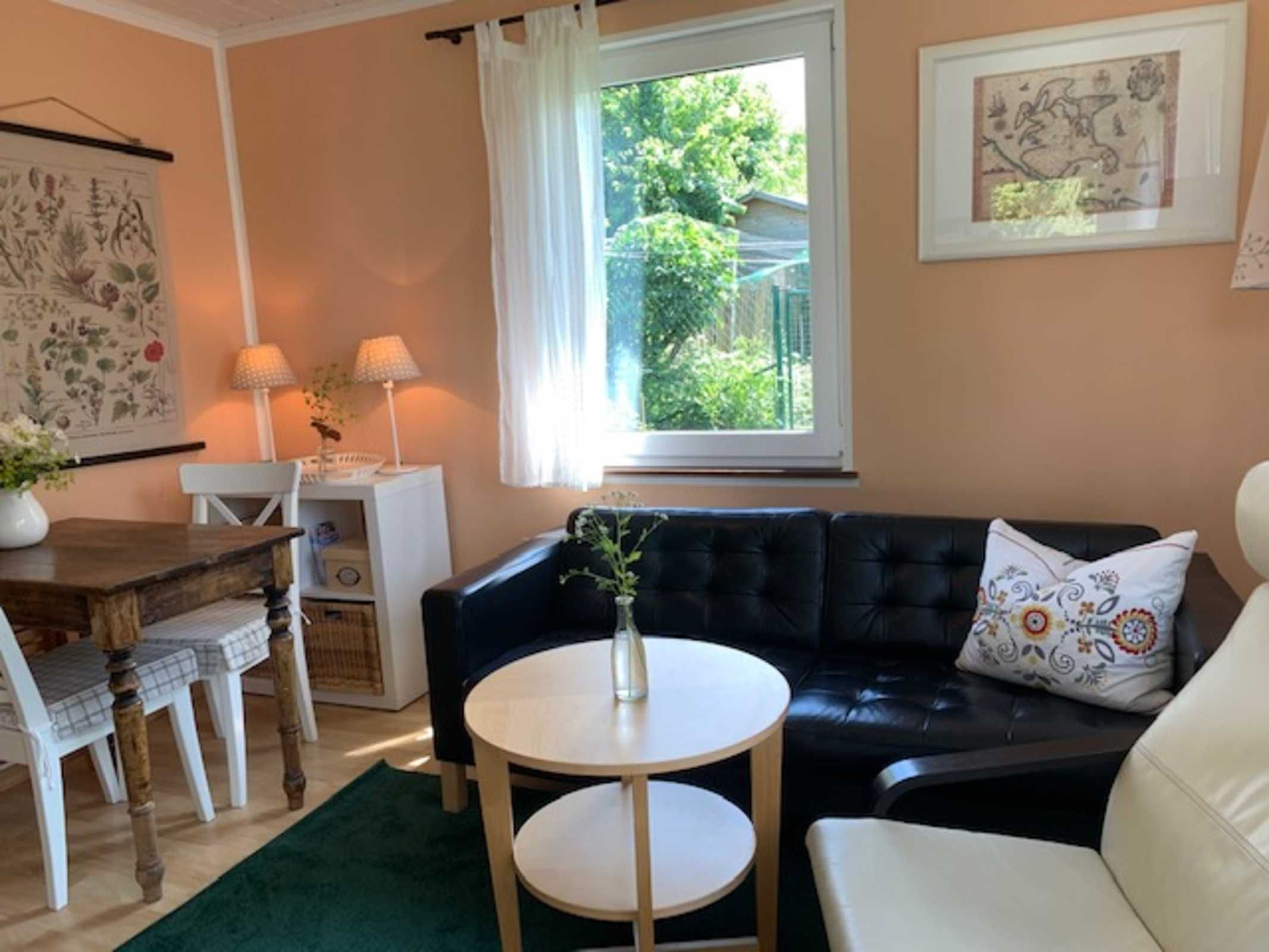 Das gemütlich eingerichte Wohnzimmer verfügt über eine Couchgarnitur, Fernseher, Radio mit CD-Player und ein Esstisch für 4 Personen.