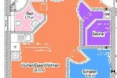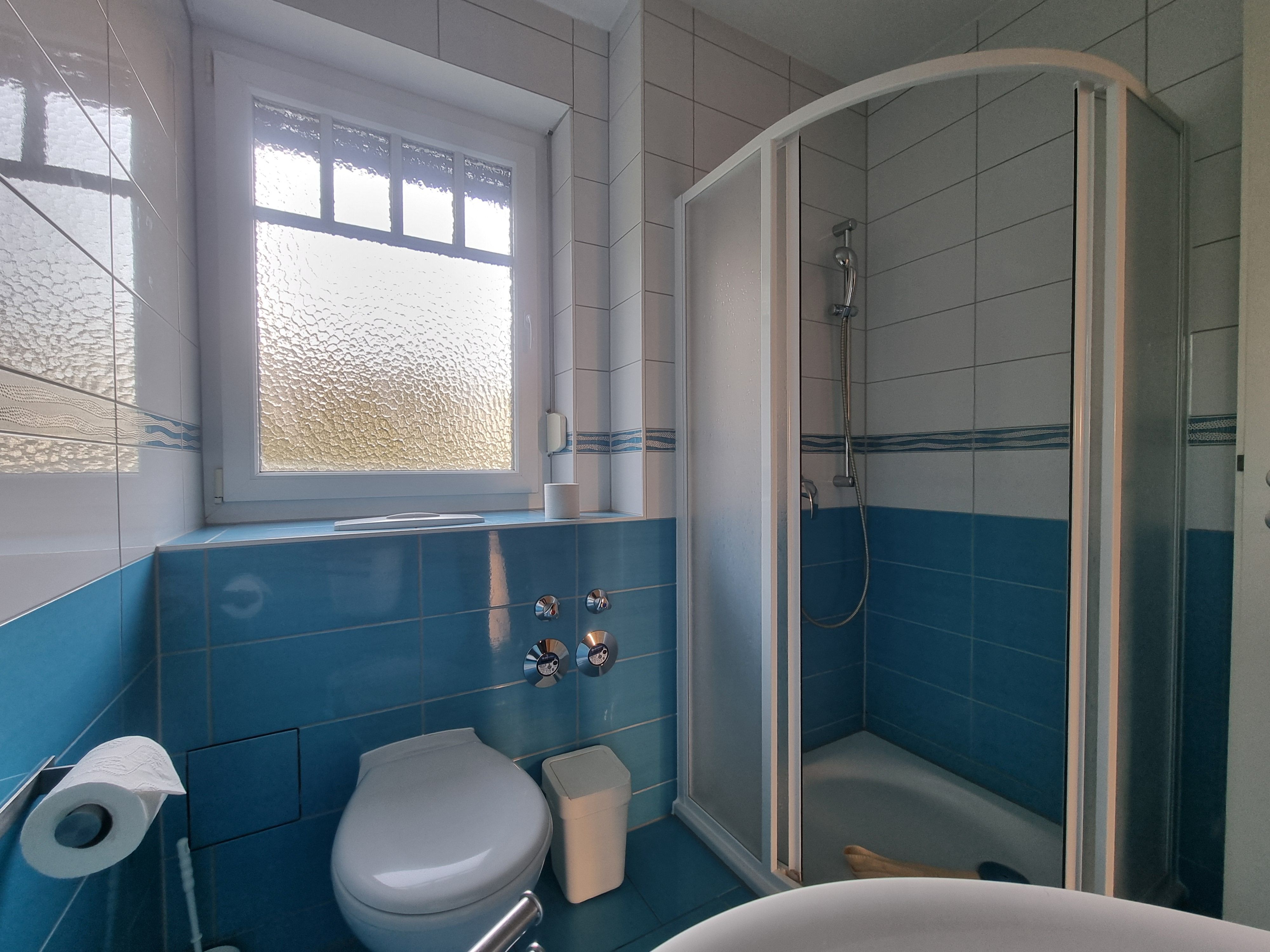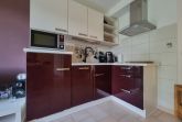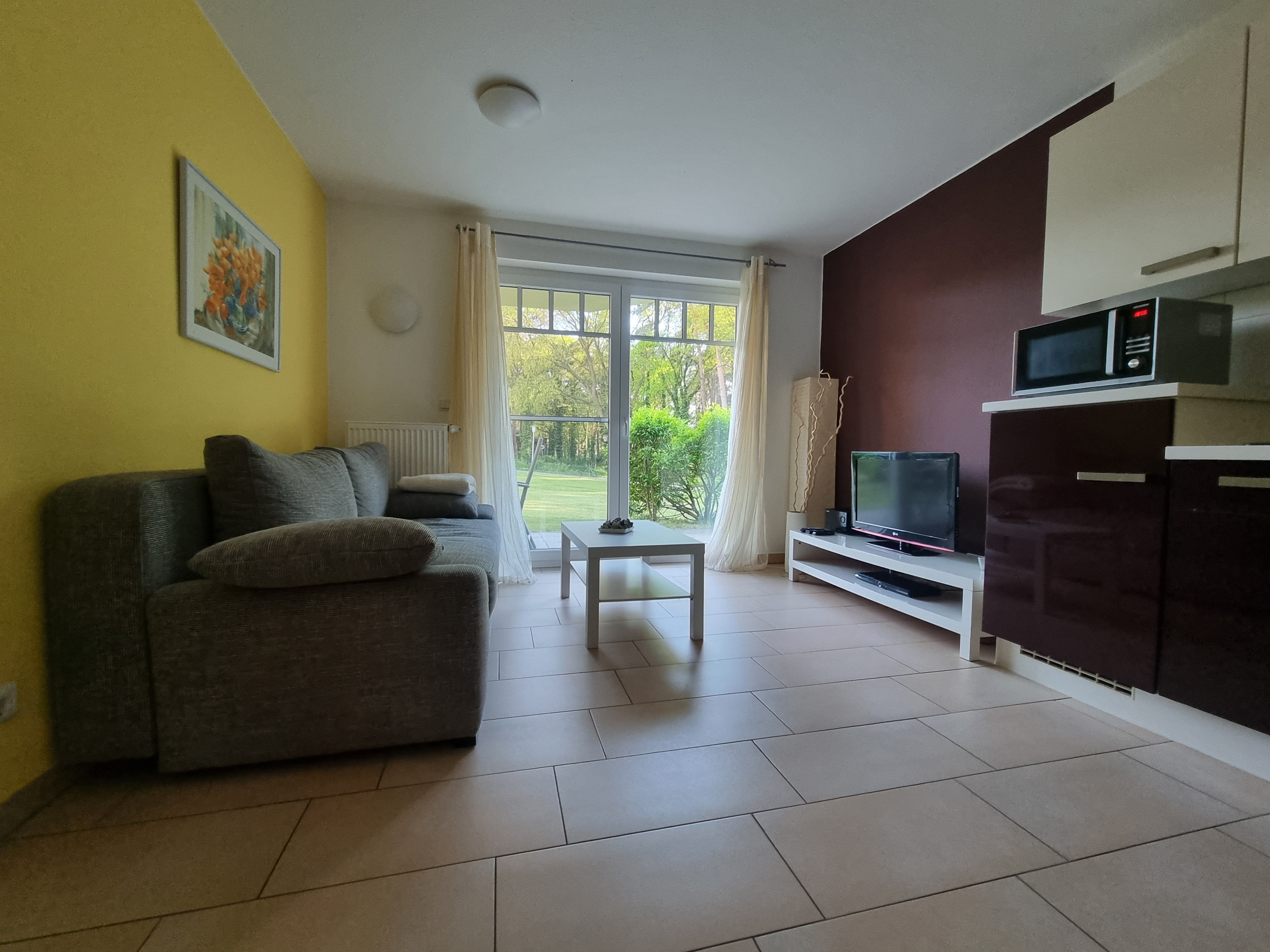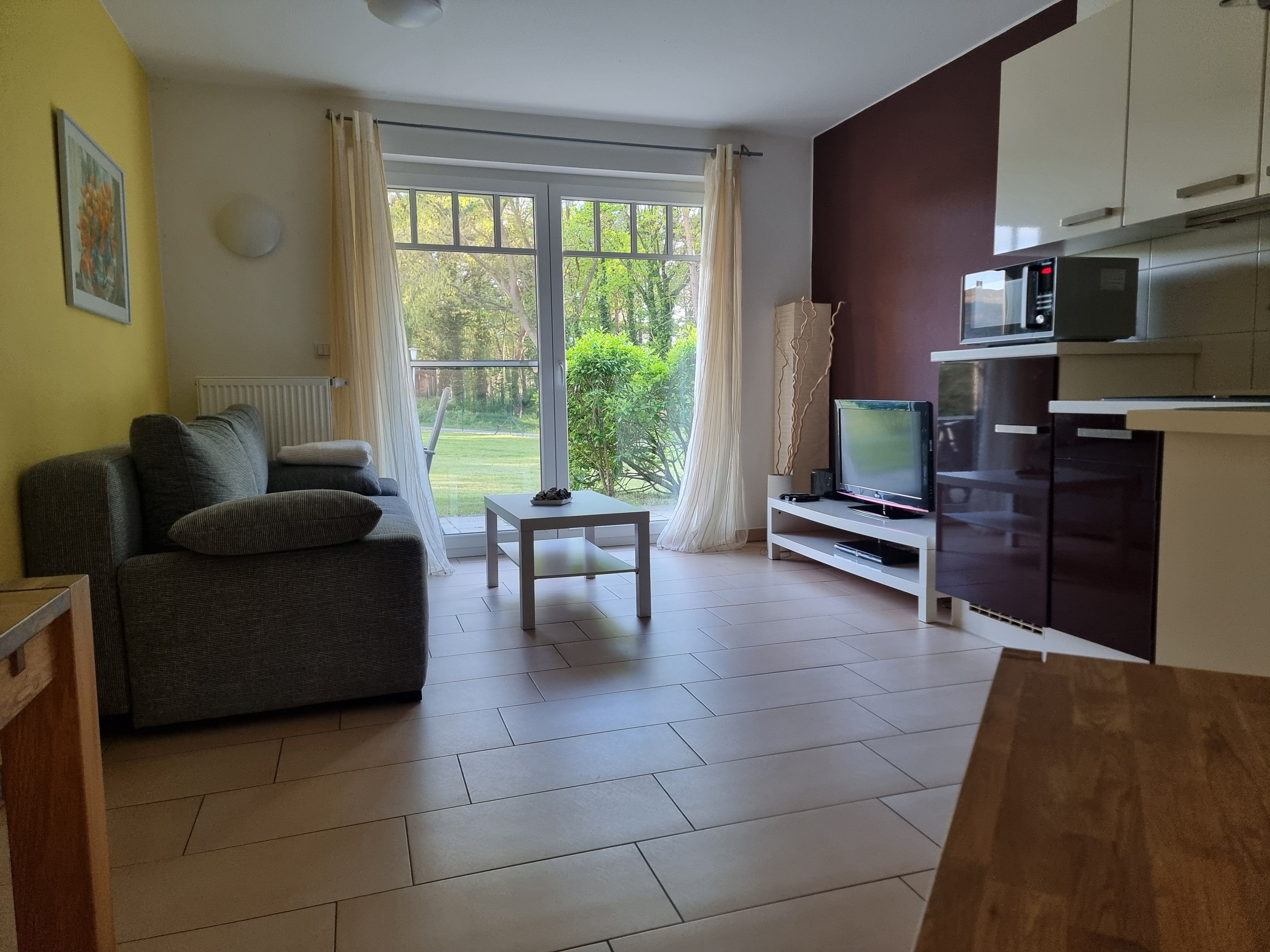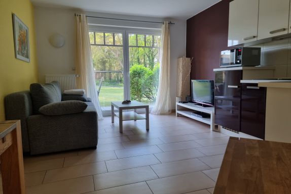 Die Ferienwohnung liegt im Erdgeschoß des Ferienhauses. Sie besteht aus Wohnzimmer, kompl. ausgestatteter Küche, Schlafzimmer und Tageslichtbad. Die Ausstattung der Einbauküche ist neuwertig funktional und qualitativ hochwertig unter anderem mit Toaster, Kaffeemaschine, Kochfeld, Geschirrspüler, Gefrierfach und Kompaktbackofen mit Mikrowelle, Grill- und Umluft- sowie Heißluftfunktion.