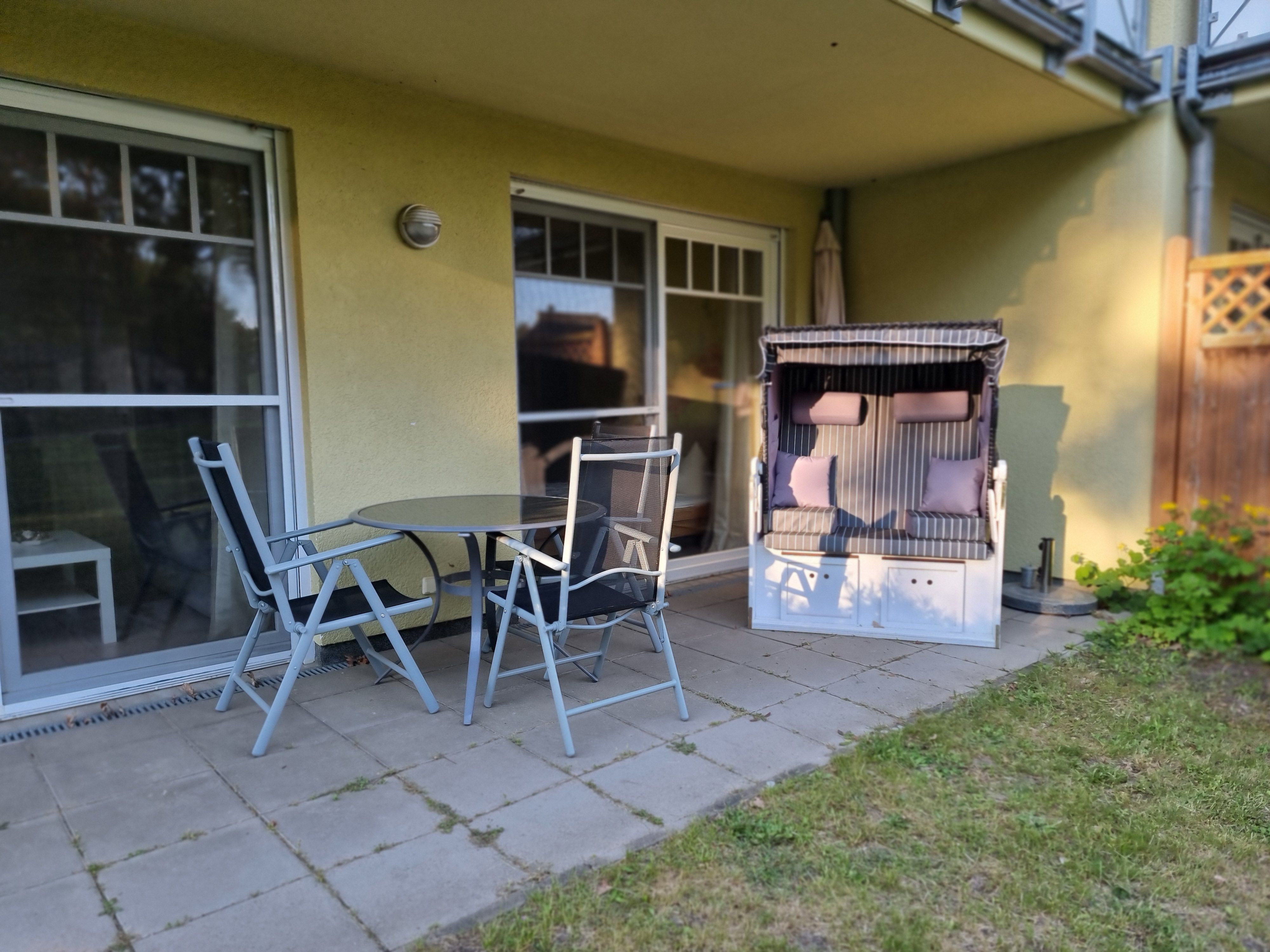 • Südterrasse mit Gartenmöbeln, Sonnenschirm, tlw. Strandkorb