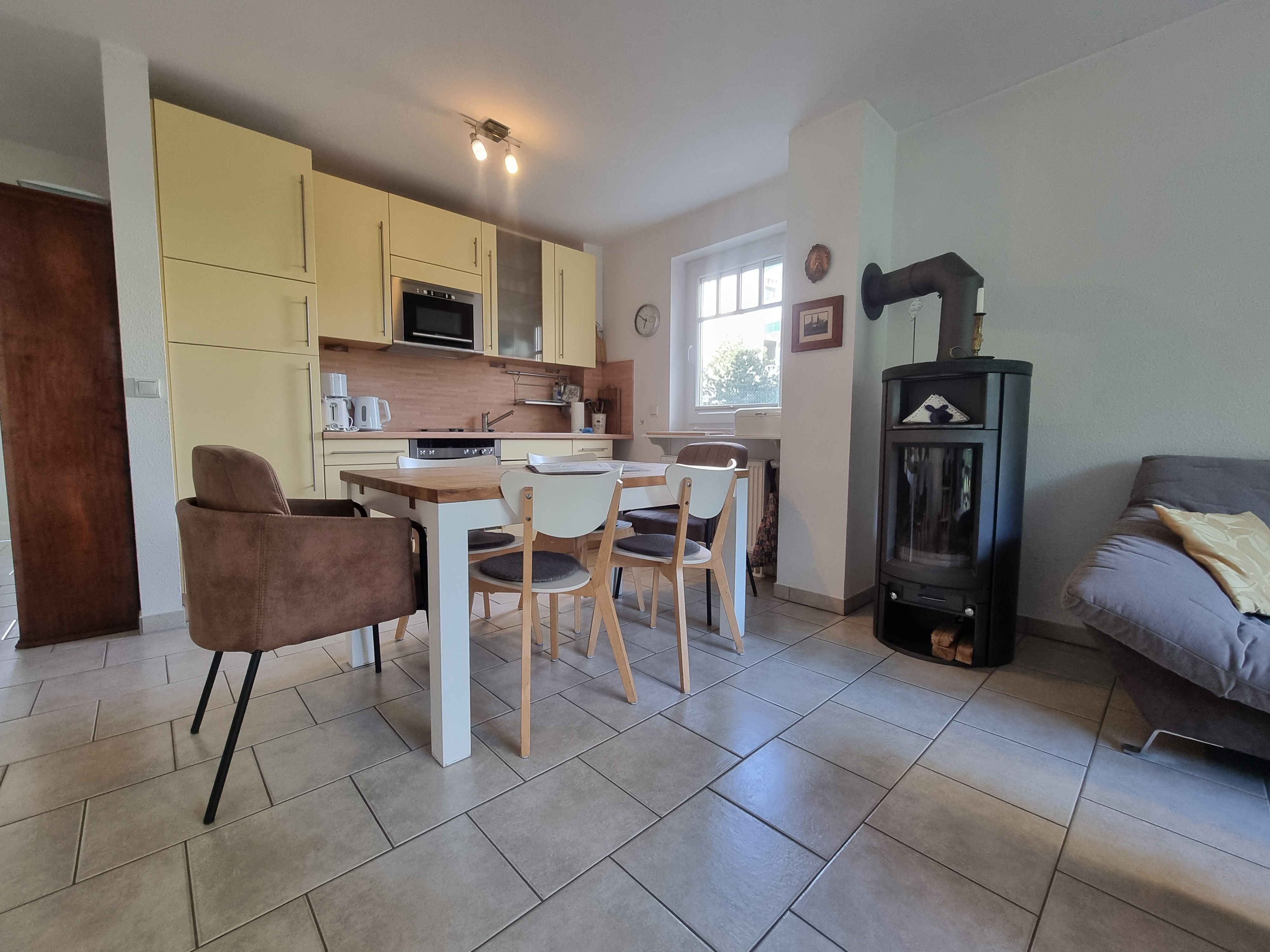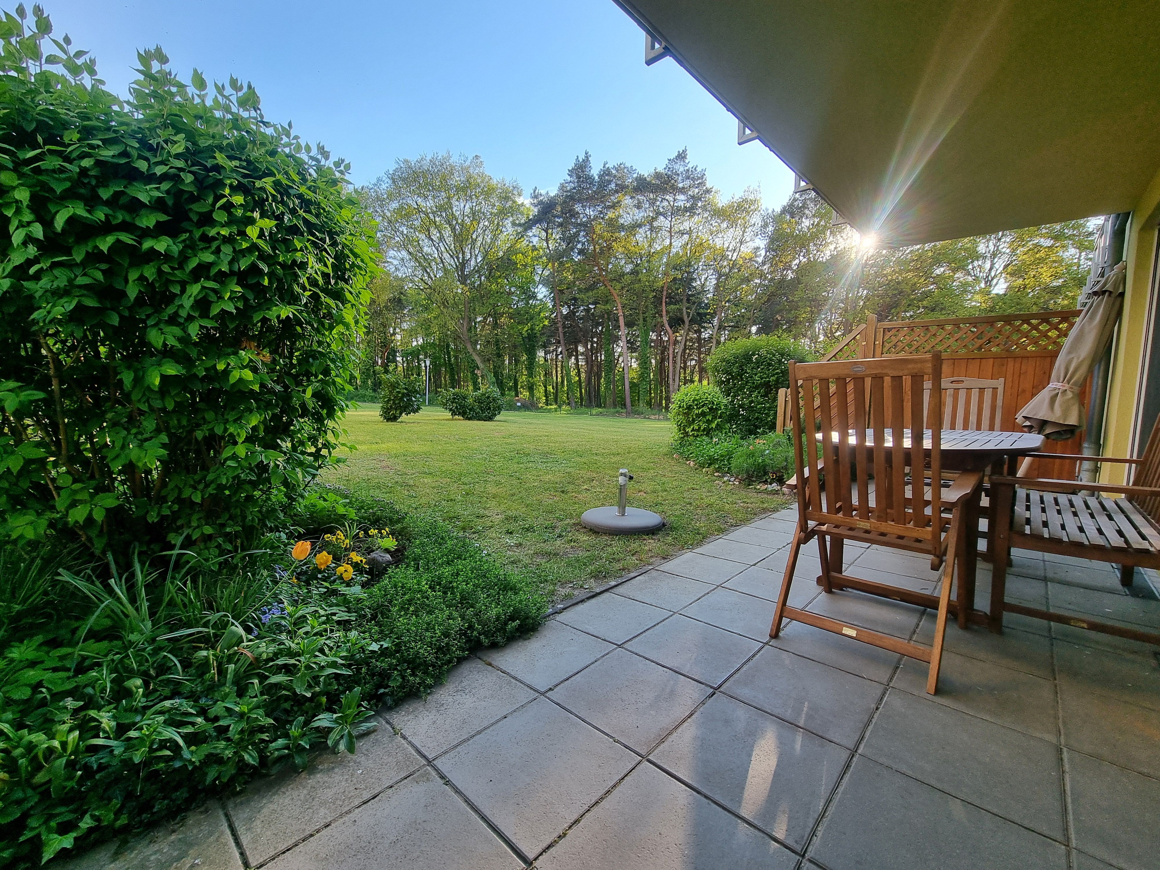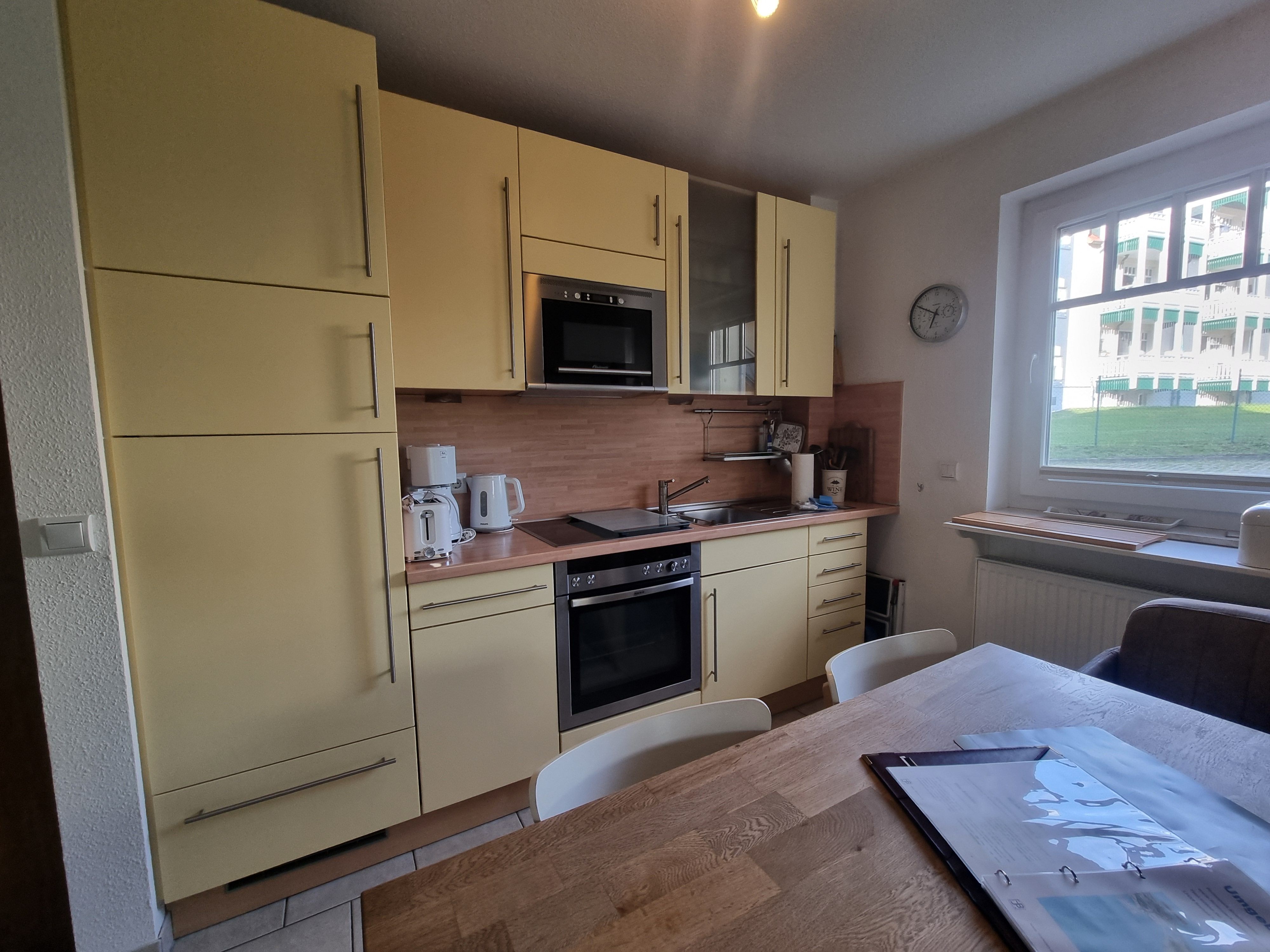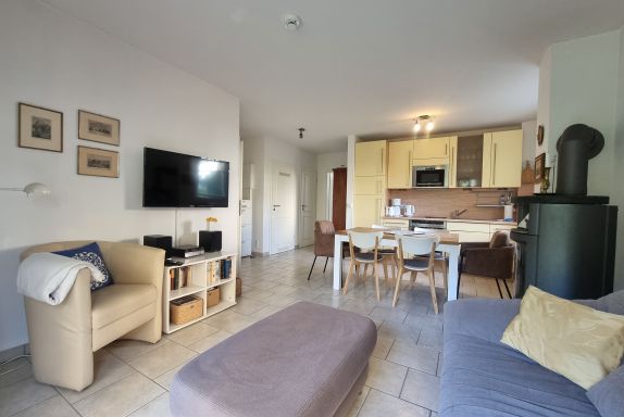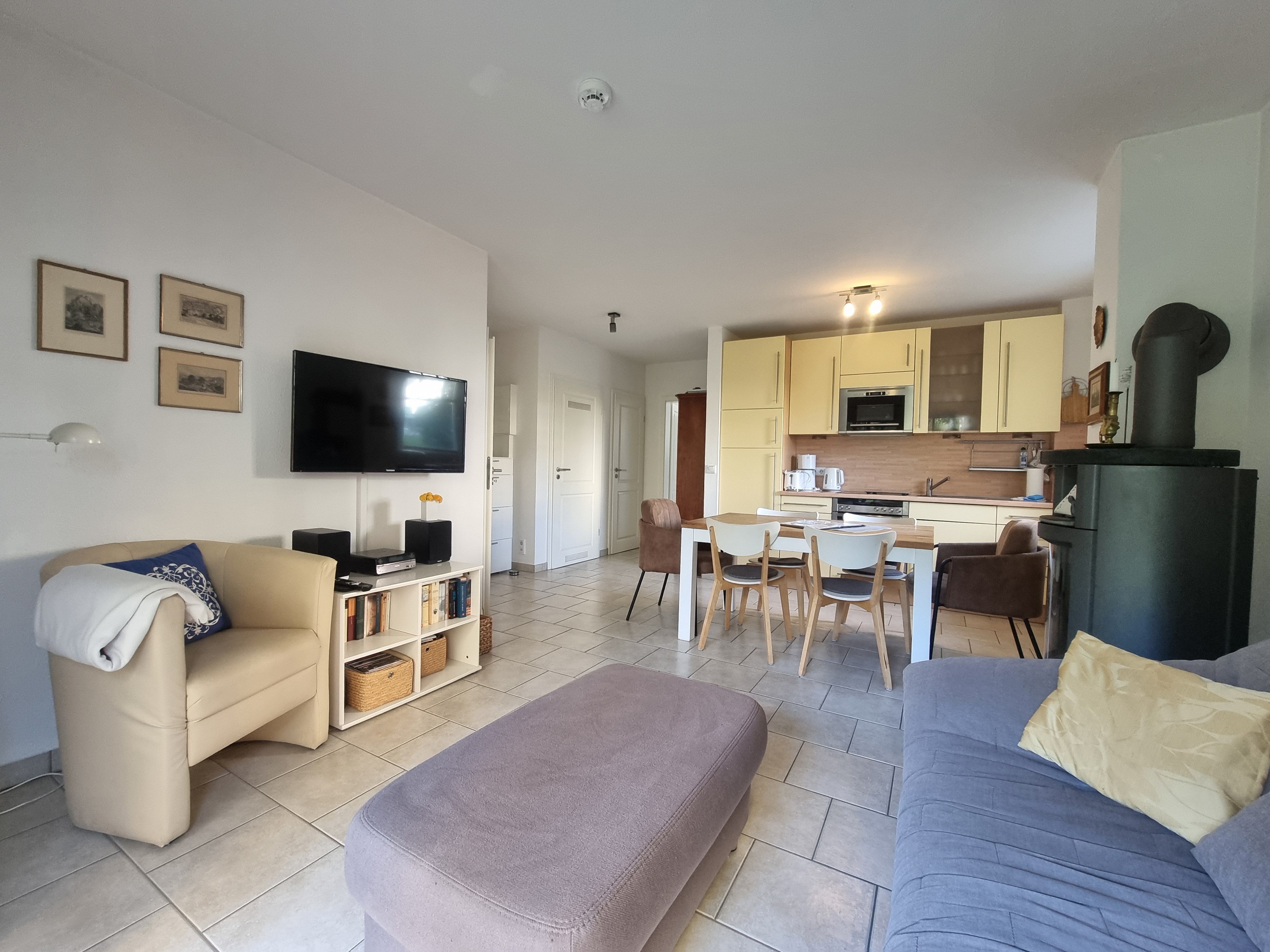 Die Ferienwohnung liegt im Erdgeschoß des Ferienhauses. Sie besteht aus Wohnzimmer, kompl. ausgestatteter Küche, Schlafzimmer und Tageslichtbad. Die Ausstattung der Einbauküche ist neuwertig funktional und qualitativ hochwertig unter anderem mit Toaster, Kaffeemaschine, Backofen mit Heißluft, Kochfeld, Geschirrspüler, Gefrierfach. Große Süd-Terrasse mit Blick auf den Küstenwald, große Spielwiese. Grillplatz