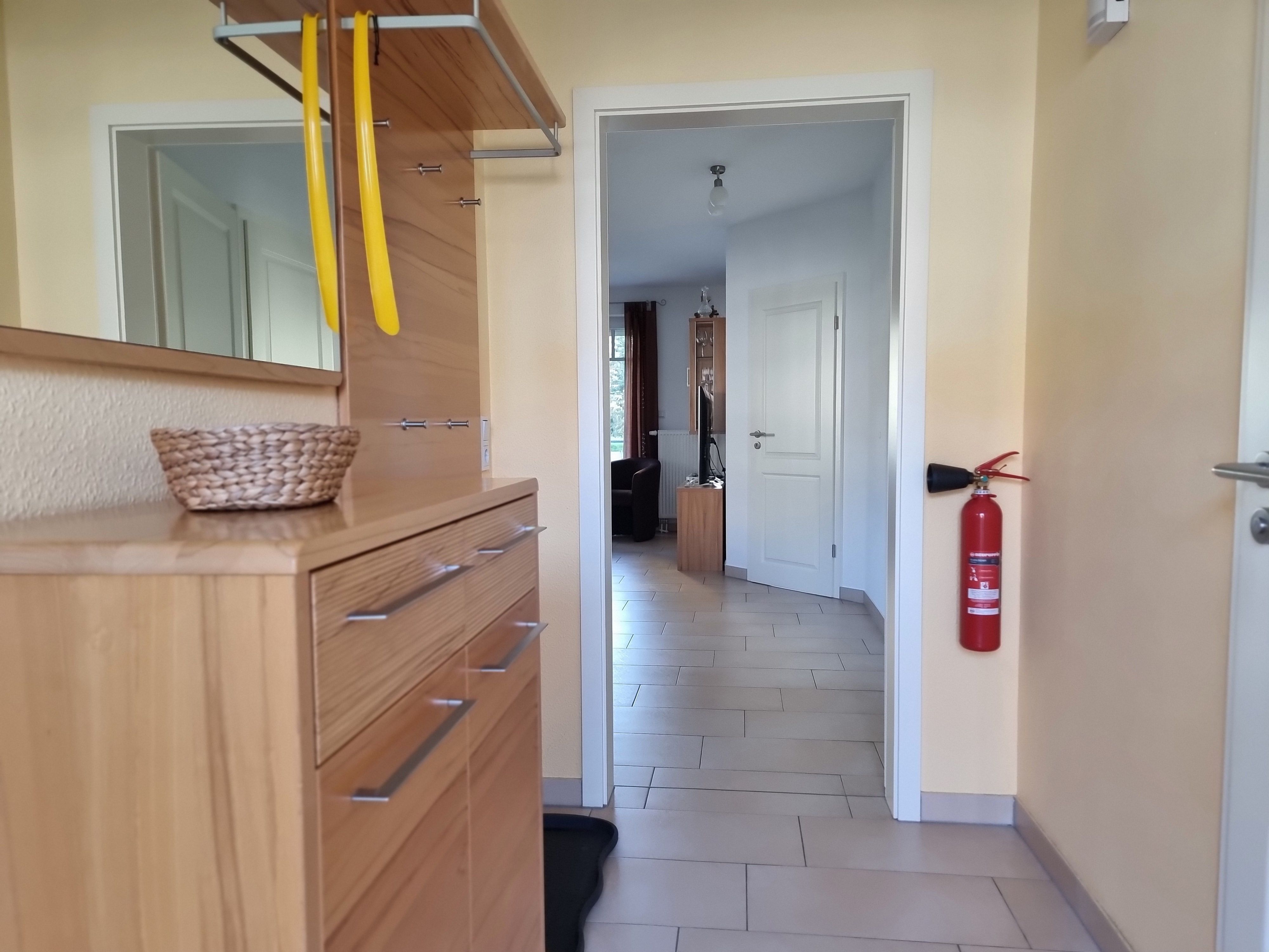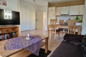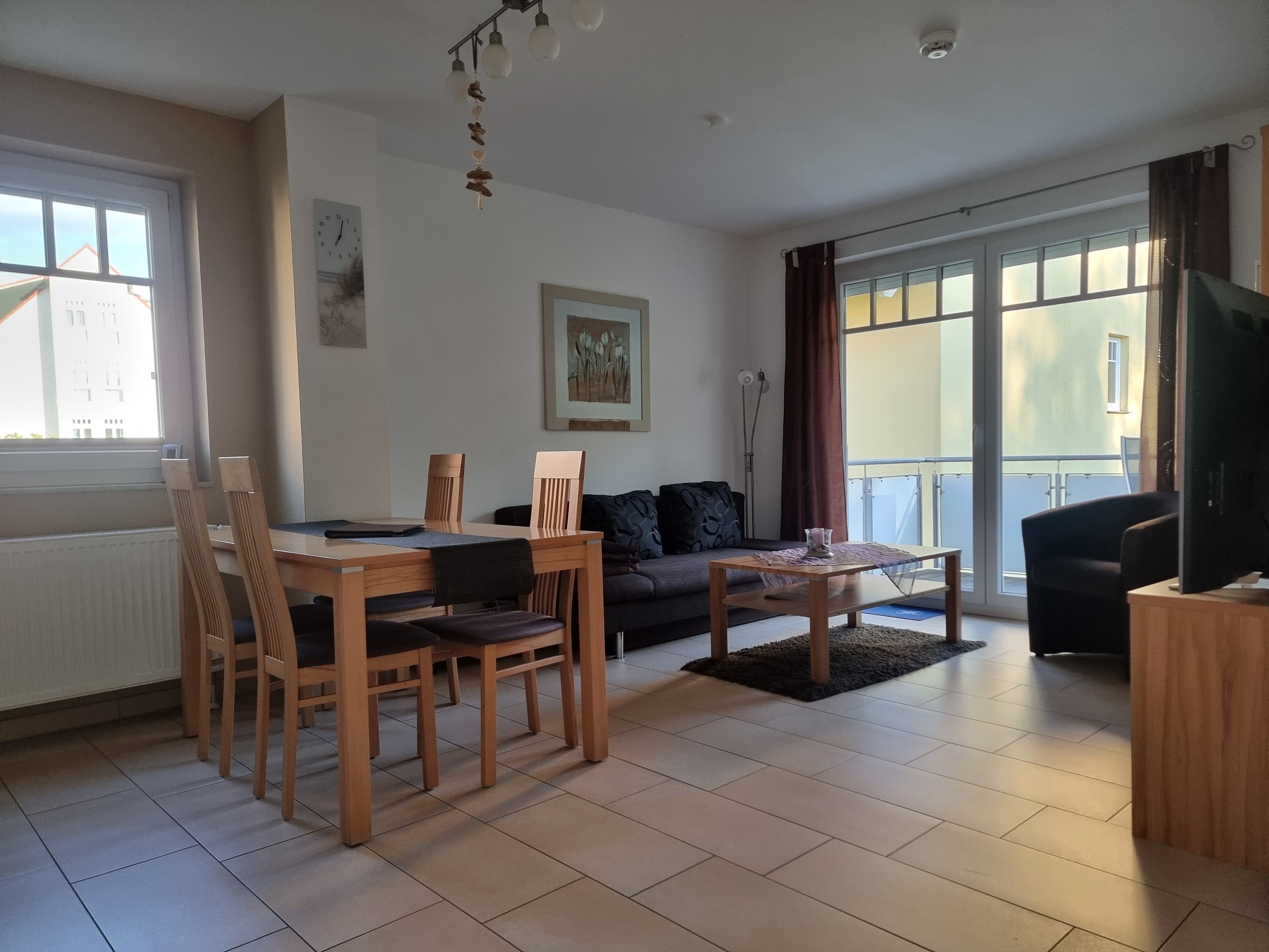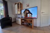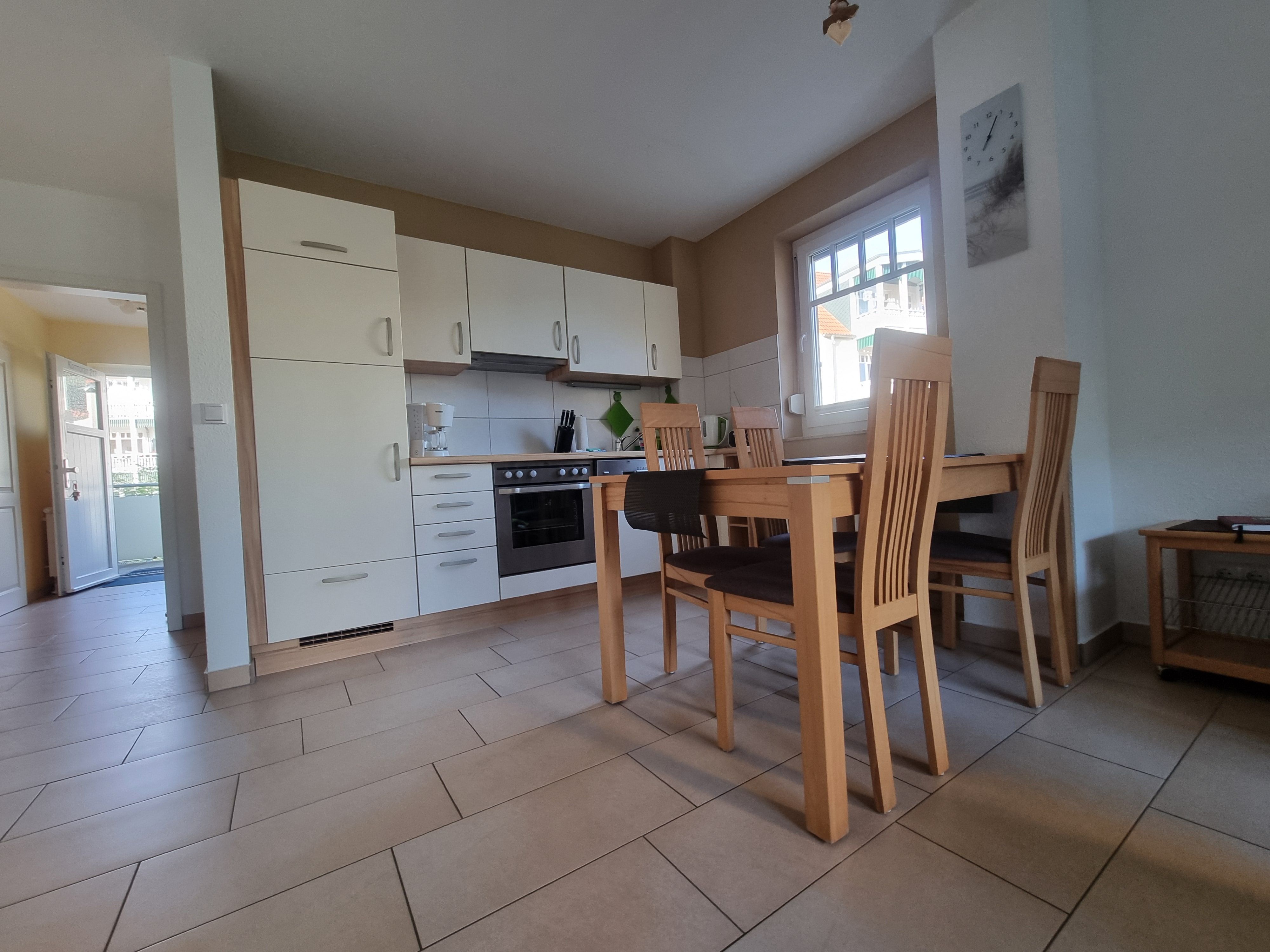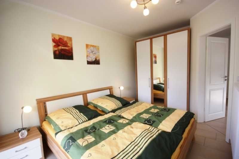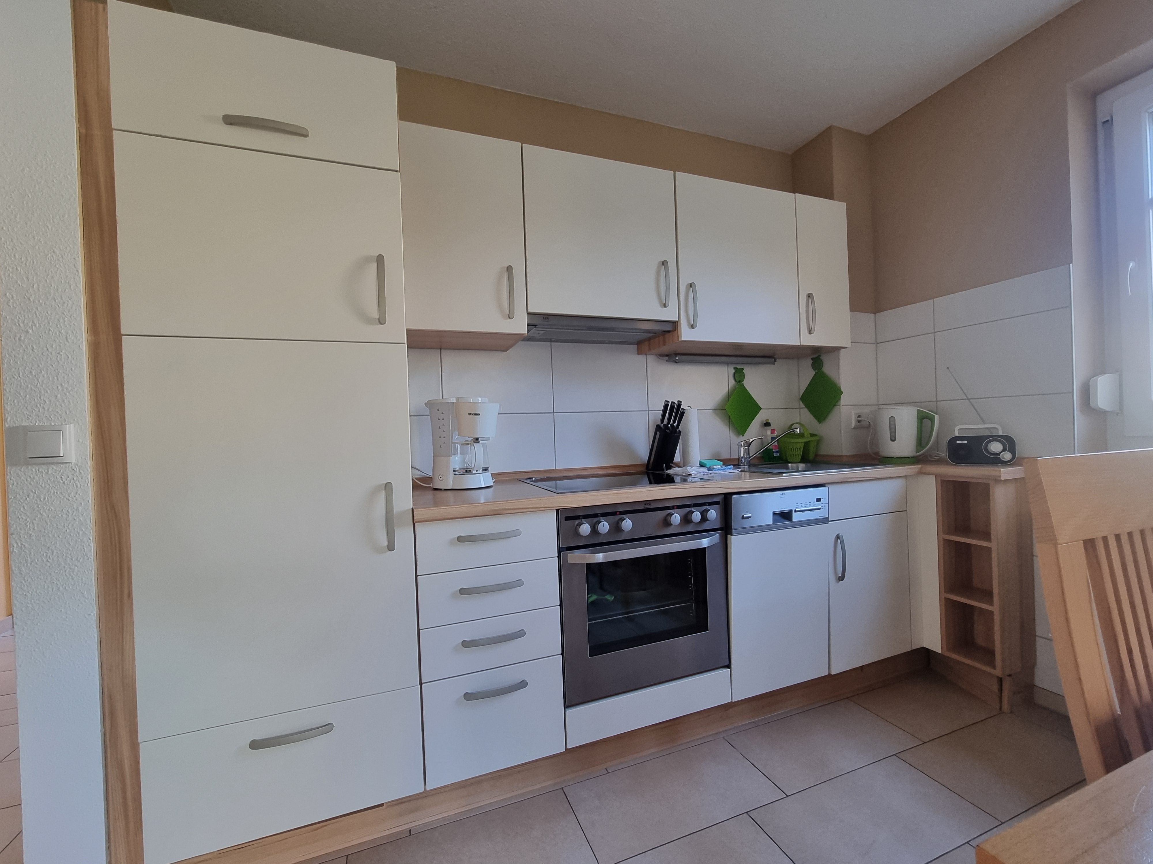 Die Wohnung verfügt über ein Schlafzimmer mit Doppelbett und ein Schlafzimmer mit 2 Einzelbetten. Die Ferienwohnung liegt im 1. Geschoß des Ferienhauses. Sie besteht aus Wohnzimmer, kompl. ausgestatteter Küche, Schlafzimmer und Tageslichtbad. Die Ausstattung der Einbauküche ist neuwertig funktional und qualitativ hochwertig unter anderem mit Toaster, Kaffeemaschine, Backofen mit Heißluft, Kochfeld, Geschirrspüler, Gefrierfach. Großer Südbalkon mit Blick auf den Küstenwald, große Spielwiese.