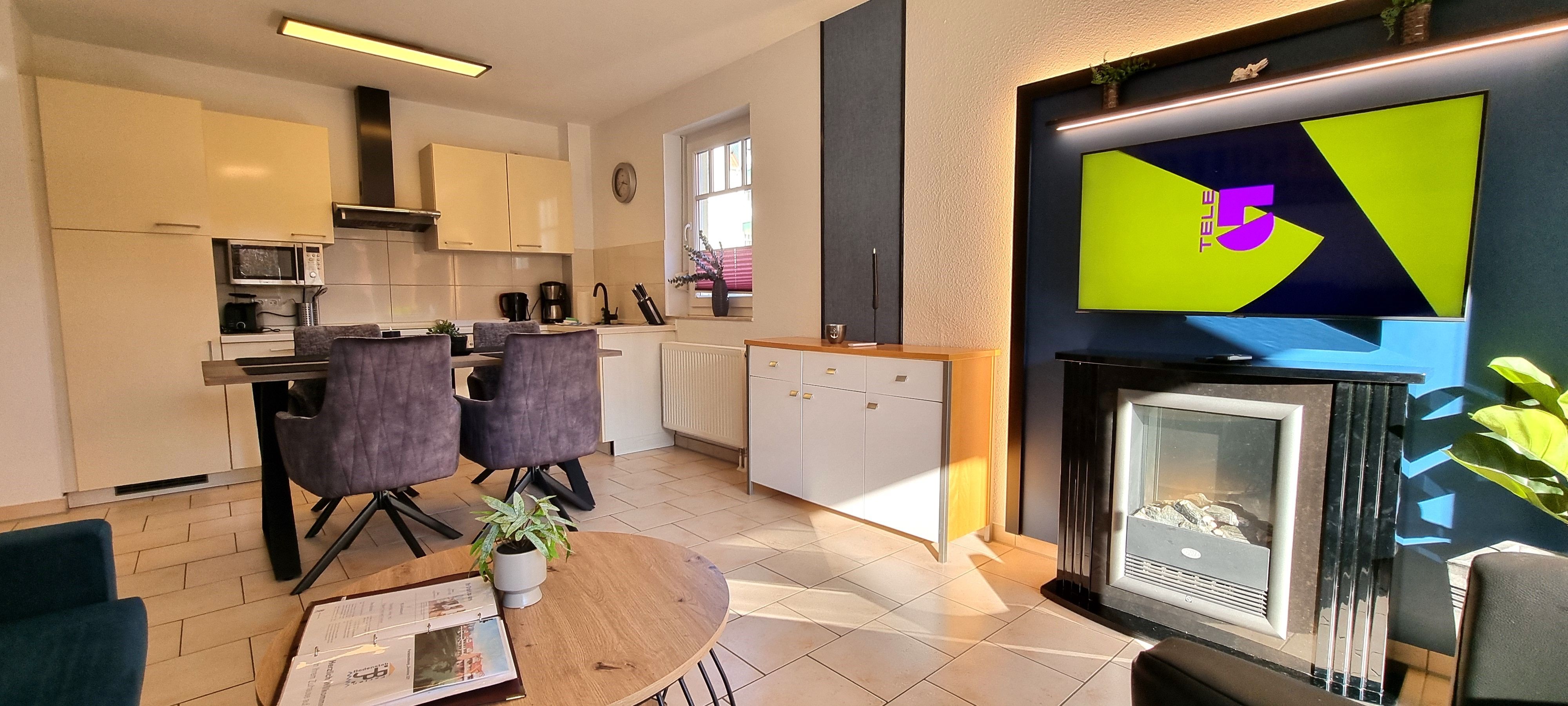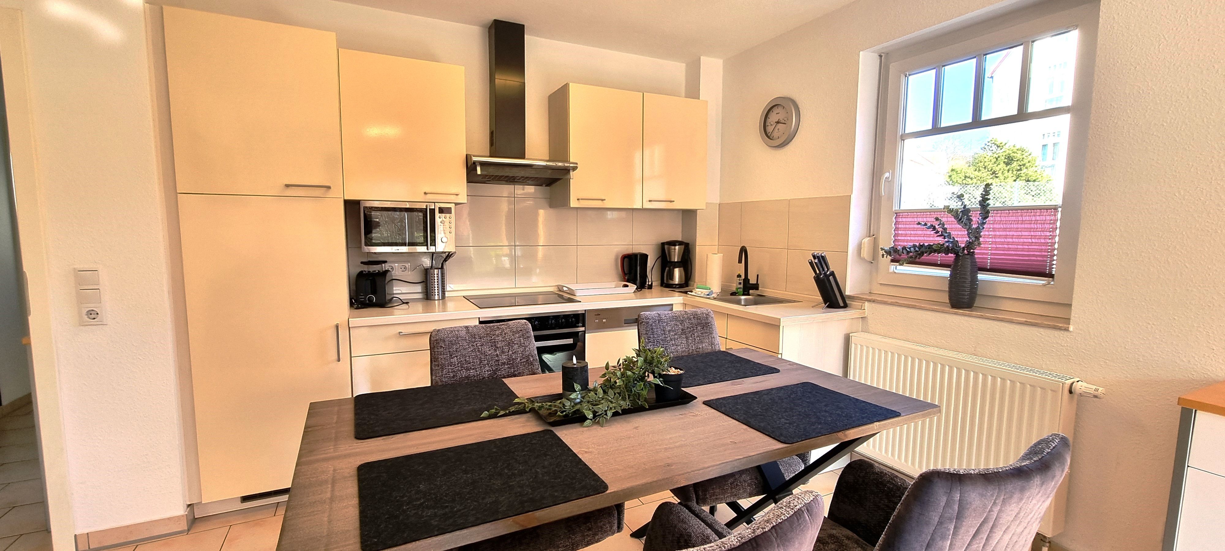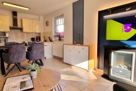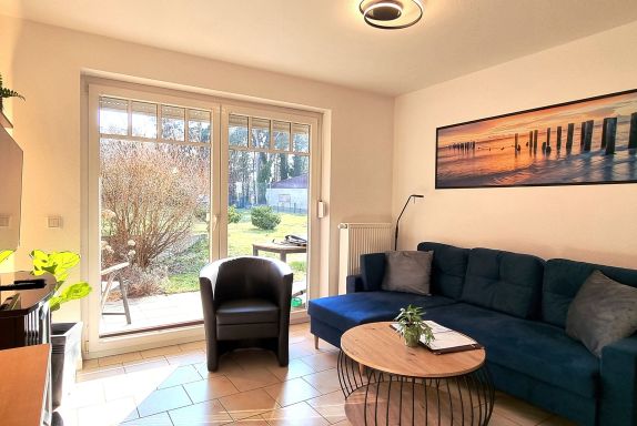 Die Ferienwohnung liegt im Erdgeschoß des Ferienhauses. Sie besteht aus Wohnzimmer, kompl. ausgestatteter Küche, Schlafzimmer und Tageslichtbad. Die Ausstattung der Einbauküche ist neuwertig funktional und qualitativ hochwertig unter anderem mit Toaster, Kaffeemaschine, Backofen mit Heißluft, Kochfeld, Geschirrspüler, Gefrierfach. Große Süd-Terrasse mit Blick auf den Küstenwald, große Spielwiese. Grillplatz