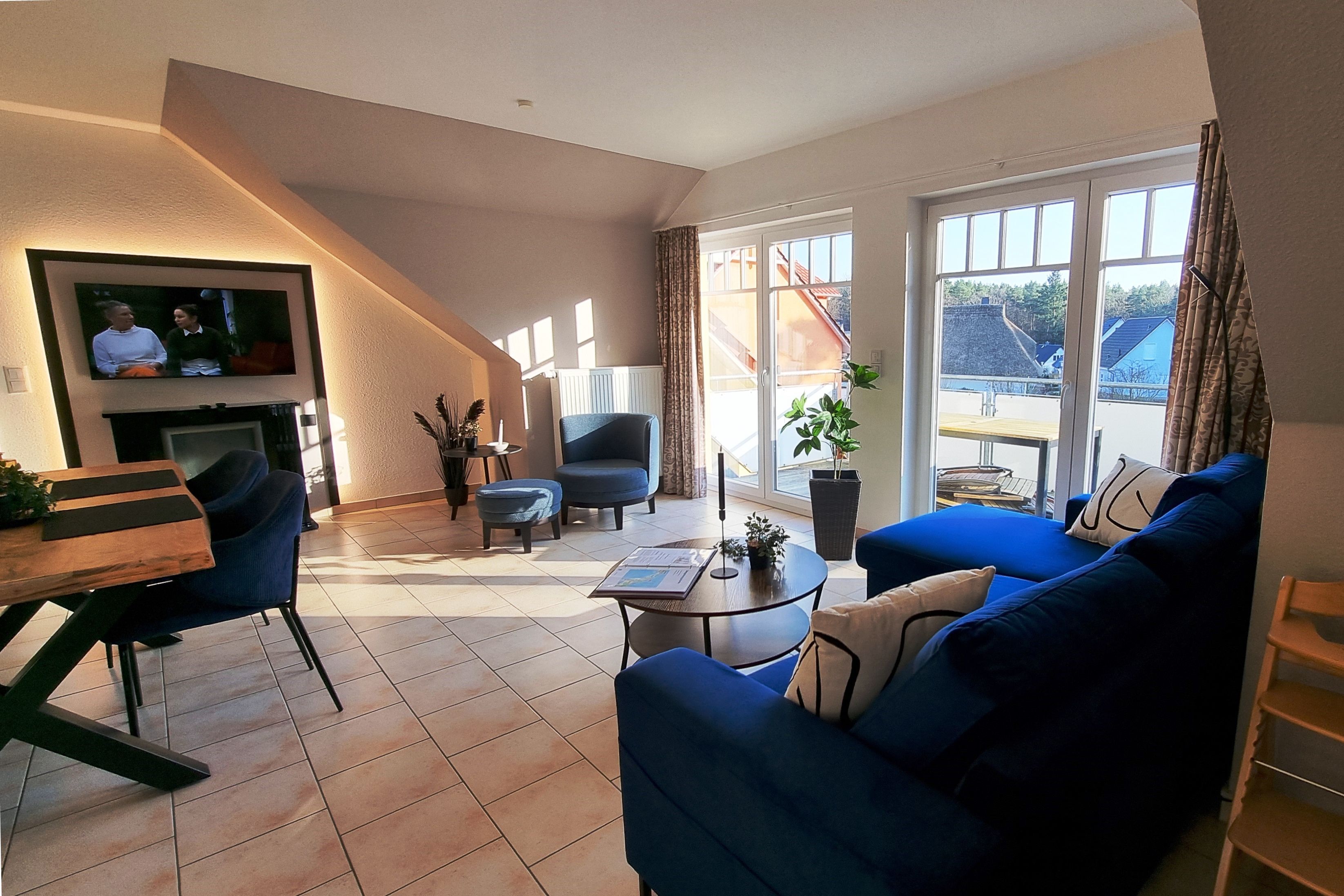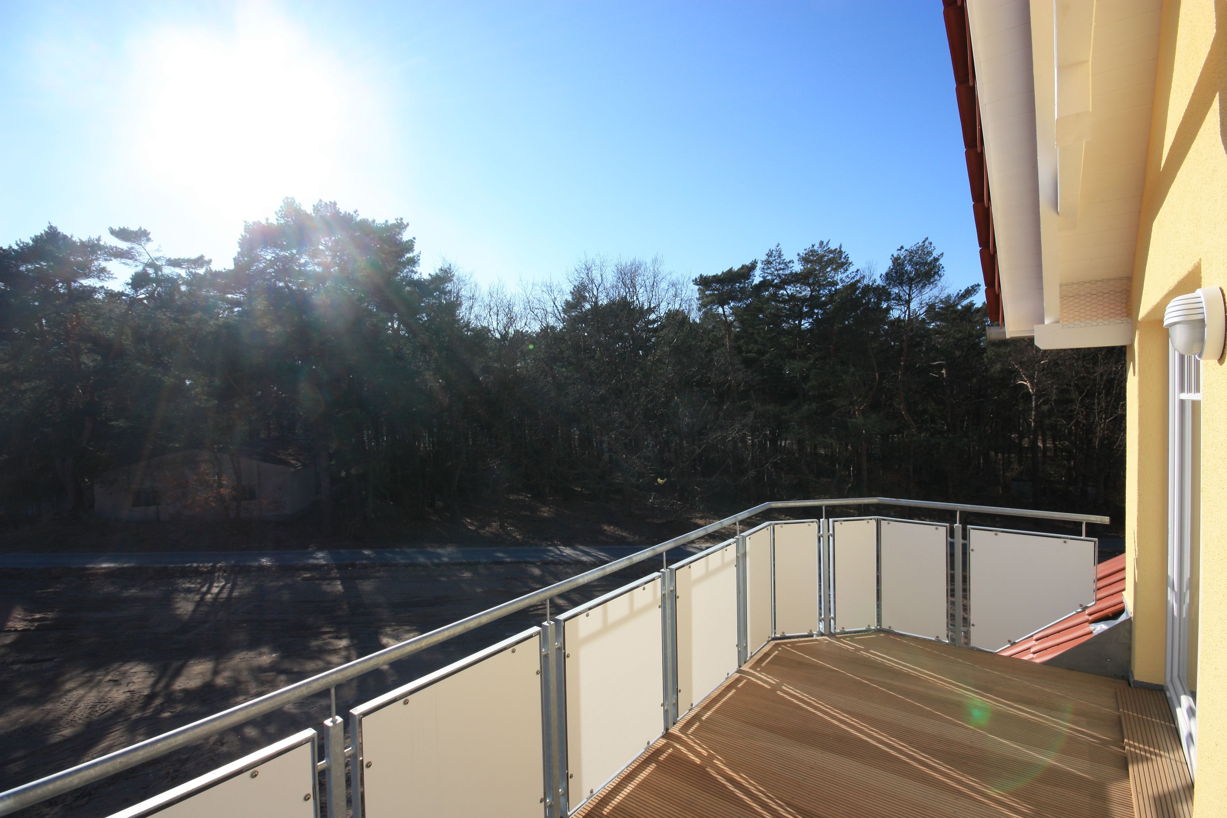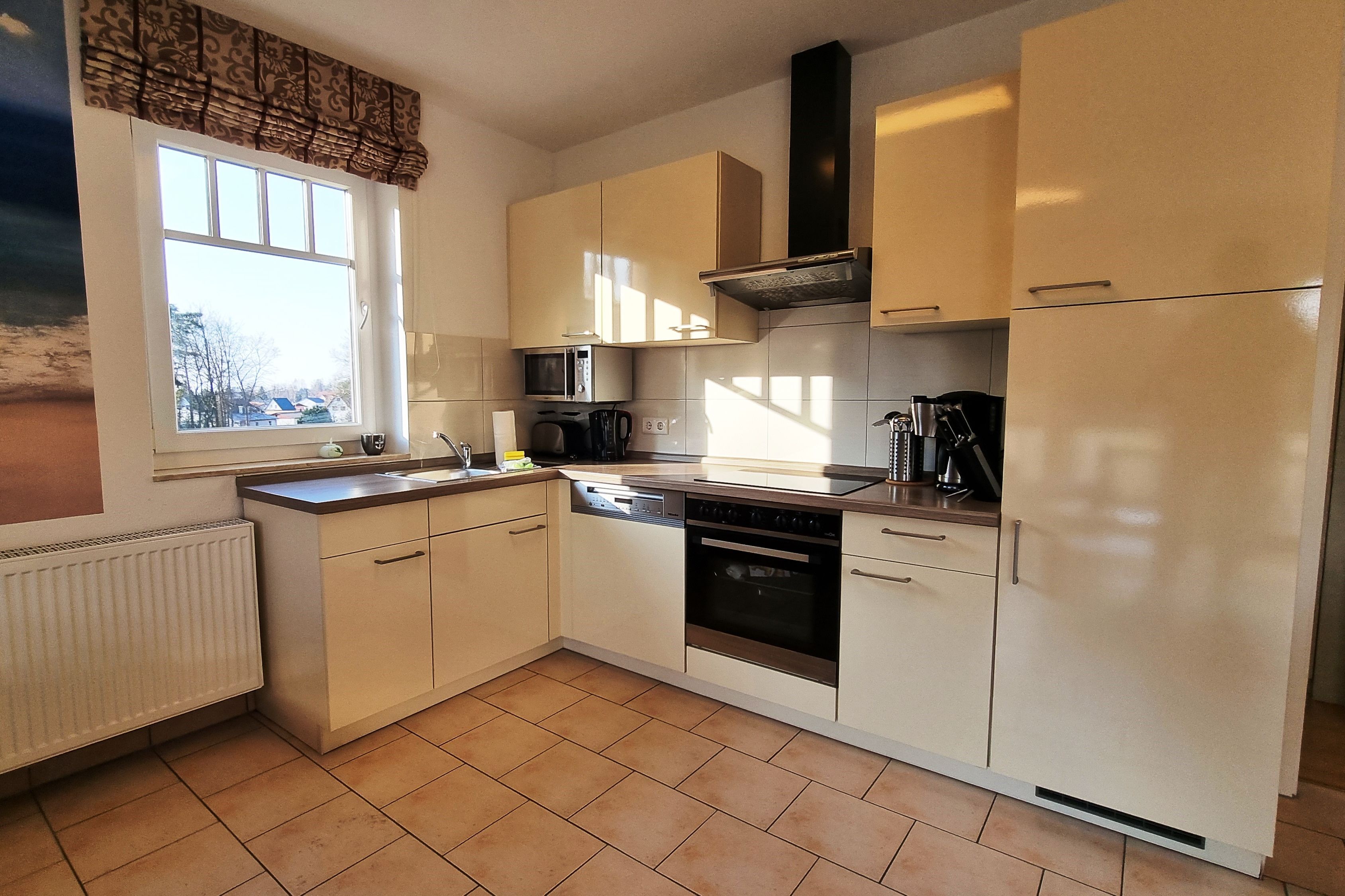 Die Ferienwohnung liegt im Dachgeschoß des Ferienhauses. Sie besteht aus Wohnzimmer, kompl. ausgestatteter Küche, Schlafzimmer und Tageslichtbad. Die Ausstattung der Einbauküche ist neuwertig funktional und qualitativ hochwertig unter anderem mit Toaster, Kaffeemaschine, Backofen mit Heißluft, Kochfeld, Geschirrspüler, Gefrierfach. Großer Südbalkon mit Blick auf den Küstenwald, große Spielwiese, Grillplatz.