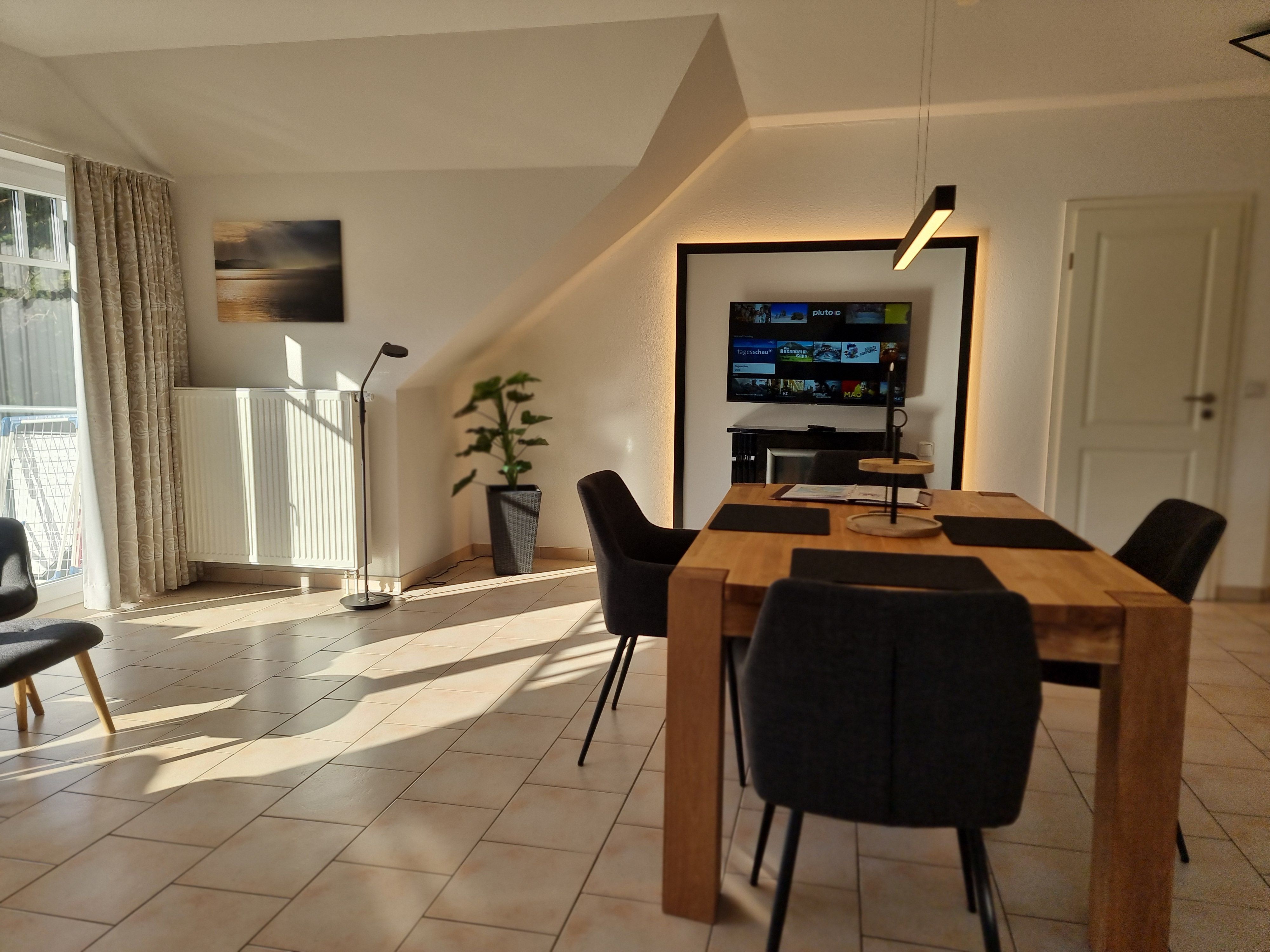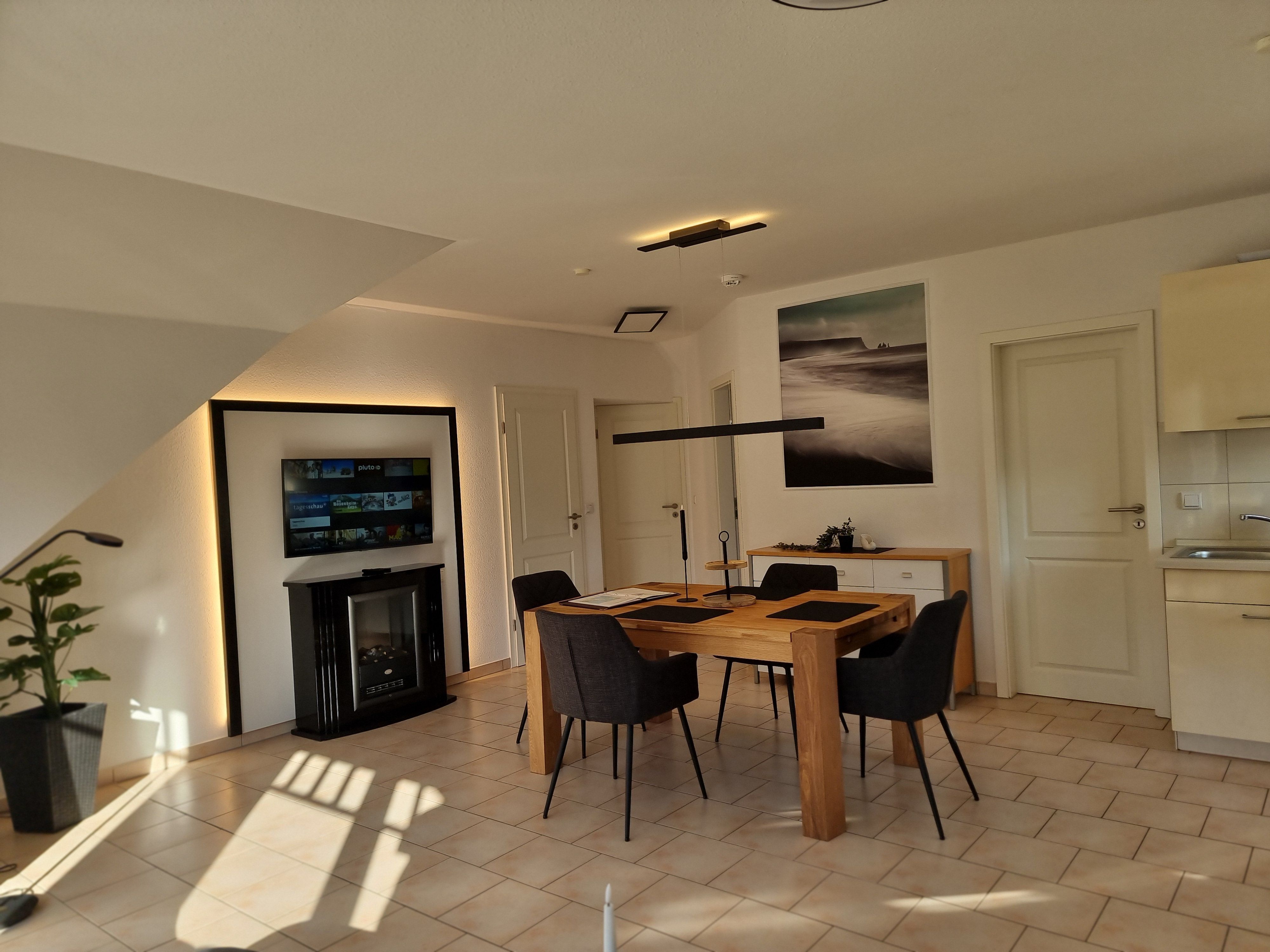 • Wohnzimmer mit off. Küche, Eßtisch, Couch, Elektrokamin oder Echtholzkamin