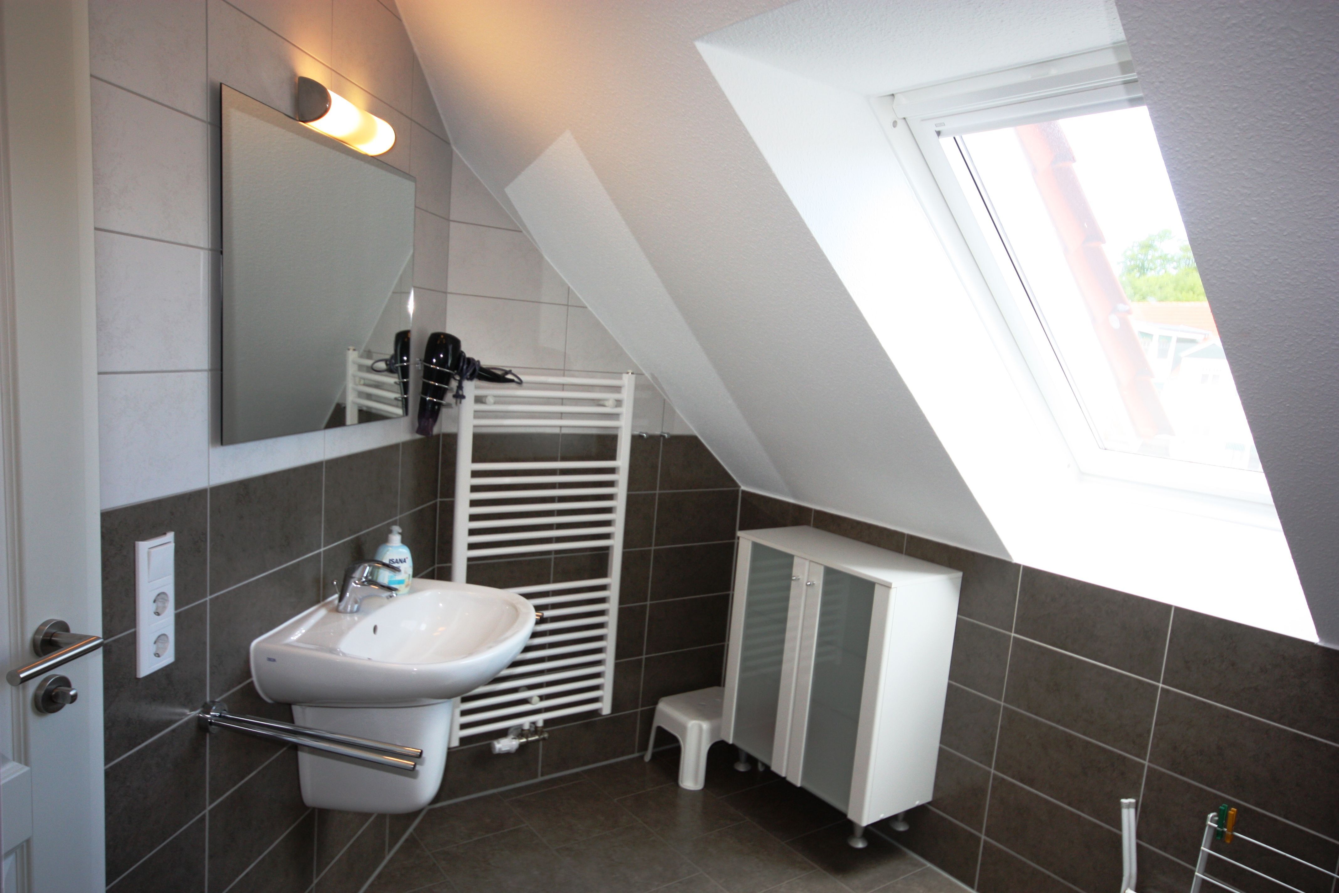 Die Ferienwohnung liegt im Dachgeschoß des Ferienhauses. Sie besteht aus Wohnzimmer, kompl. ausgestatteter Küche, Schlafzimmer und Tageslichtbad. Die Ausstattung der Einbauküche ist neuwertig funktional und qualitativ hochwertig unter anderem mit Toaster, Kaffeemaschine, Backofen mit Heißluft, Kochfeld, Geschirrspüler, Gefrierfach. Großer Südbalkon mit Blick auf den Küstenwald, große Spielwiese, Grillplatz.