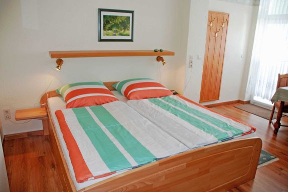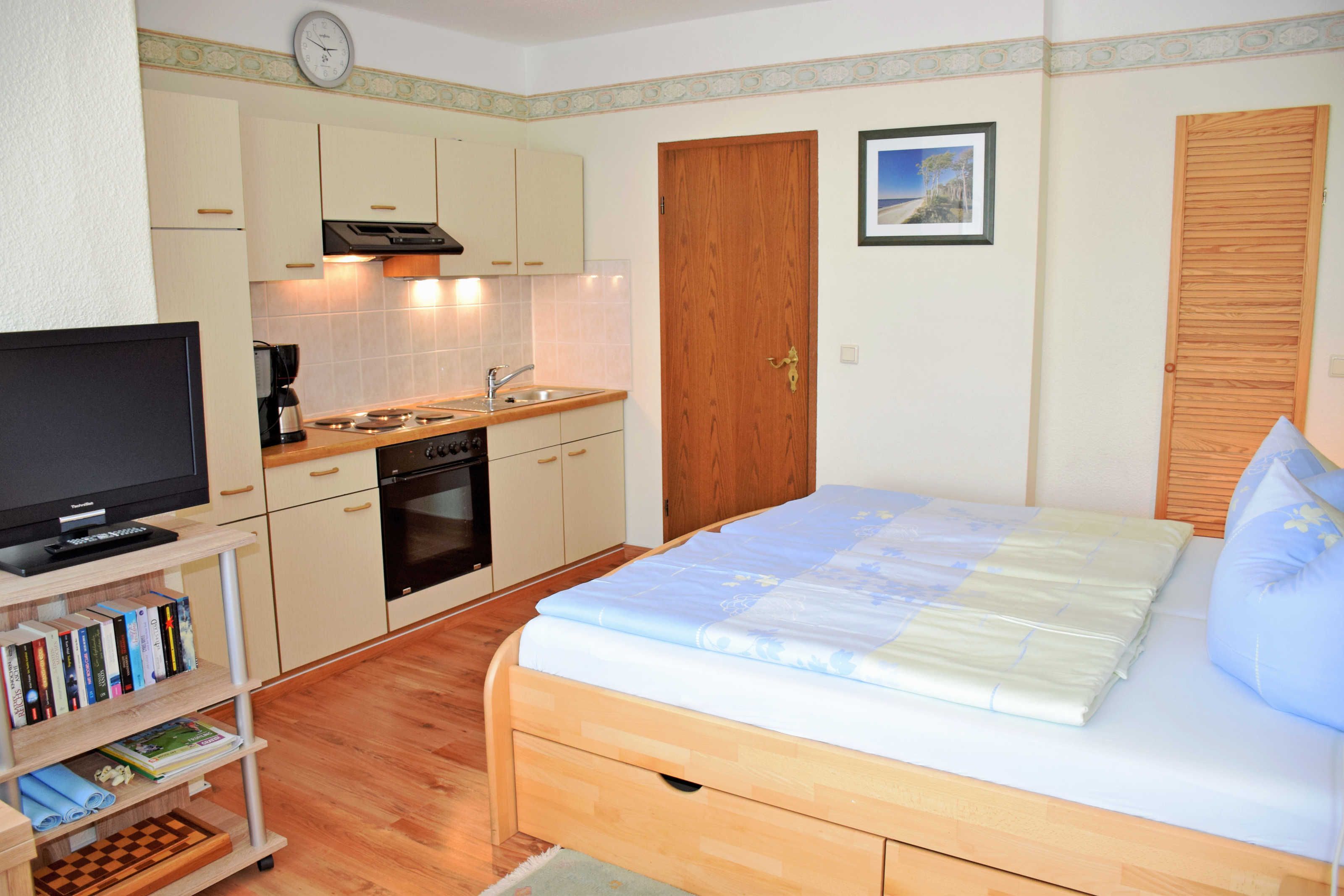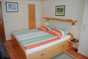 Dieses Ferienappartement ist ca. 25 qm groß, hat Platz für maximal 2 Gäste und wurde sehr liebevoll, modern und komfortabel eingerichtet. Über eine Außentreppe und einen separaten Eingang gelangt man in den kombinierten Wohn- und Schlafraum. Hier befinden sich ein Tisch und bequeme Stühle, ein Schrank mit TV-Gerät, ein bequemes Doppelbett mit Nachttischen und Leselampen und ein begehbarer Kleiderschrank.