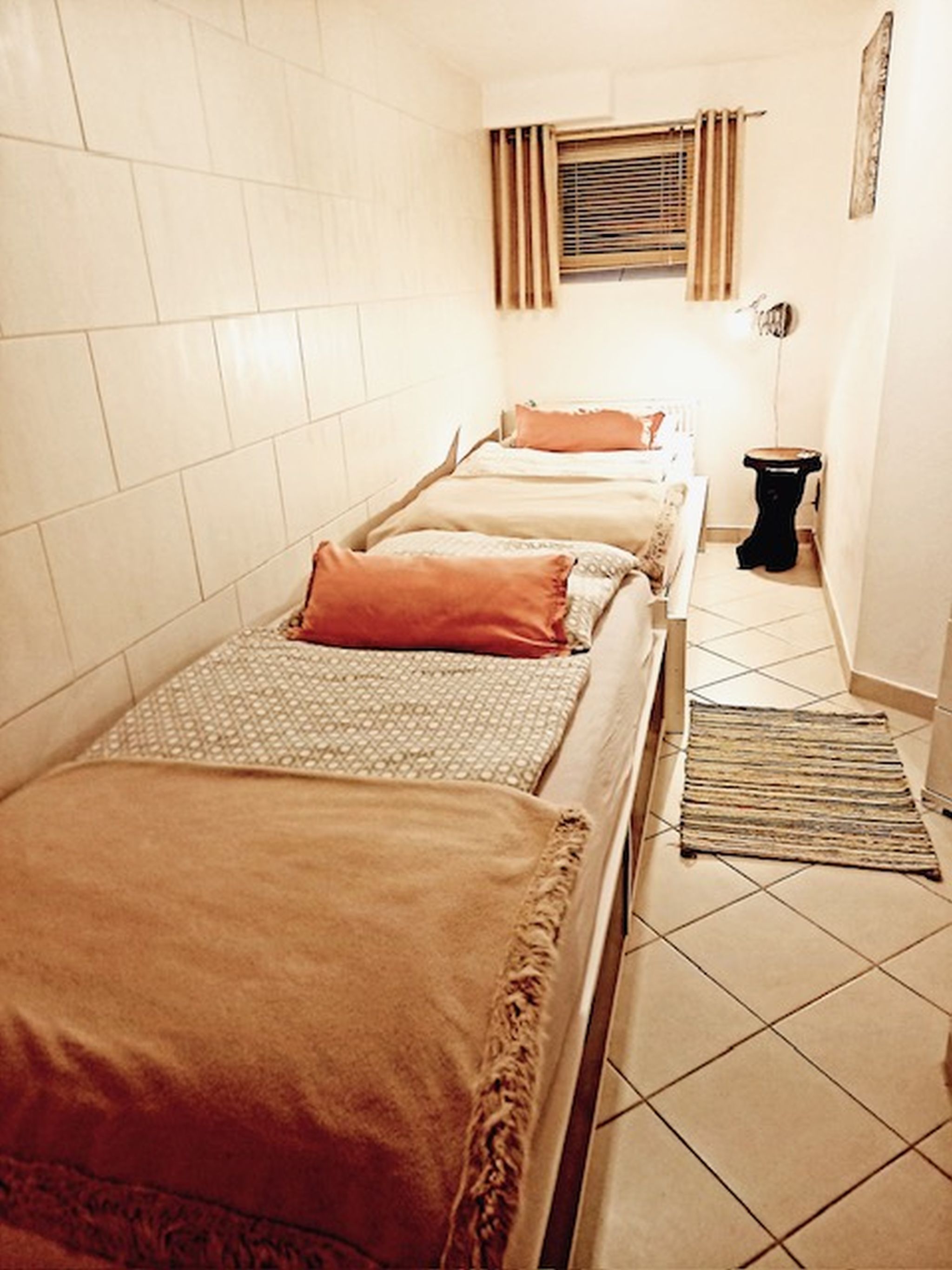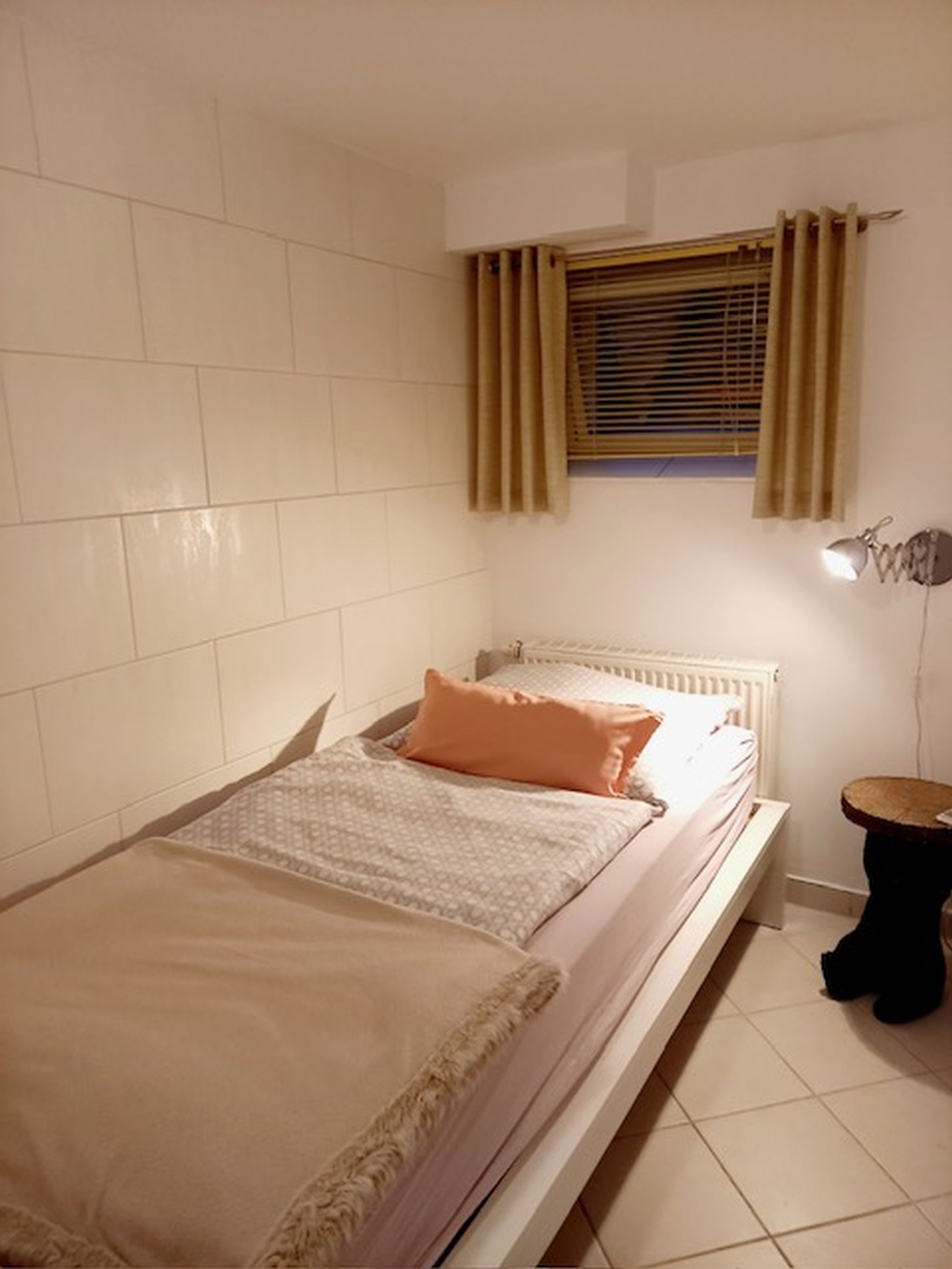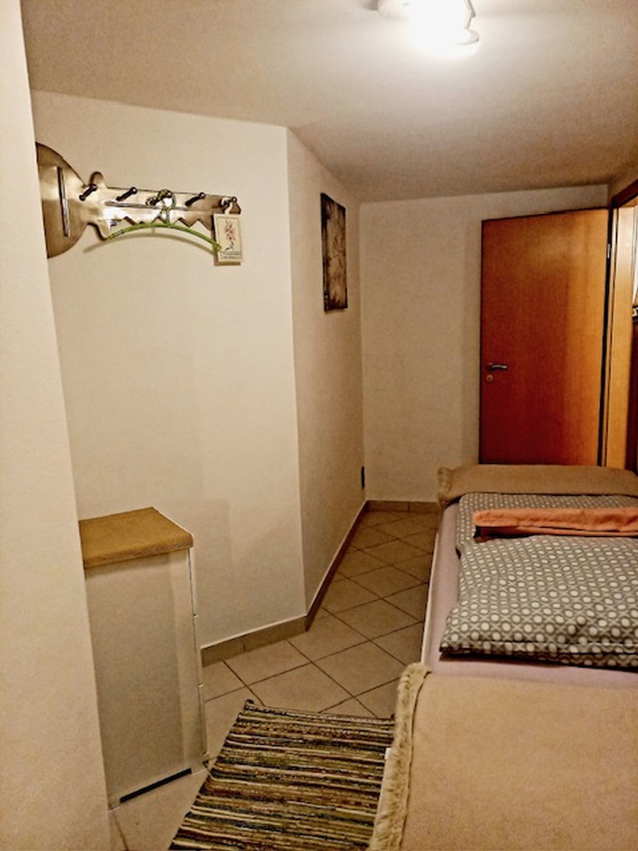 In der Ferienwohnung 2 im Souterrain gibt es ein Schlafzimmer mit getrennt stehenden Betten sowie eine Küchenzeile mit Geschirrspülmaschine und Münzwaschmaschine im Wohnbereich integriert.