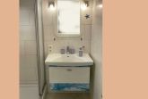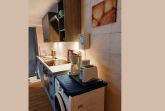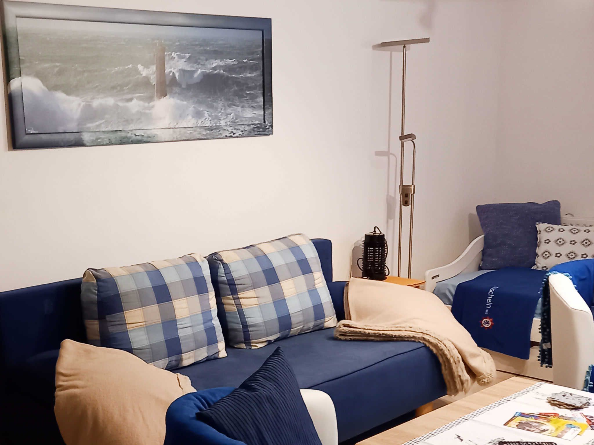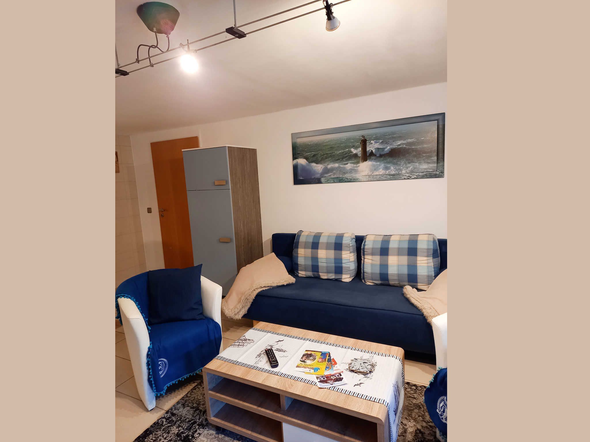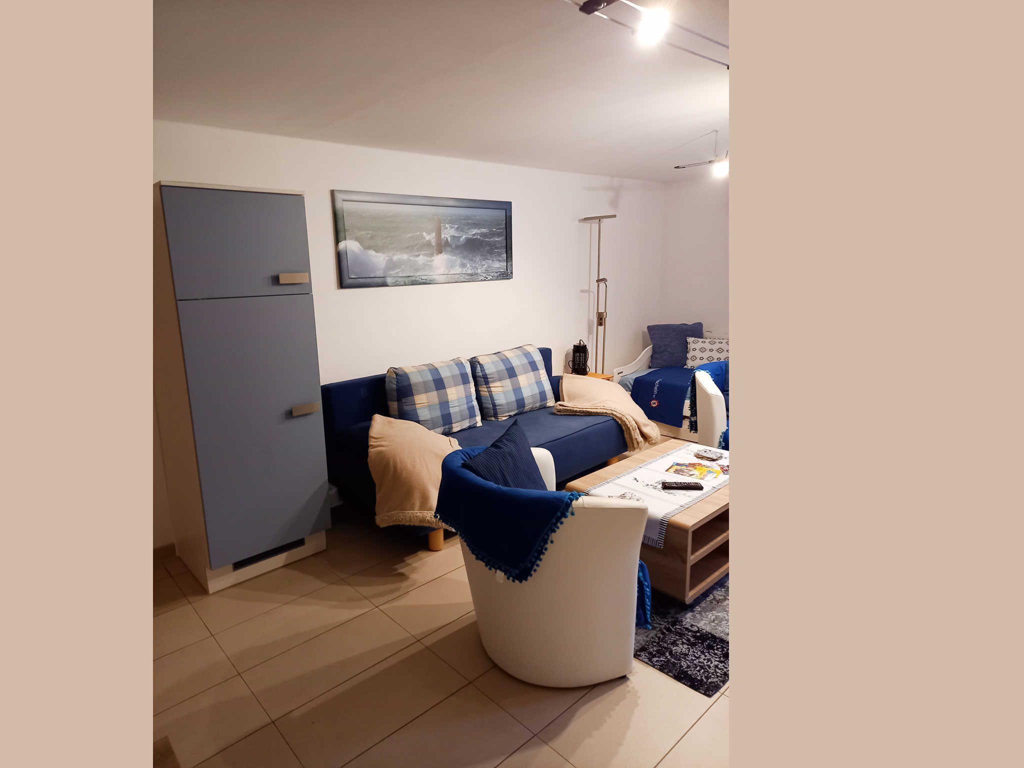 In der Ferienwohnung 2 im Souterrain gibt es ein Schlafzimmer mit getrennt stehenden Betten sowie eine Küchenzeile mit Geschirrspülmaschine und Münzwaschmaschine im Wohnbereich integriert.