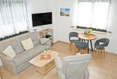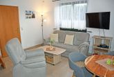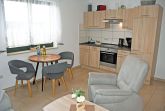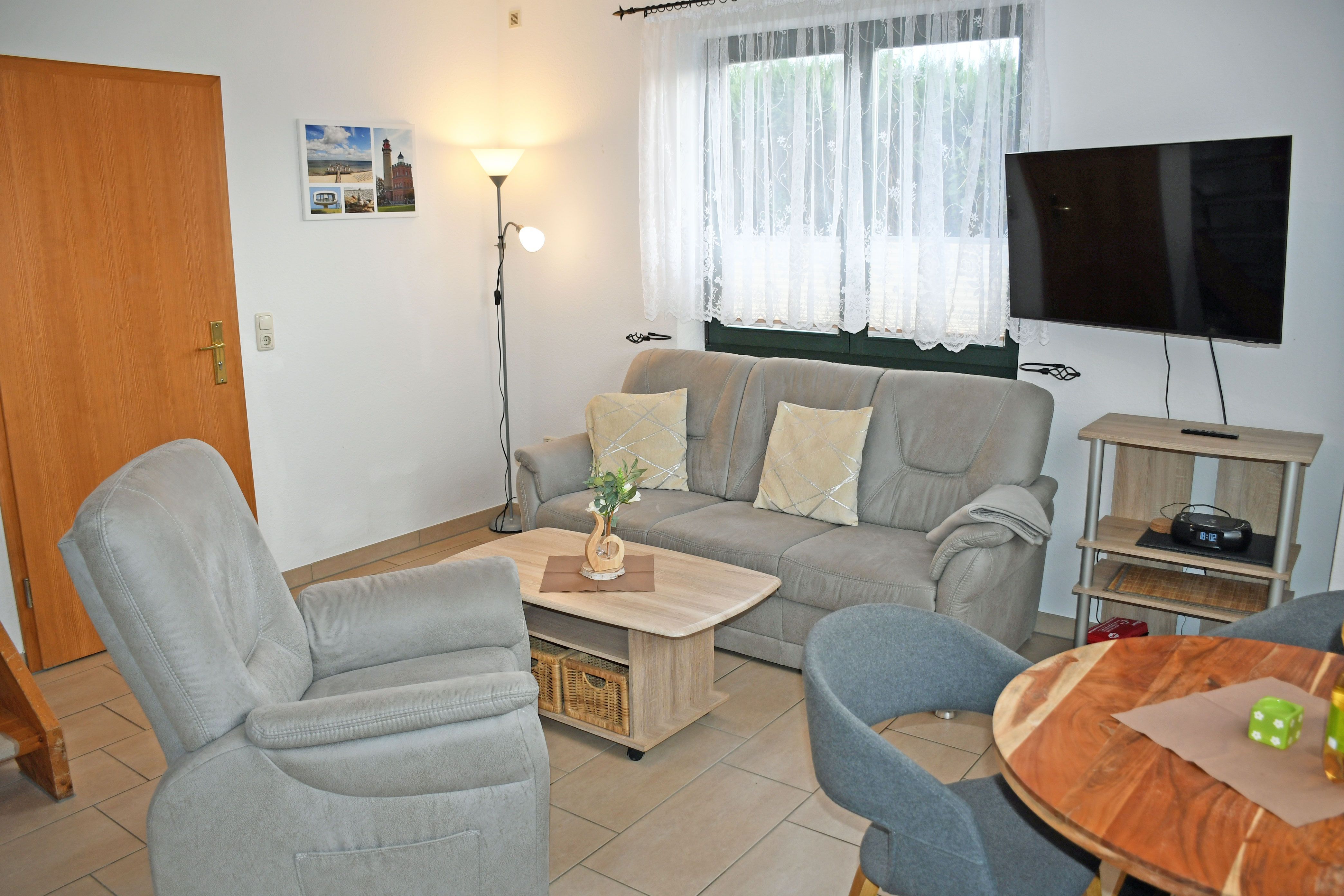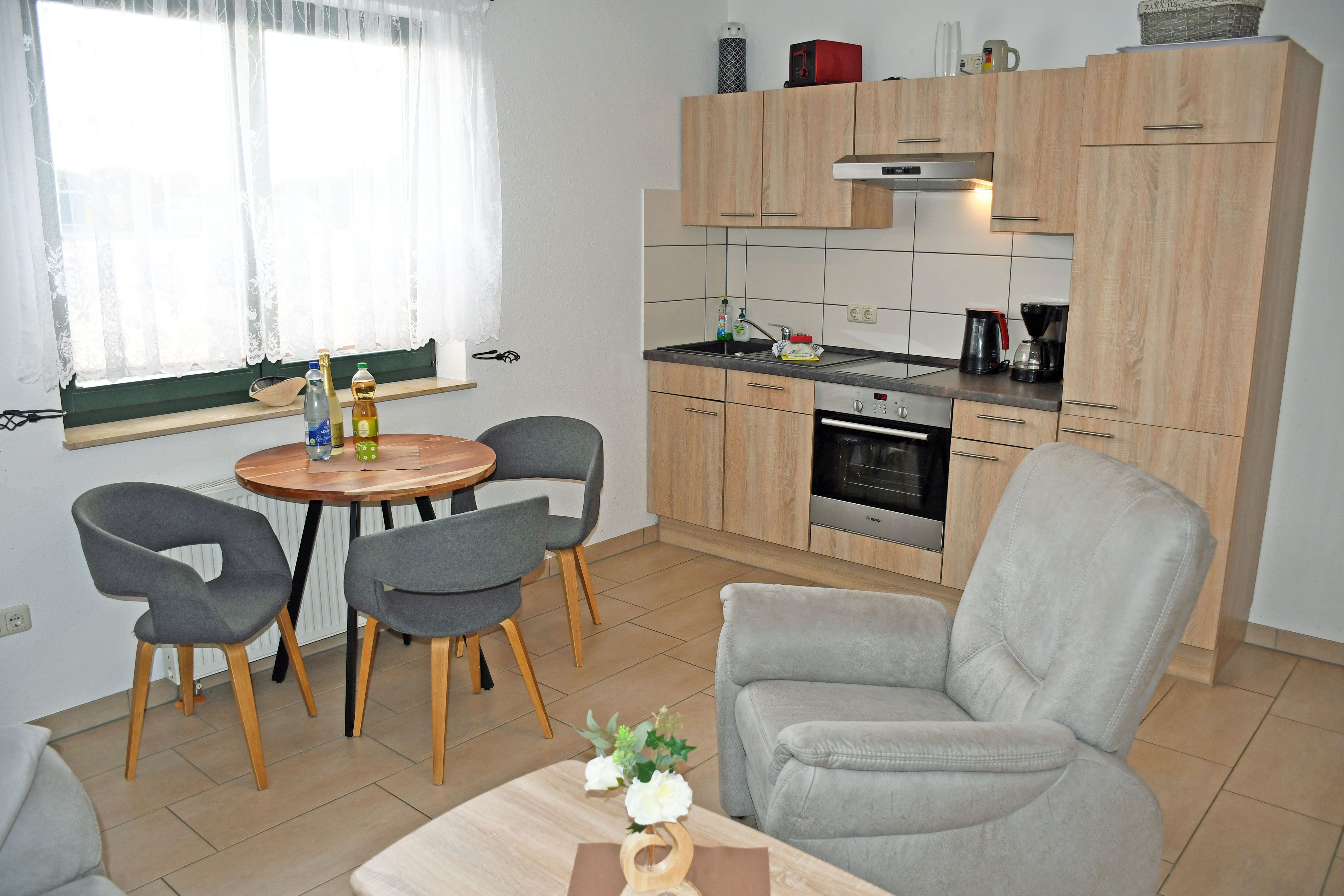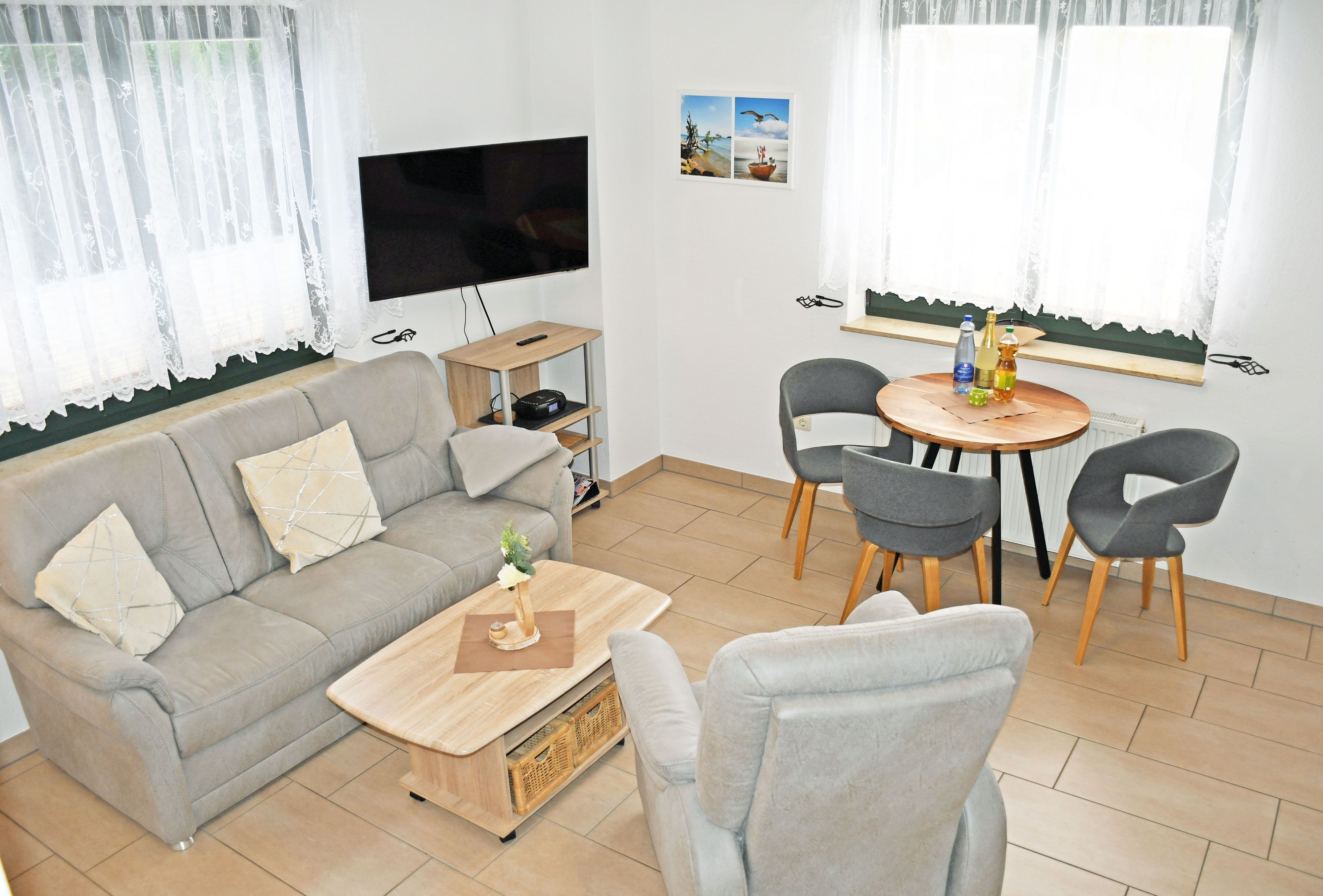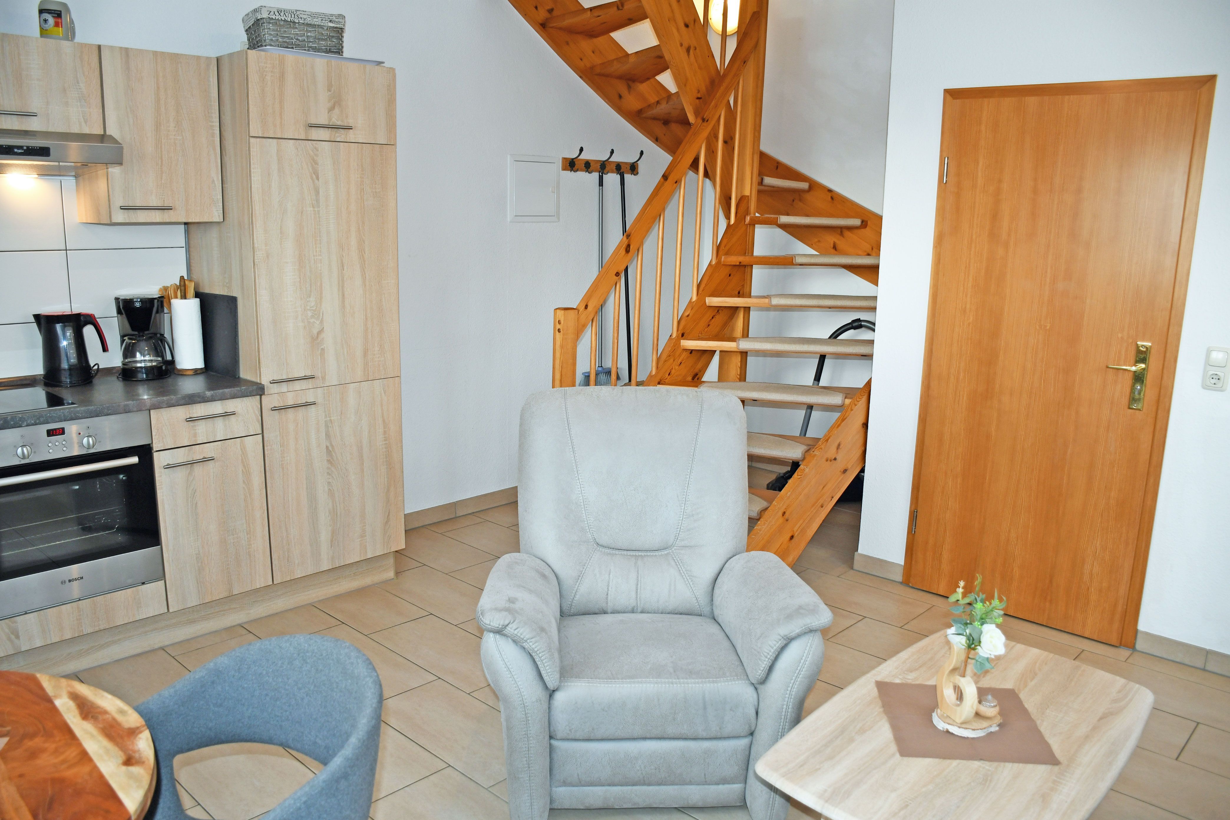 Über einen separaten Eingang gelangt man in das Erdgeschoss mit dem Wohnzimmer. Diese verfügt über eine Sitzcouch mit Tisch und Sesseln, ein Esstisch mit Stühlen, ein TV-Gerät und Ablageschränken. Weiterhin befindet sich im Erdgeschoss eine Küchenzeile die mit Herd, Backofen, Mikrowelle, Spülmaschine, Wasserkocher, Kaffeemaschine, Toaster und Kühlschrank komplett ausgestattet ist.