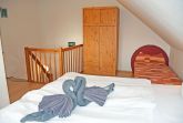 Über eine Holztreppe gelangt man in das Obergeschoss. Das Schlafzimmer verfügt über ein bequemes Doppelbett und ein Einzelbett mit Nachttischen und Leselampen sowie Ablageschränken. Bei Ihrer Anreise sind die Betten selbstverständlich bereits mit Bettwäsche bezogen und frische Handtücher liegen bereit.