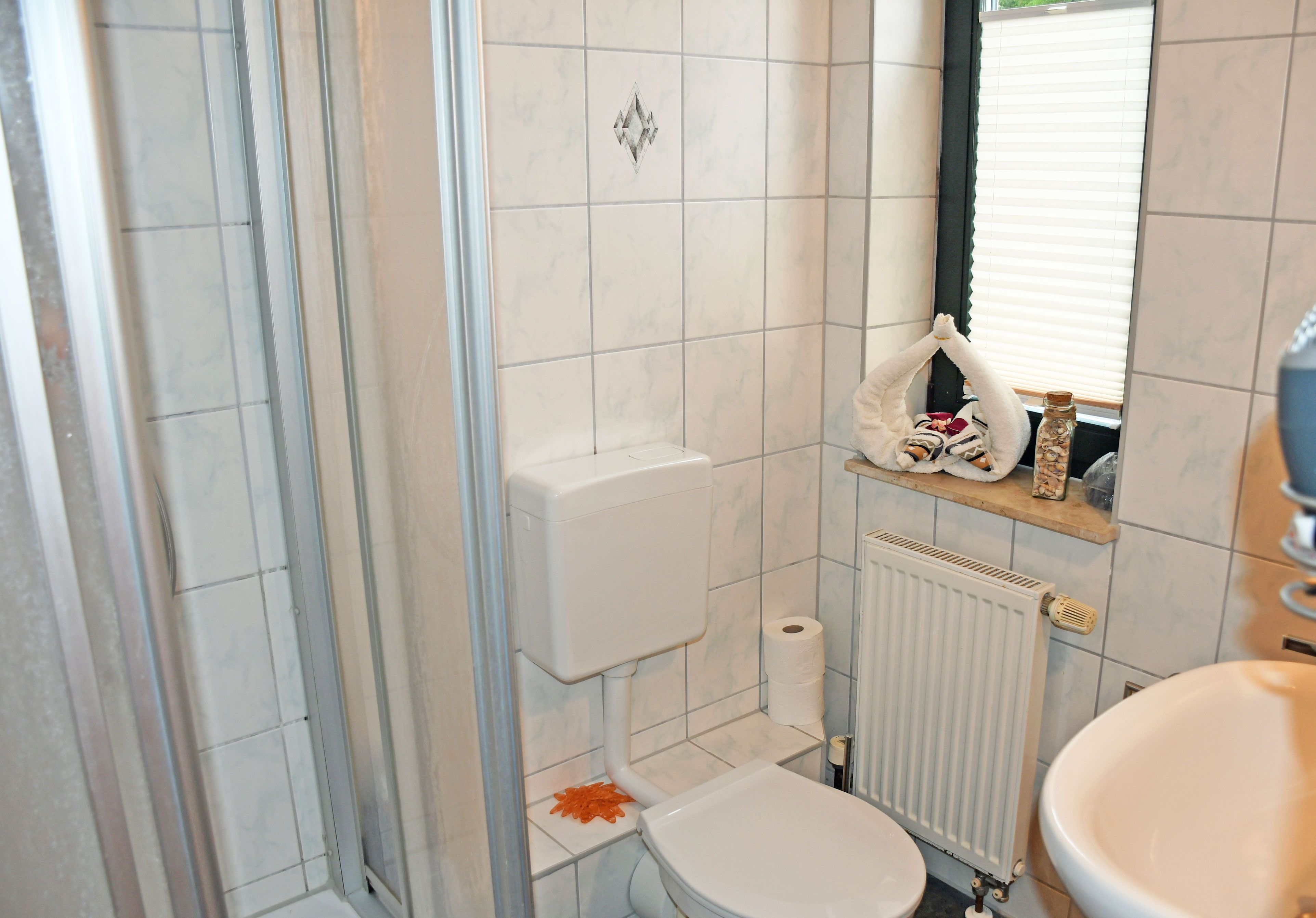 Das schöne Bad ist mit Dusche, WC und Waschbecken ausgestattet., es verfügt über Tageslicht.