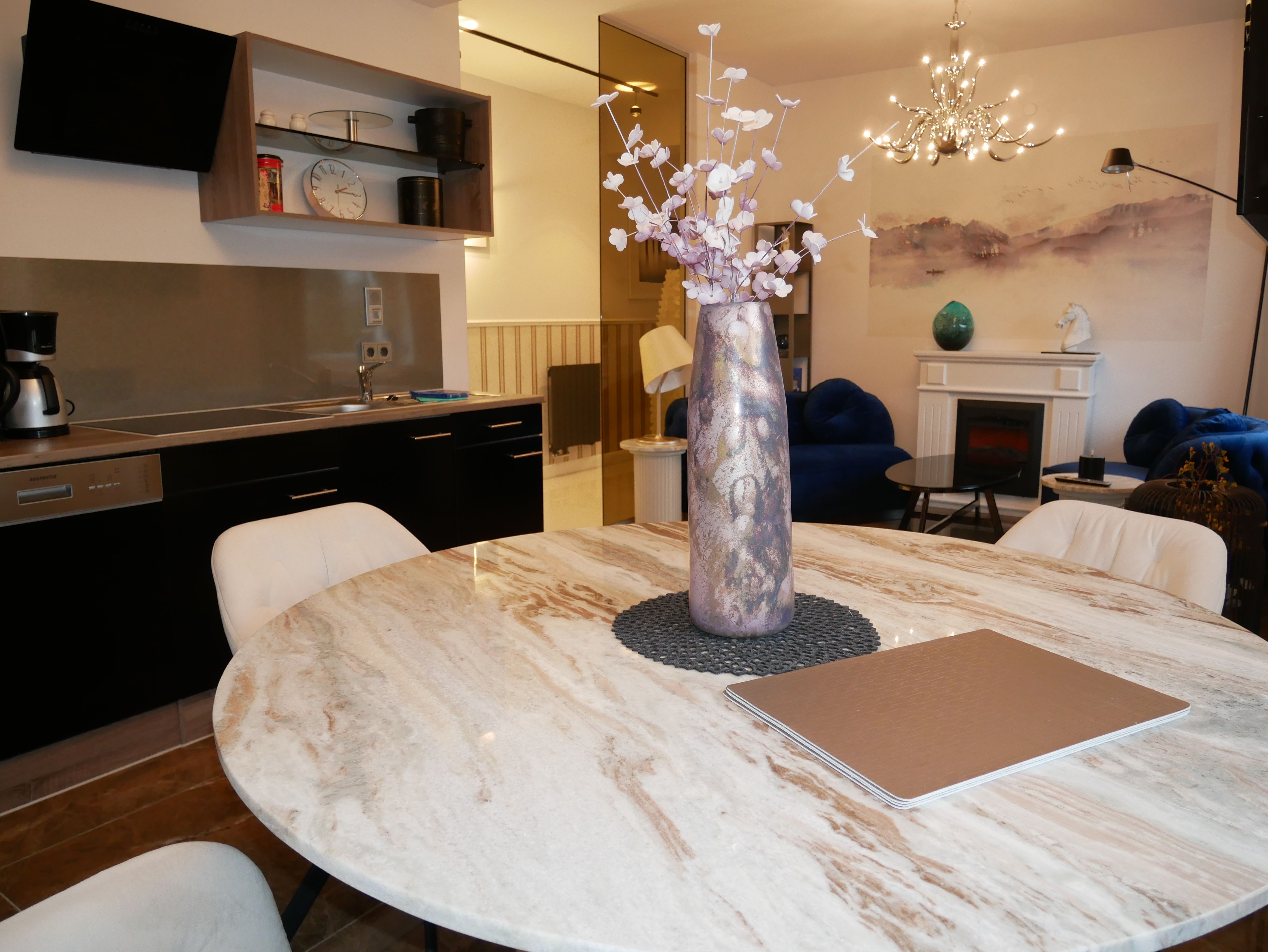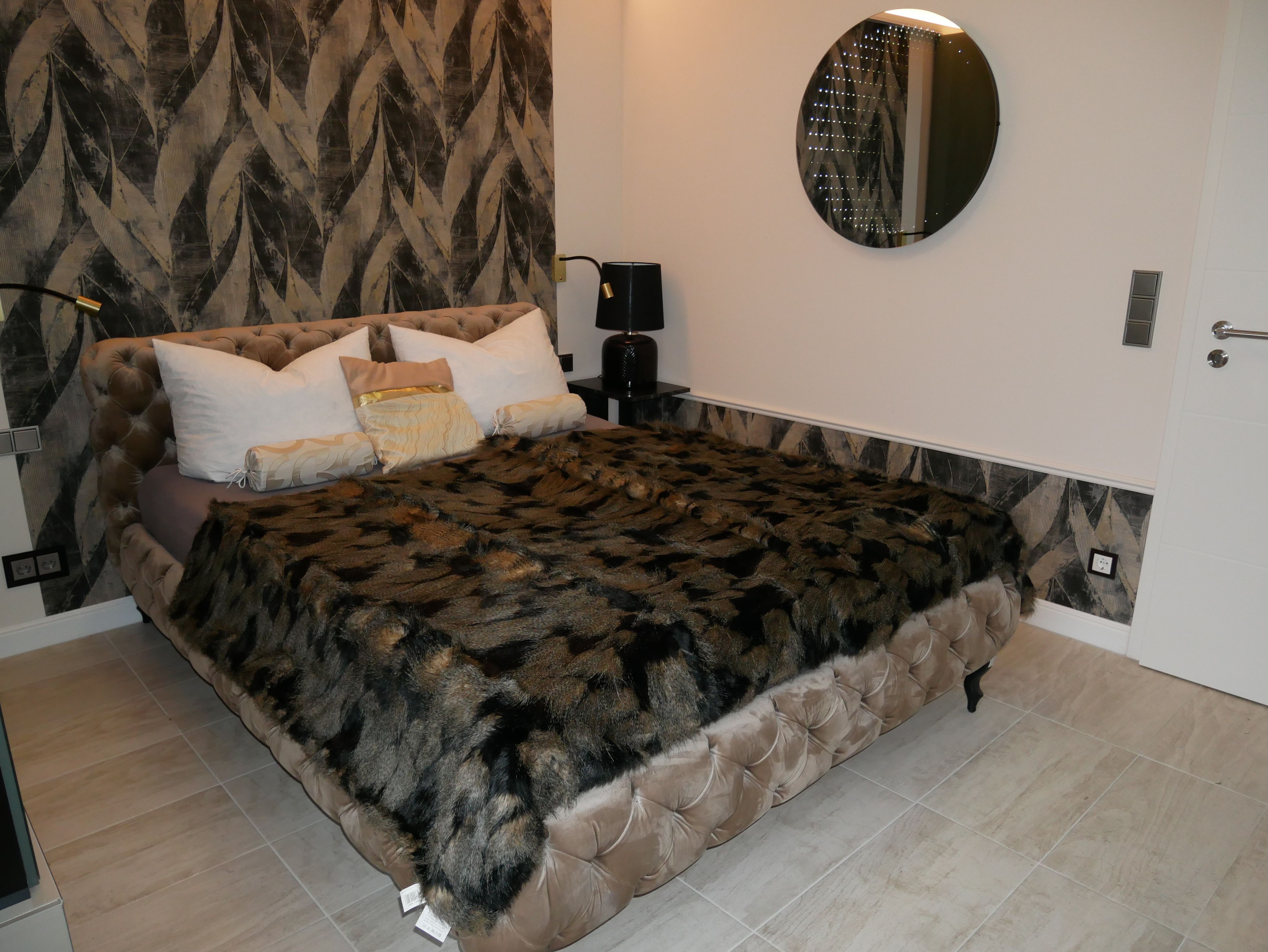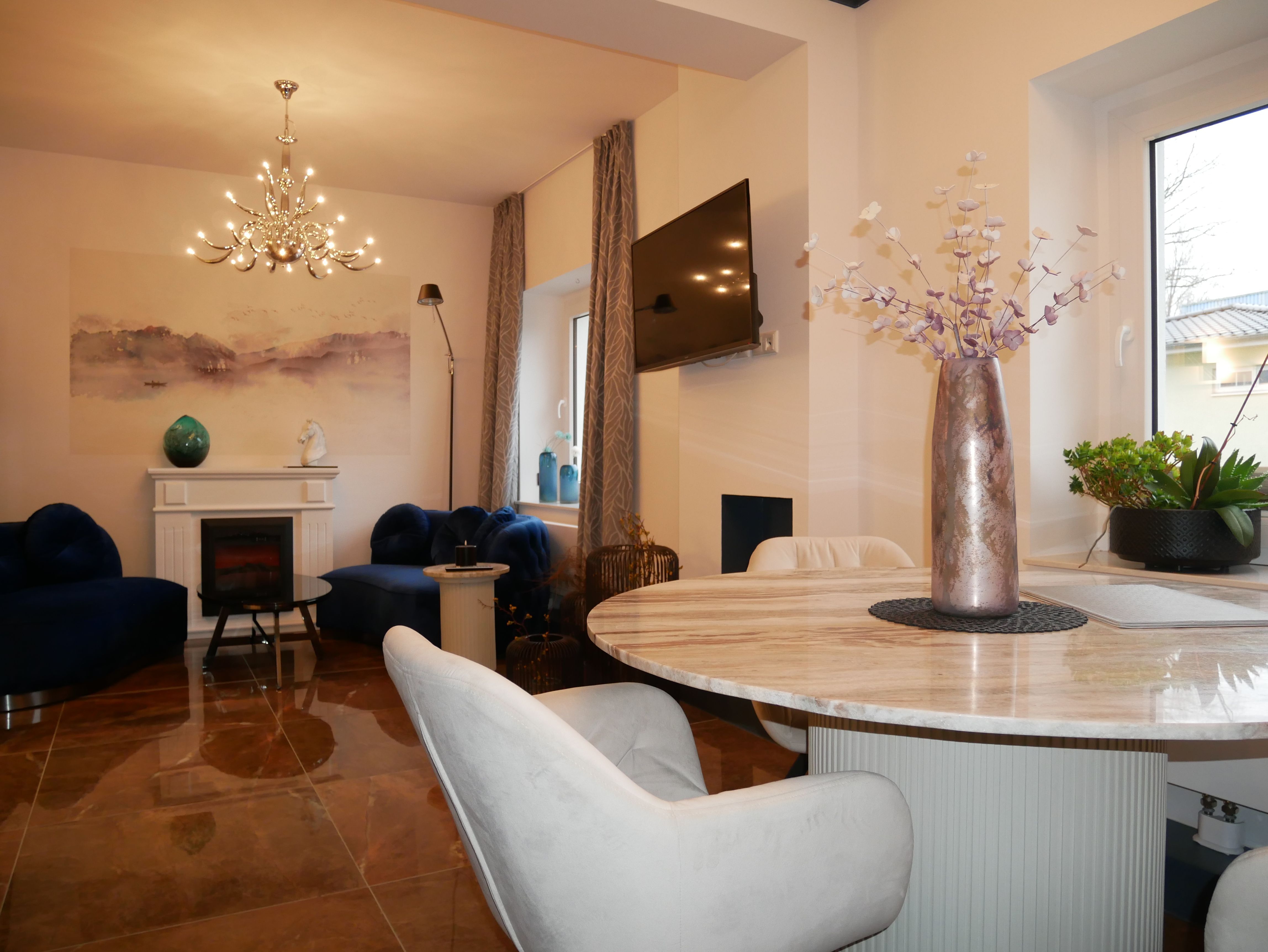 Die exquisite Nichtraucher Ferienwohnung ist 95 qm groß und verfügt über 2 Zimmer. Der großzügige offene Wohnbereich mit offener Küche verfügt über einen Essbereich und gemütlicher Sitzecke. Im Wohnbereich befindet sich neben den italienischen Designermöbeln ein TV und ein Elektrokamin. Das französische Bett im Schlafzimmer hat eine Breite von 1,60 m und besitz einen zweiten Fernseher.