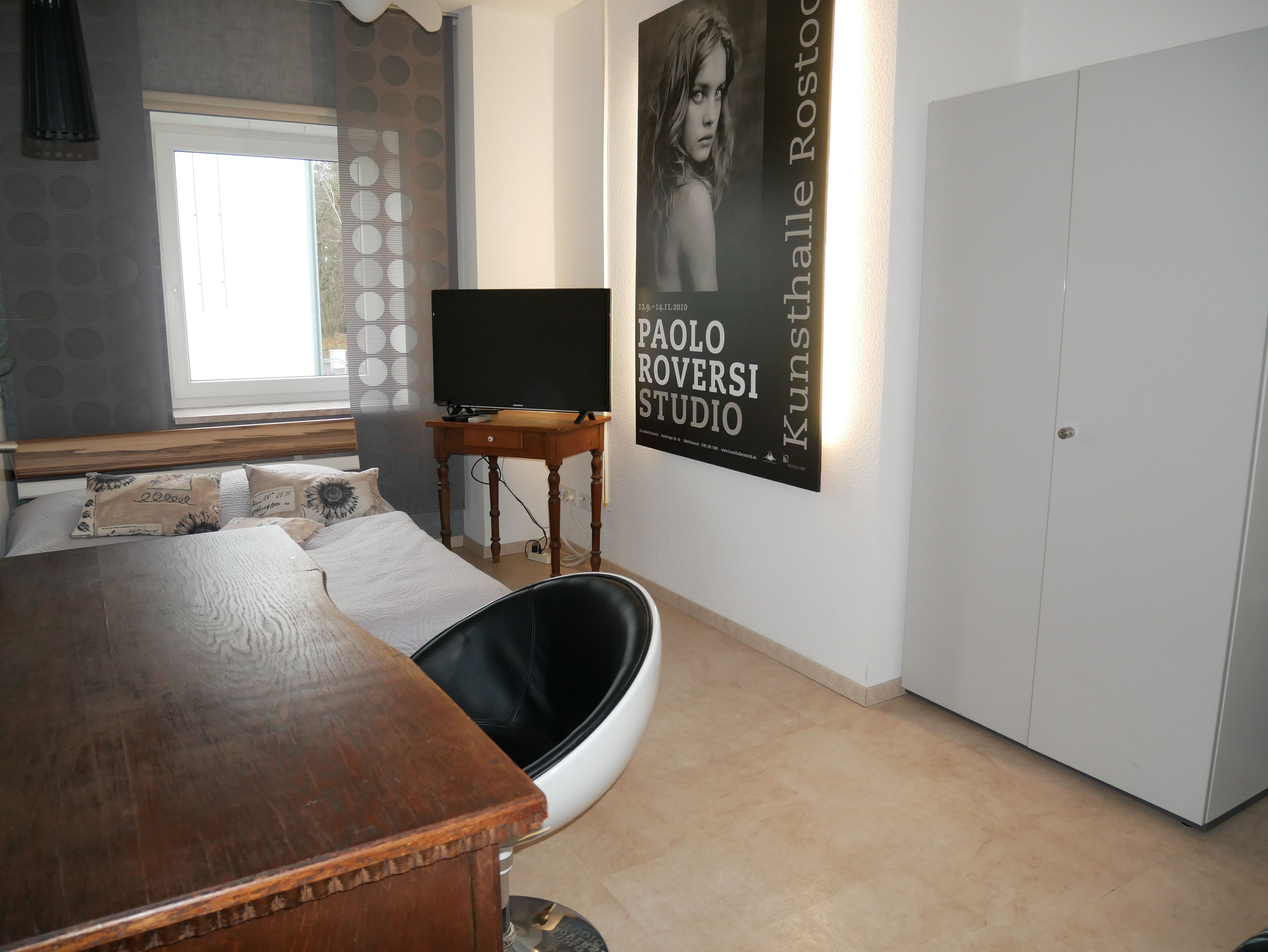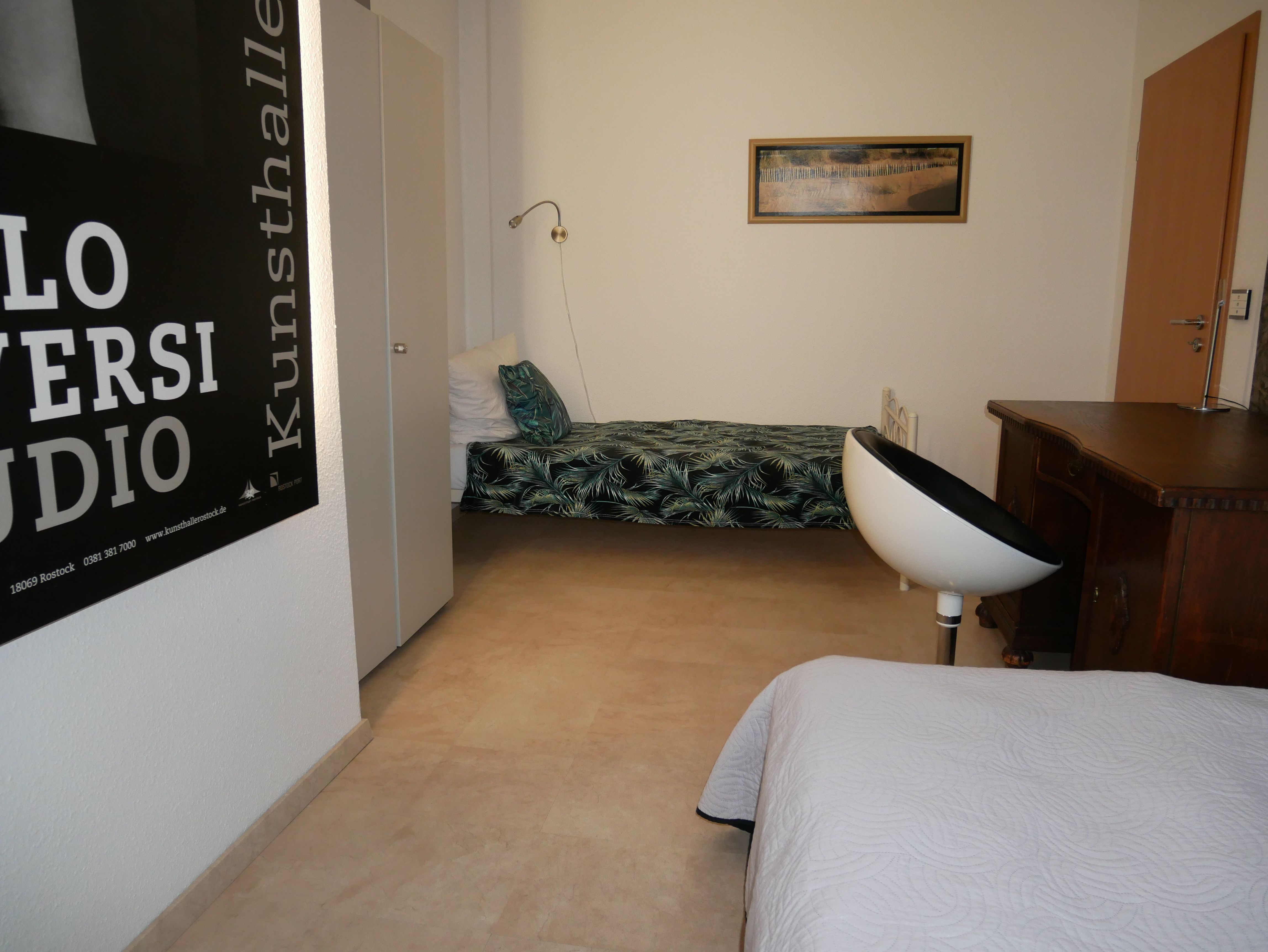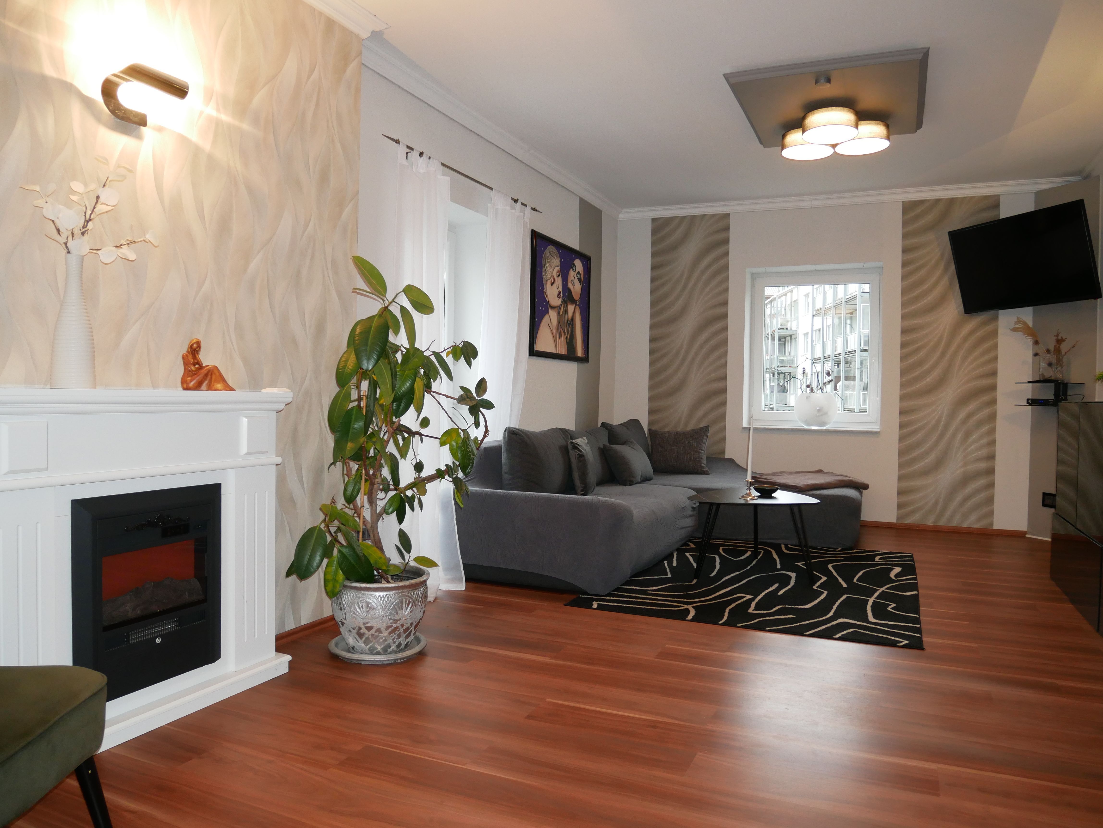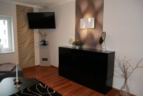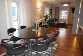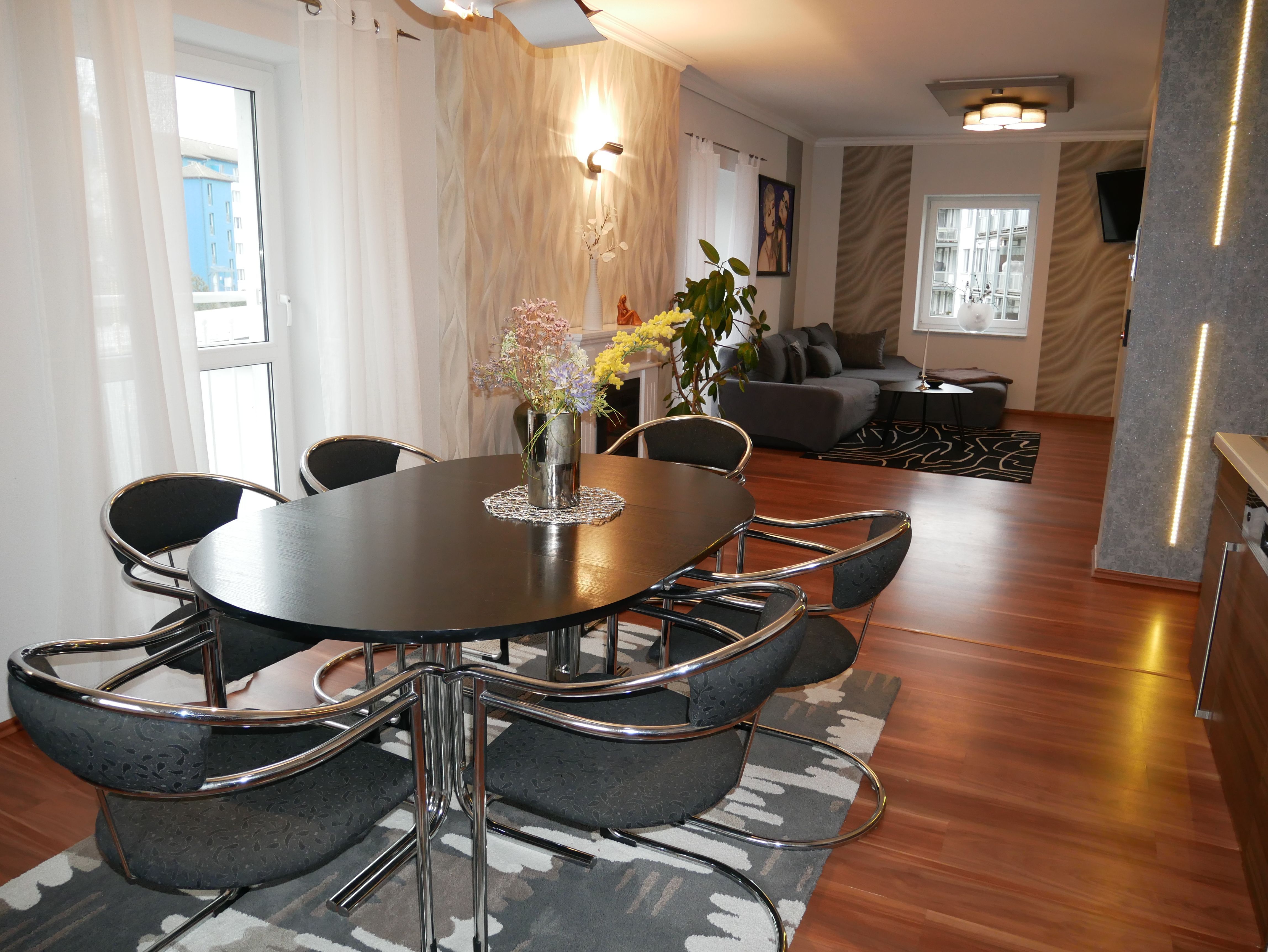 Die großzügige 100m² große 3-Raum-Ferienwohnung befindet sich im ersten Obergeschoss einer Licht- und Designfirma (keine Lärmbelästigung). Die Ferienwohnung ist luxuriös eingerichtet und verfügt über eine moderne Lichtsteuerung. Es gibt ein großes Schlafzimmer mit Doppelbett und ein kleineres Schlafzimmer mit einem schmalen Doppelbett (1,40m), sowie ein getrennt stehendes Einzelbett. Eine große komplett ausgestattete Küche mit Ceranfeld, Backofen, Kühlschrank mit Gefrierfach, Spülmaschine, Mikrowelle, Toaster, Kaffeemaschine, Wasserkocher und einem Essplatz für 6 Personen, fügt sich in das große, freundliche Wohnzimmer mit einem Elektrokamin und einer gemütlichen Ledersitzgarnitur mit Schlafmöglichkeit für die sechste Person ein. Das großzügige, edle Bad ist mit Eckbadewanne, separater Dusche und WC ausgestattet.
