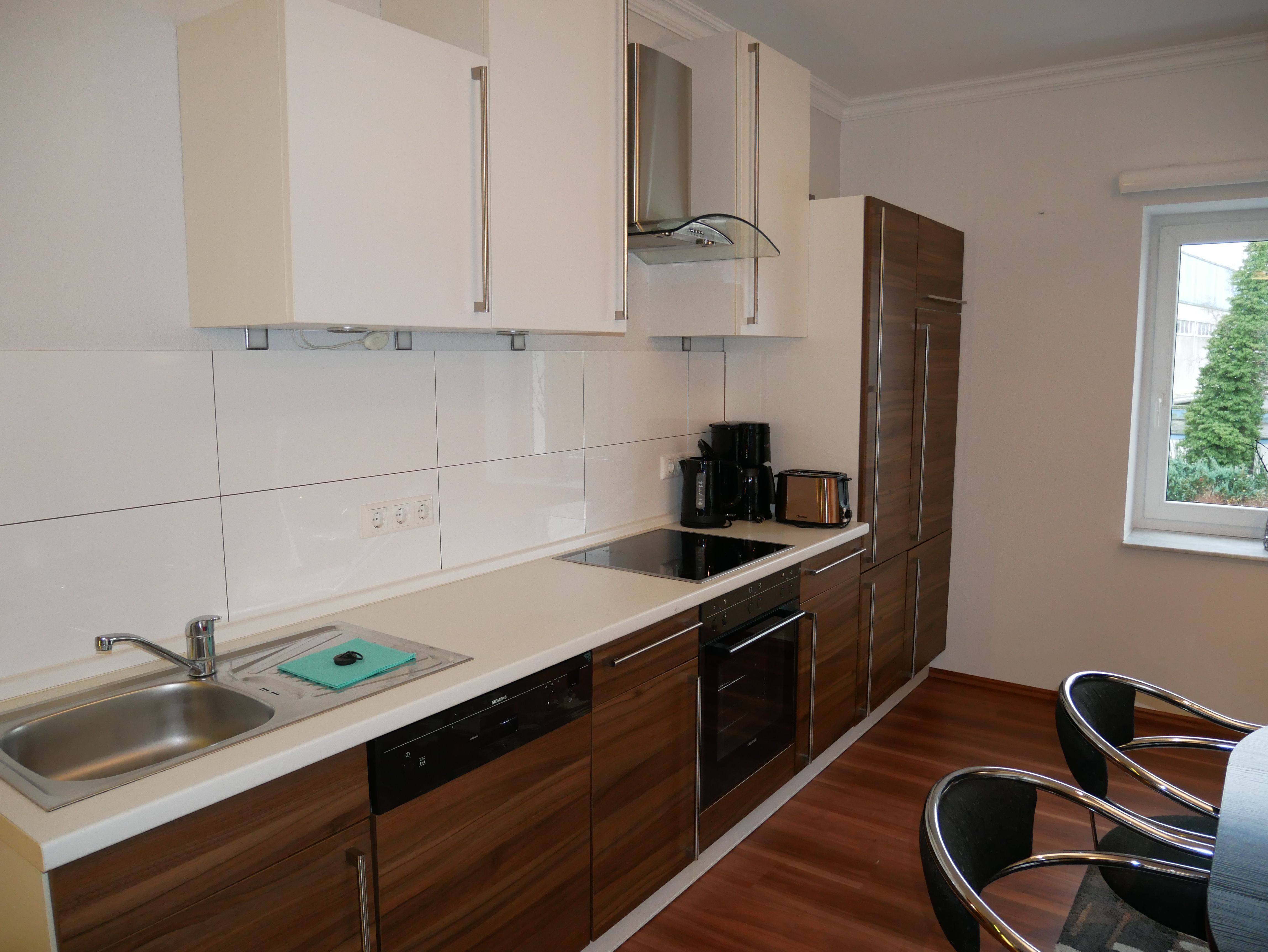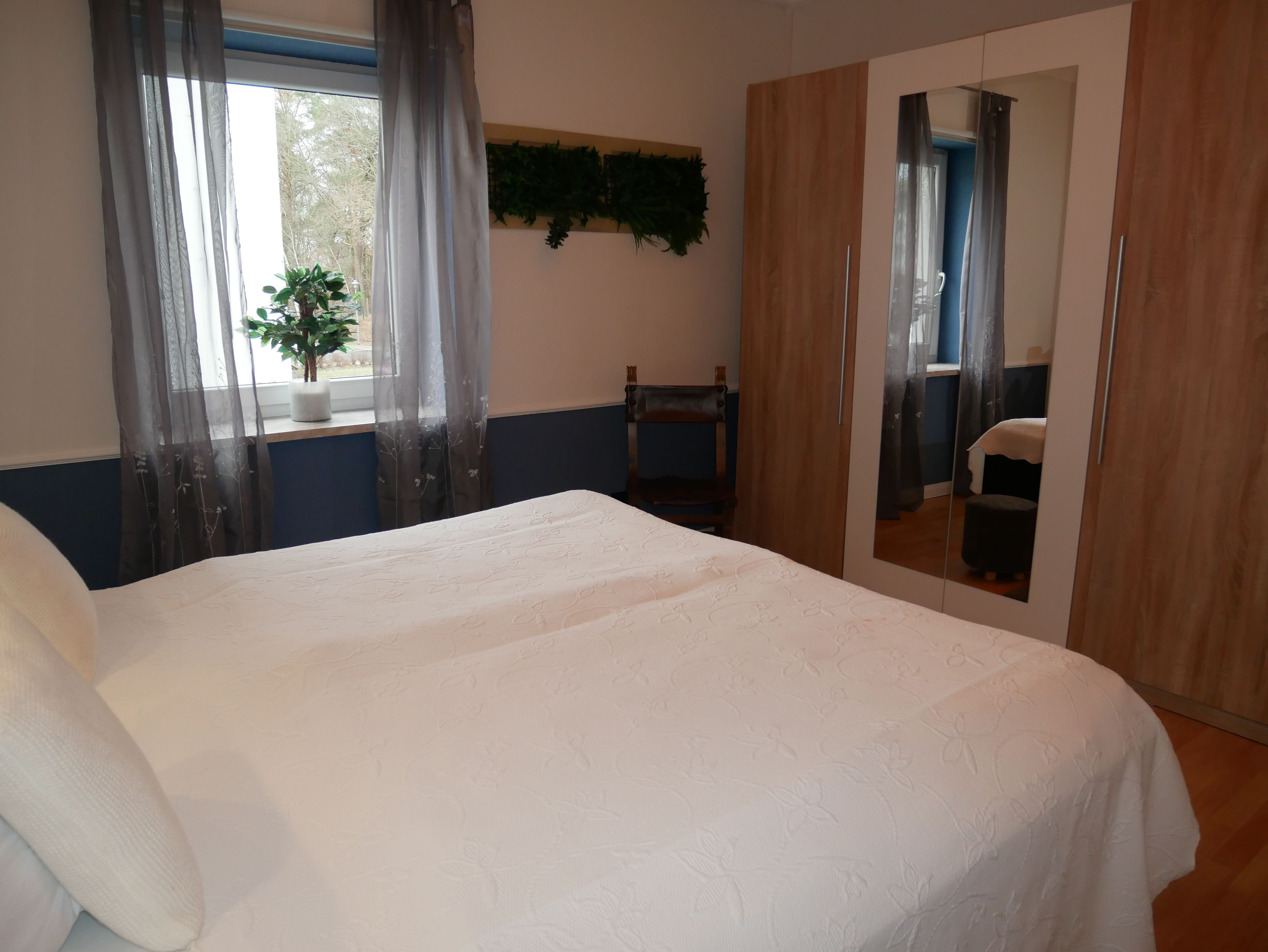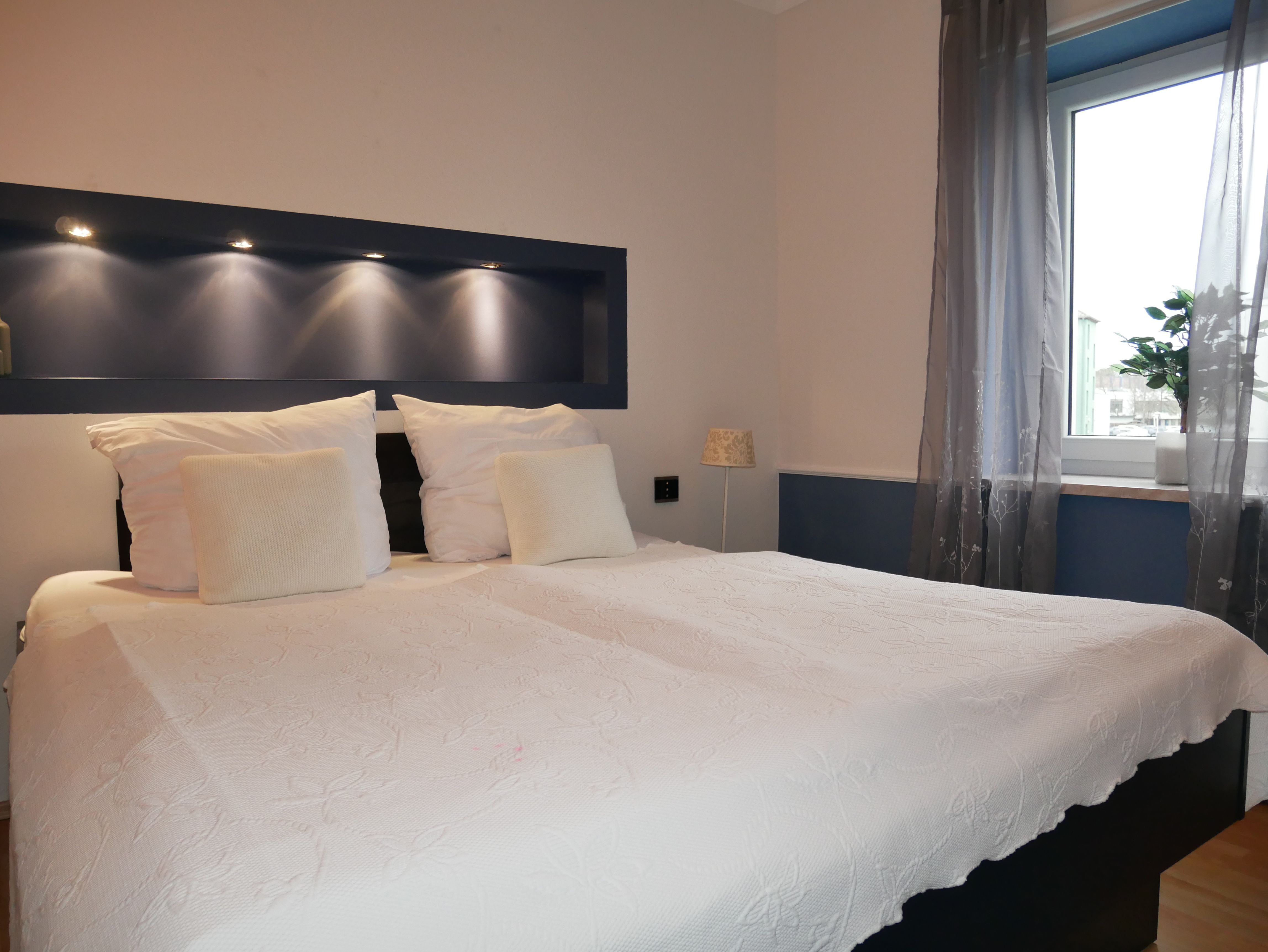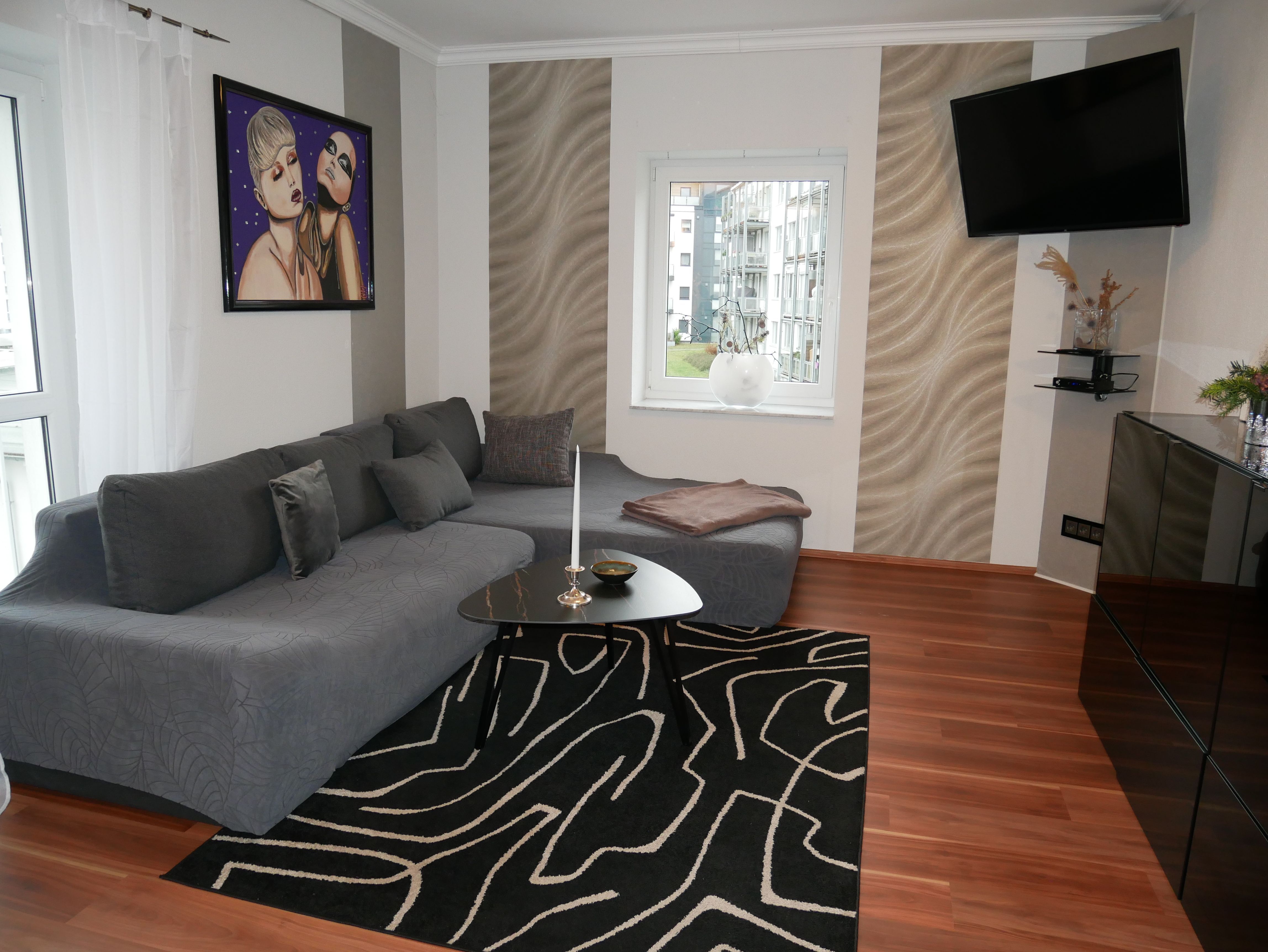 Die großzügige 100m² große 3-Raum-Ferienwohnung befindet sich im ersten Obergeschoss einer Licht- und Designfirma (keine Lärmbelästigung). Die Ferienwohnung ist luxuriös eingerichtet und verfügt über eine moderne Lichtsteuerung. Es gibt ein großes Schlafzimmer mit Doppelbett und ein kleineres Schlafzimmer mit einem schmalen Doppelbett (1,40m), sowie ein getrennt stehendes Einzelbett. Eine große komplett ausgestattete Küche mit Ceranfeld, Backofen, Kühlschrank mit Gefrierfach, Spülmaschine, Mikrowelle, Toaster, Kaffeemaschine, Wasserkocher und einem Essplatz für 6 Personen, fügt sich in das große, freundliche Wohnzimmer mit einem Elektrokamin und einer gemütlichen Ledersitzgarnitur mit Schlafmöglichkeit für die sechste Person ein. Das großzügige, edle Bad ist mit Eckbadewanne, separater Dusche und WC ausgestattet.