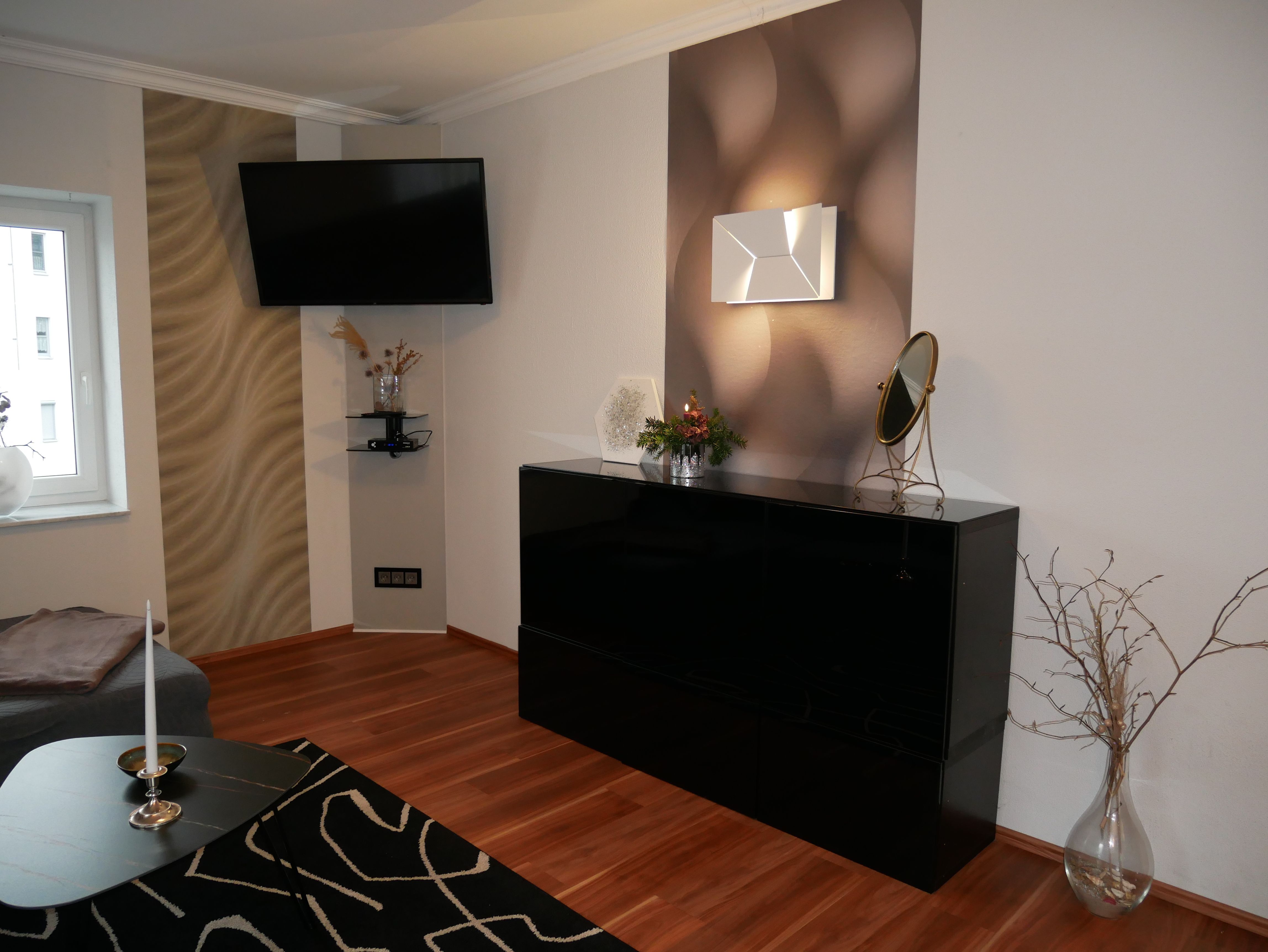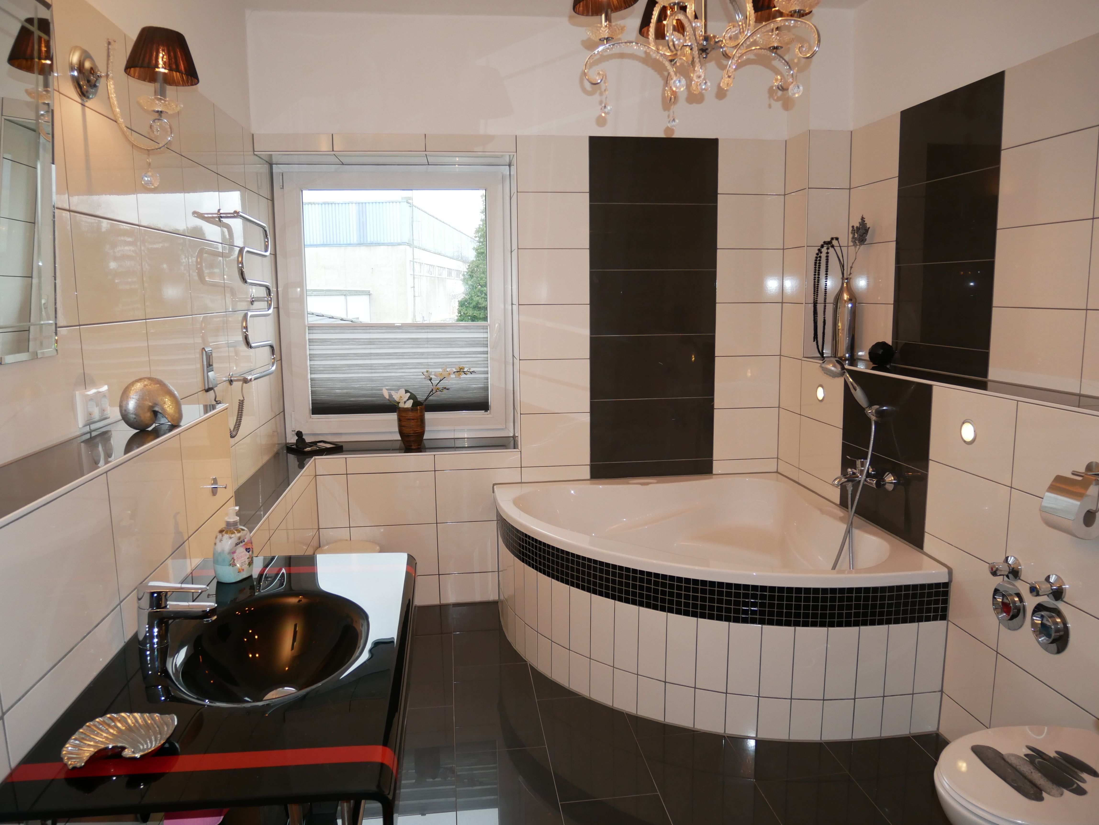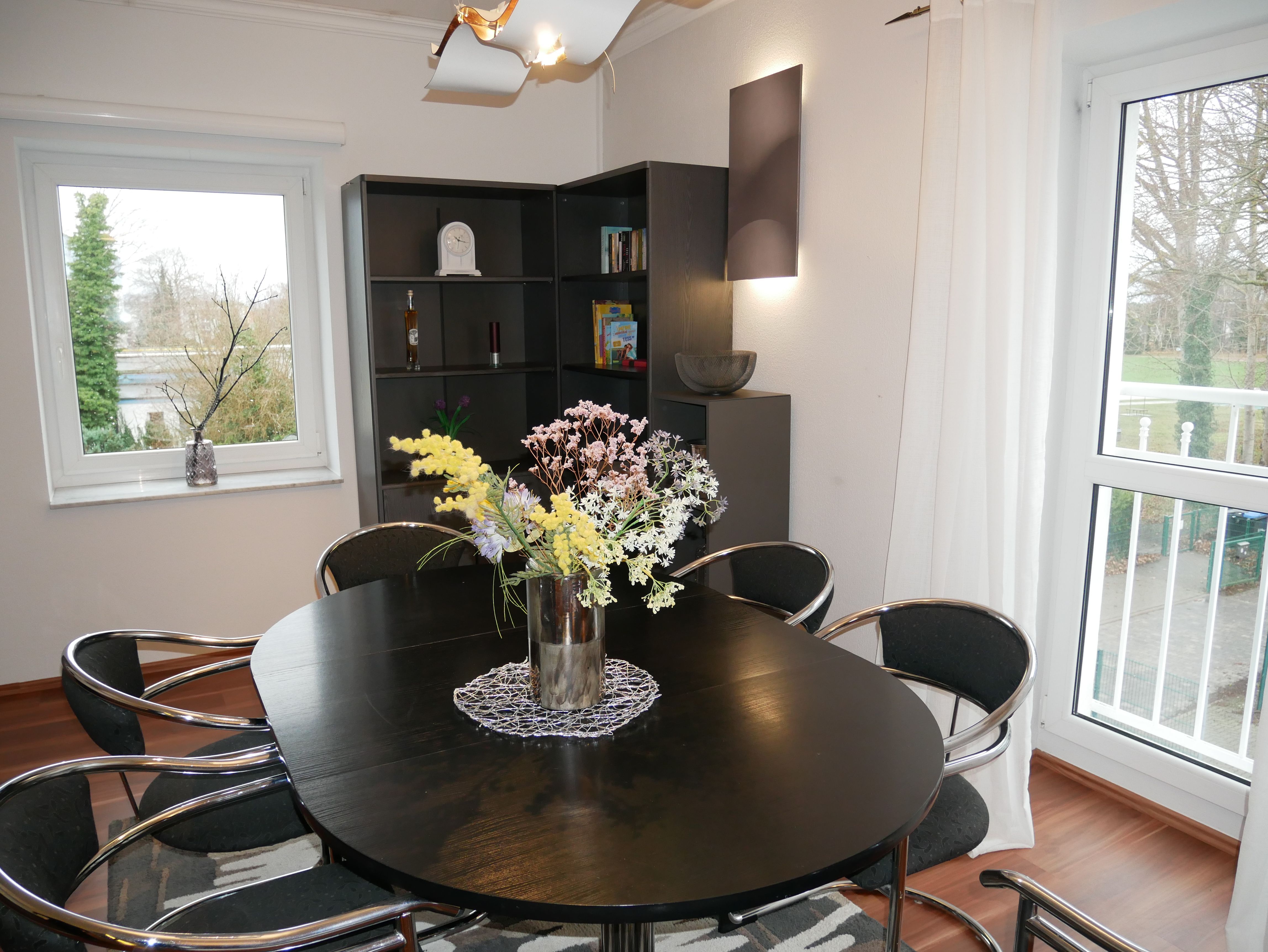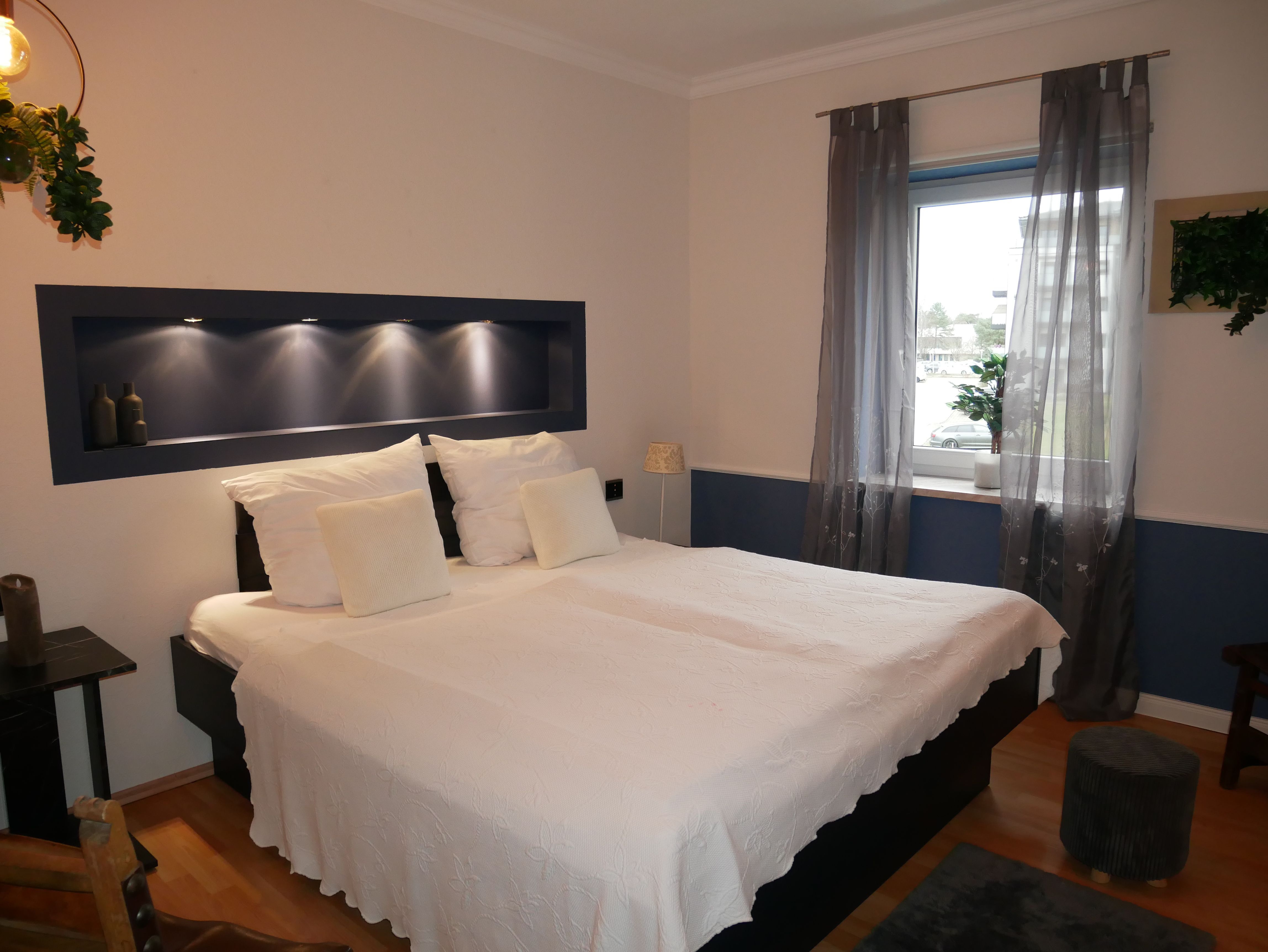 Die großzügige 100m² große 3-Raum-Ferienwohnung befindet sich im ersten Obergeschoss einer Licht- und Designfirma (keine Lärmbelästigung). Die Ferienwohnung ist luxuriös eingerichtet und verfügt über eine moderne Lichtsteuerung. Es gibt ein großes Schlafzimmer mit Doppelbett und ein kleineres Schlafzimmer mit einem schmalen Doppelbett (1,40m), sowie ein getrennt stehendes Einzelbett. Eine große komplett ausgestattete Küche mit Ceranfeld, Backofen, Kühlschrank mit Gefrierfach, Spülmaschine, Mikrowelle, Toaster, Kaffeemaschine, Wasserkocher und einem Essplatz für 6 Personen, fügt sich in das große, freundliche Wohnzimmer mit einem Elektrokamin und einer gemütlichen Ledersitzgarnitur mit Schlafmöglichkeit für die sechste Person ein. Das großzügige, edle Bad ist mit Eckbadewanne, separater Dusche und WC ausgestattet.