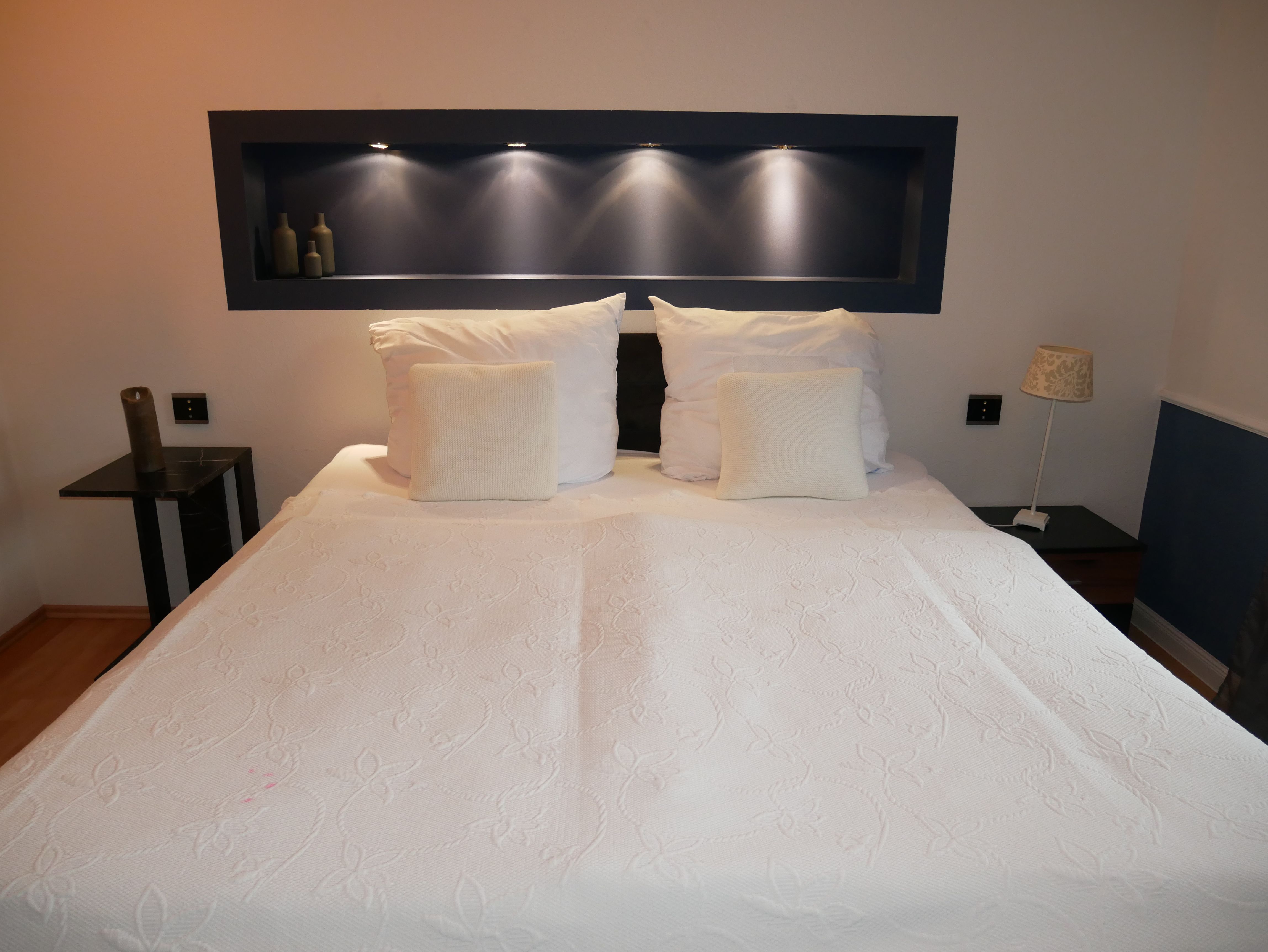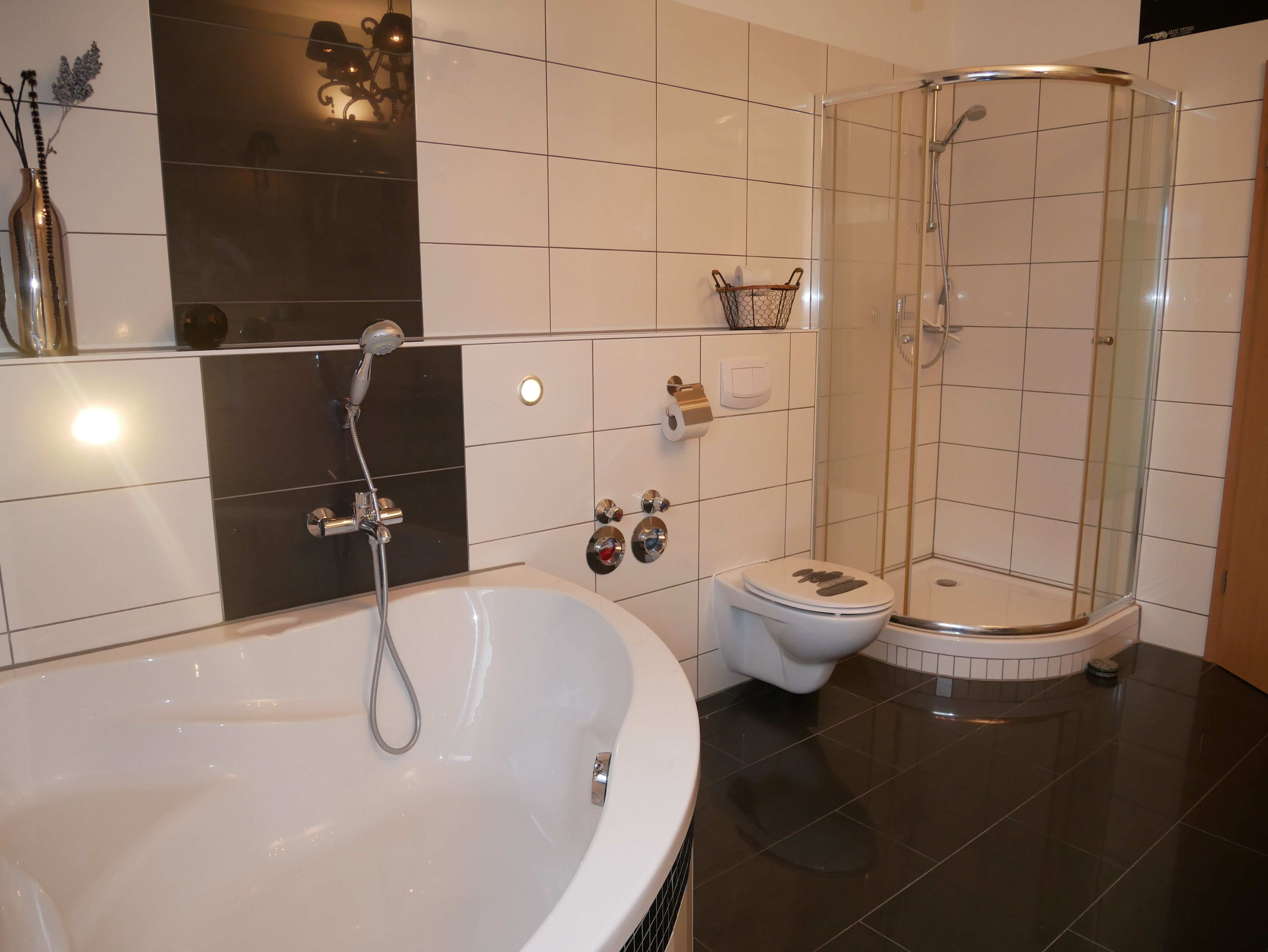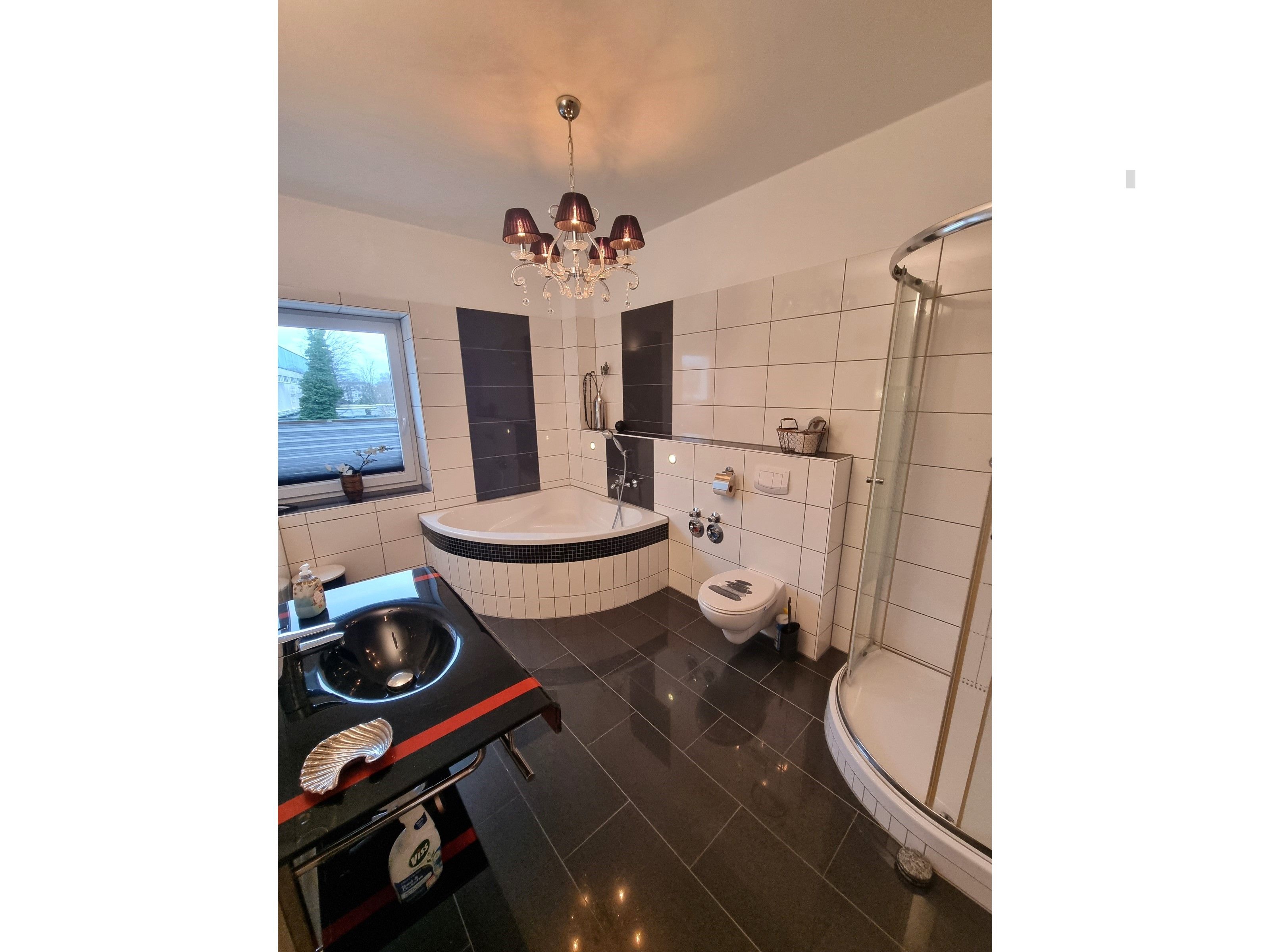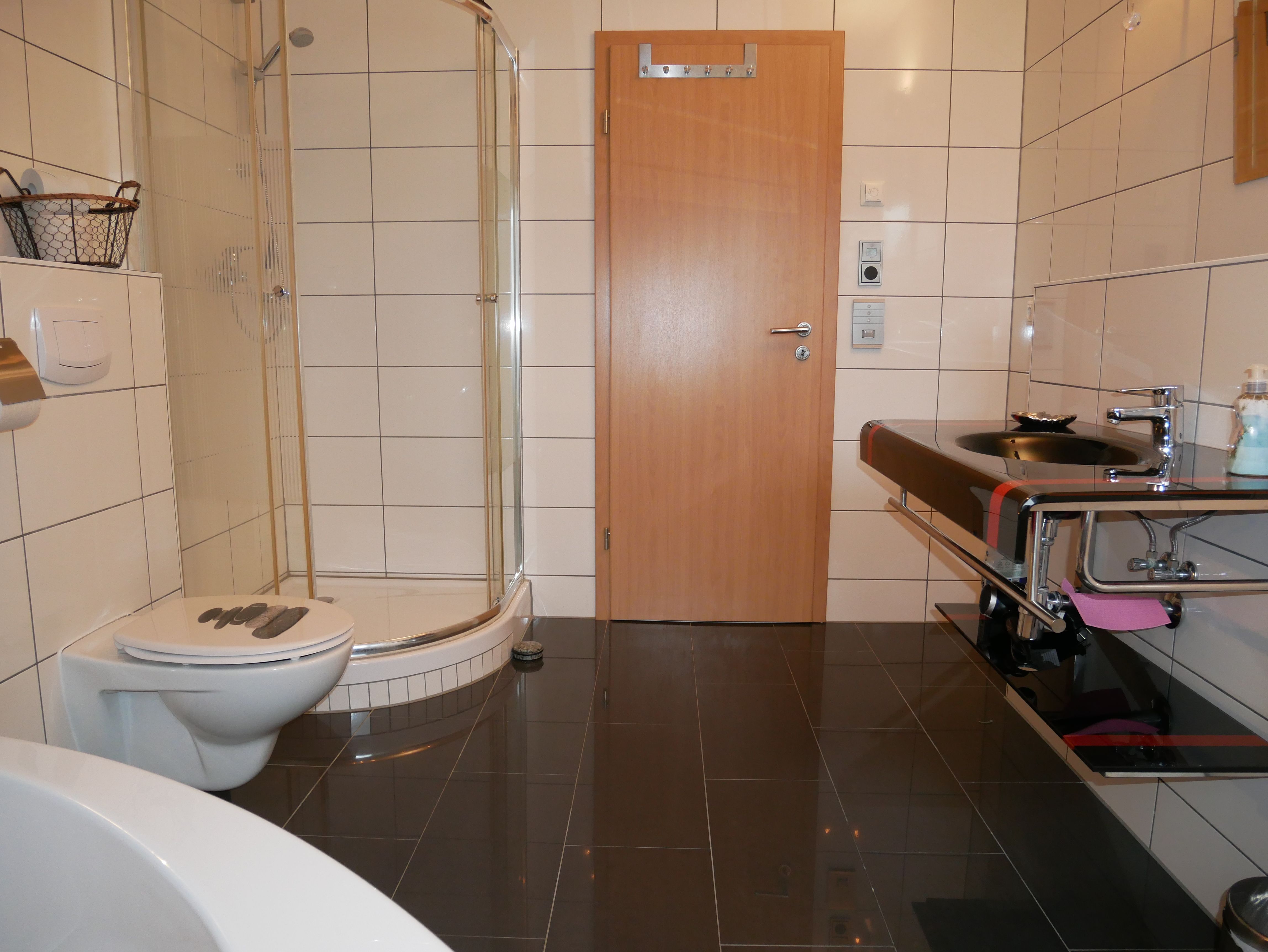 Die großzügige 100m² große 3-Raum-Ferienwohnung befindet sich im ersten Obergeschoss einer Licht- und Designfirma (keine Lärmbelästigung). Die Ferienwohnung ist luxuriös eingerichtet und verfügt über eine moderne Lichtsteuerung. Es gibt ein großes Schlafzimmer mit Doppelbett und ein kleineres Schlafzimmer mit einem schmalen Doppelbett (1,40m), sowie ein getrennt stehendes Einzelbett. Eine große komplett ausgestattete Küche mit Ceranfeld, Backofen, Kühlschrank mit Gefrierfach, Spülmaschine, Mikrowelle, Toaster, Kaffeemaschine, Wasserkocher und einem Essplatz für 6 Personen, fügt sich in das große, freundliche Wohnzimmer mit einem Elektrokamin und einer gemütlichen Ledersitzgarnitur mit Schlafmöglichkeit für die sechste Person ein. Das großzügige, edle Bad ist mit Eckbadewanne, separater Dusche und WC ausgestattet.