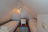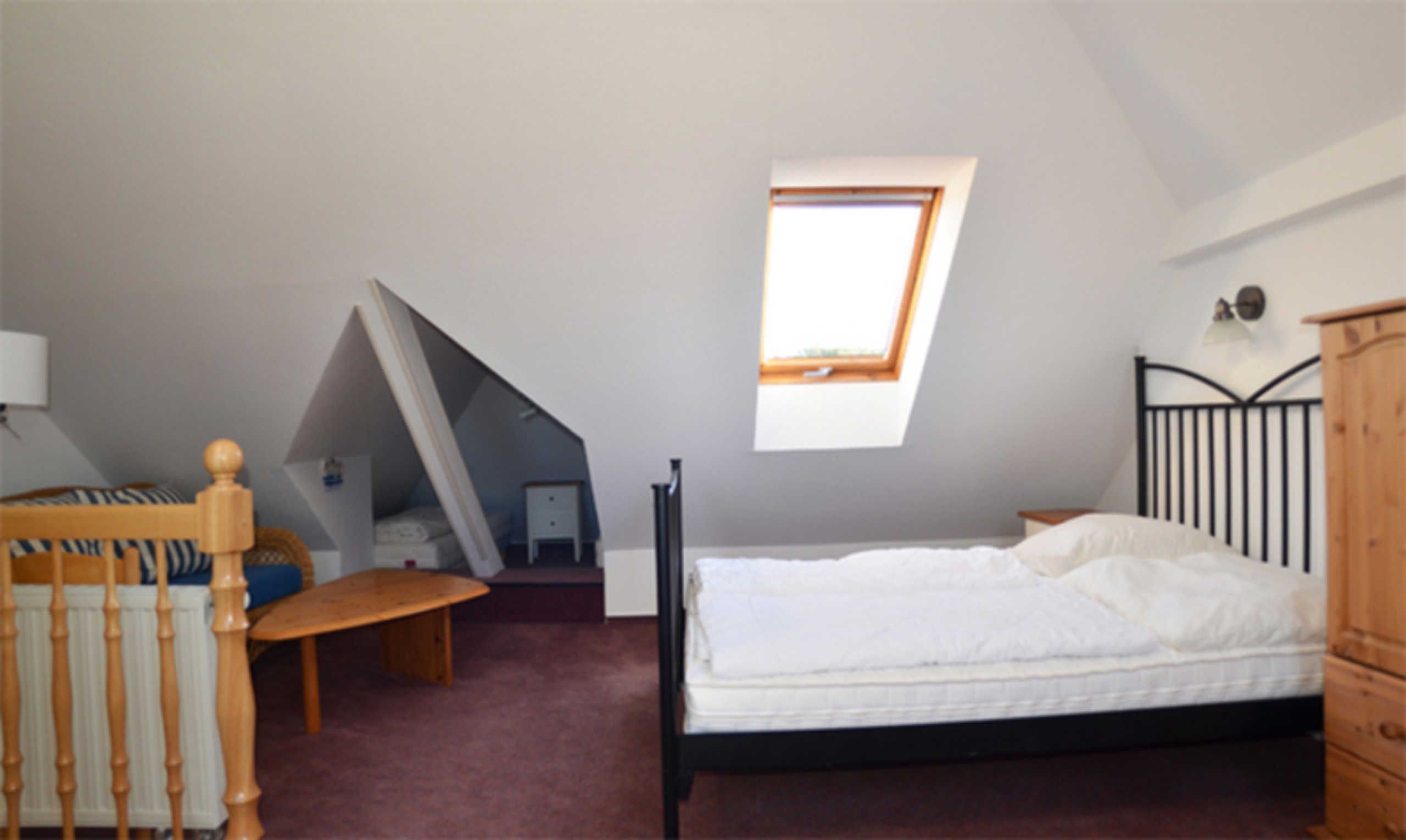 -1 offenes Schlafzimmer mit Doppelbett 140 x 200 cm und 2 Einzelbetten 80 x 200 cm in der Dachgaube