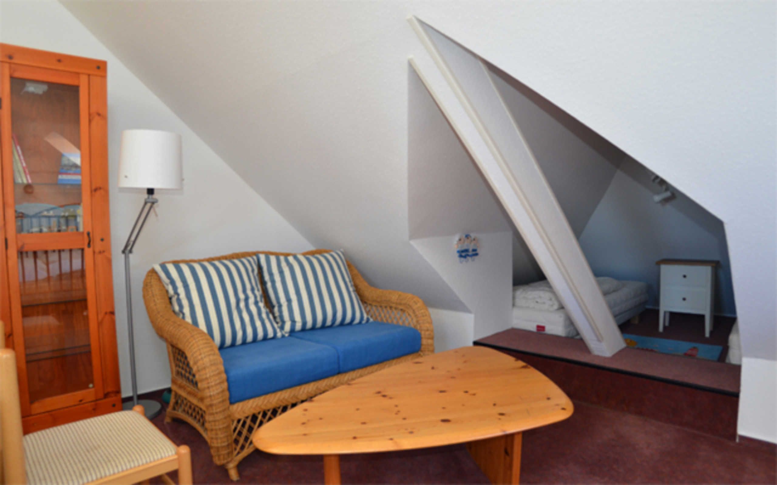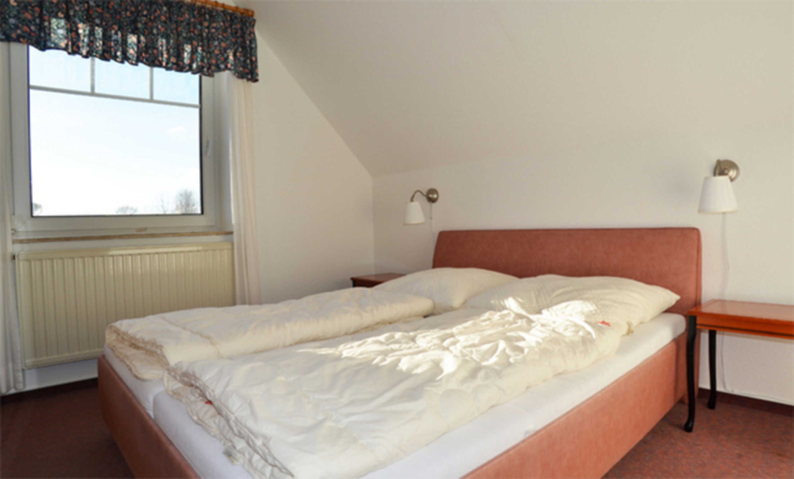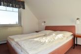 Ein Schlafzimmer mit Doppelbett 2 x 90 x 200 cm befindet sich unteren Geschoss. Das zweite Schlafzimmer befindet sich im Dachgeschoss und ist zur Treppe hin offen. Der Schlafraum ist ausgestattet mit einem Doppelbett 140 x 200 cm und mit 2 Einzelbetten, welche hauptsächlich für Kinder geeignet sind, da sie sich in der Dachgaube befinden. In beiden Schlafzimmern ist Platz für mindestens 1 Baby, das noch im Babybett schläft.
